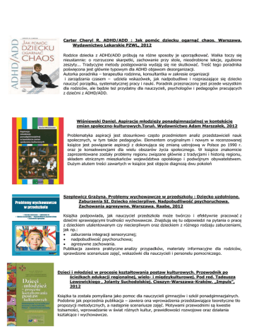 Carter Cheryl R. ADHD/ADD : Jak pomóc dziecku ogarnąć chaos. Warszawa. Wydawnictwo Lekarskie PZWL, 2012 Rodzice dziecka z ADHD/ADD próbują na różne sposoby je uporządkować. Walka toczy się nieustannie: o rozrzucone skarpetki, zachowanie przy stole, nieodrobione lekcje, zgubione zeszyty... Tradycyjne metody postępowania wydają się nie skutkować. Treść tego poradnika poświęcona jest głównie typowym dla ADHD objawom dezorganizacji. Autorka poradnika – terapeutka rodzinna, konsultantka w zakresie organizacji i zarządzania czasem – udziela wskazówek, jak nadpobudliwe i rozpraszające się dziecko nauczyć porządku, systematycznej pracy i nauki. Poradnik przeznaczony jest przede wszystkim dla rodziców, ale będzie też przydatny dla nauczycieli, psychologów i pedagogów pracujących z dziećmi z ADHD/ADD. Wiśniewski Daniel. Aspiracje młodzieży ponadgimnazjalnej w kontekście zmian społeczno-kulturowych.Toruń. Wydawnictwo Adam Marszałek, 2012 Problematyka aspiracji jest stosunkowo często przedmiotem analiz przedstawicieli nauk społecznych, w tym także pedagogów. Elementem oryginalnym i nowym w recenzowanej książce jest powiązanie aspiracji z dokonująca się zmianą ustrojową w Polsce po 1990 r. oraz je konsekwencjami dla wielu obszarów życia społecznego. W książce znakomicie zaprezentowane zostały problemy regionu związane głównie z tradycjami i historią regionu, składem etnicznym mieszkańców województwa opolskiego i podwójnym obywatelstwem. Dużym atutem treści zawartych w książce jest objęcie diagnozą dwu pokoleń Szeplewicz Grażyna. Problemy wychowawcze w przedszkolu : Dziecko uzdolnione. Zaburzenia SI. Dziecko niecierpliwe. Nadpobudliwość psychoruchowa. Zachowania agresywne. Warszawa. Raabe, 2012 Książka podpowiada, jak nauczyciel przedszkola może twórczo i efektywnie pracować z dziećmi sprawiającymi trudności wychowawcze. Znajdują się tu odpowiedzi na pytania o pracę z dzieckiem utalentowanym czy niecierpliwym oraz dzieckiem z różnego rodzaju zaburzeniami, jak np.: zaburzenia integracji sensorycznej; nadpobudliwość psychoruchowa; agresywne zachowania. Publikacja zawiera praktyczne analizy przypadków, materiały informacyjne dla rodziców, sprawdzone scenariusze zajęć, wskazówki dla nauczycieli i personelu pomocniczego. Dzieci i młodzież w procesie kształtowania postaw kulturowych. Przewodnik po ścieżkach edukacji regionalnej, wielo- i międzykulturowej. Pod red. Tadeusza Lewowickiego , Jolanty Suchodolskiej. Cieszyn-Warszawa-Kraków. „Impuls”, 2012 Książka ta została pomyślana jako pomoc dla nauczycieli gimnazjów i szkół ponadgimnazjalnych. Podobnie jak poprzednia publikacja – zawiera ona wprowadzenia przedstawiające teoretyczne tło propozycji metodycznych, a następnie scenariusze zajęć. Motywami przewodnimi są kwestie tożsamości, wprowadzanie w świat różnych kultur, prawidłowości rozwojowe oraz działania kształcące i wychowawcze. Na metodyczną część książki składają się głównie scenariusze zajęć opracowane przez nauczycieli – słuchaczy studiów podyplomowych na Wydziale Etnologii i Nauk o Edukacji UŚ – oraz przez studentów (w części także nauczycieli) kierunku pedagogika na tym wydziale. Scenariusze były poddawane praktycznej weryfikacji i ewaluacji. We wszystkich uwzględniono podobne elementy – poczynając od celów zajęć, poprzez propozycje metod i form zajęć, pomocy dydaktycznych, przebieg zajęć – na (w większości) wykorzystanej literaturze kończąc. Do wielu scenariuszy dołączono wzory zabaw, gier i innych pomocy. Trempała Janusz .Psychologia rozwoju człowieka. Warszawa. Wydawnictwo Naukowe PWN, 2012 Nowoczesny podręcznik do psychologii rozwojowej przedstawiający: teoretyczne podstawy studiów nad rozwojem i ewolucją dyscypliny, klasyczne badania i teorie, które wywarty istotny wpływ na kształt współczesnej psychologii rozwoju człowieka, obecny stan i perspektywy przyszłych badań, najnowsze koncepcje, problemy i wyniki badań pozwalające zrozumieć zmiany w zachowaniu człowieka w ciągu życia, zagadnienia stosowanej psychologii rozwojowej oraz zastosowania wiedzy o rozwoju w wybranych obszarach praktyki społecznej, rozwiązania dydaktyczne przydatne w samodzielnej pracy studenta: bloki rozszerzające, podsumowania rozdziałów, słowa kluczowe, zadania kontrolne, słownik pojęć, dodatkowe lektury. Podręcznik jest obszernym kompendium współczesnej wiedzy psychologicznej dotyczącej rozwoju człowieka. Obejmuje historyczne, teoretyczne i metodologiczne podstawy rozumienia psychicznego rozwoju oraz szczegółową charakterystykę poszczególnych okresów życia. Ponadto przedstawiono ważne zagadnienia stosowanej psychologii rozwojowej - w edukacji, opiece psychologicznej oraz w psychologicznej diagnostyce i terapii. Bider Katarzyna. Przykładowe prace plastyczno-techniczne dla uczniów I etapu kształcenia część 1 z płytą CD. Kraków. „Impuls”, 2010 Publikacja jest dodatkową propozycją dla nauczycieli I etapu kształcenia zintegrowanego. Zamieszczone tu wybrane prace plastyczno-techniczne i techniczno-plastyczne, wraz z opisami technik wykonywania, odnoszą się do świata przyrody, do czterech pór roku i mogą być wykorzystane podczas zajęć w klasie pierwszej. Opisy prezentowanych publikacji opracowano na podstawie zasobów Internetu.