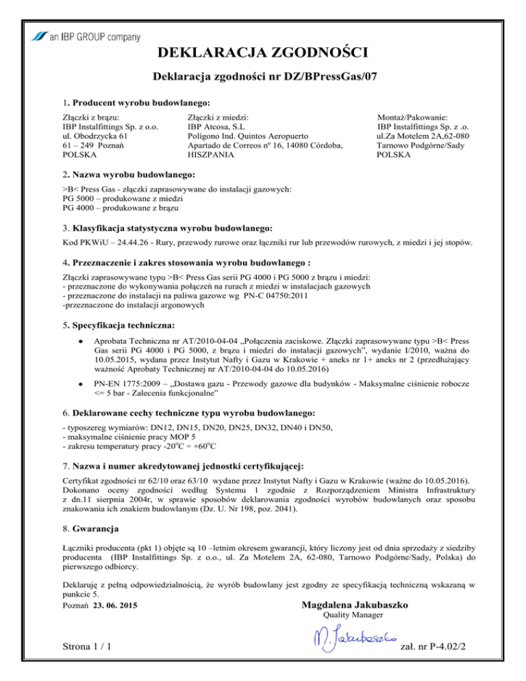 DEKLARACJA ZGODNOŚCI Deklaracja zgodności nr DZ/BPressGas/07 1. Producent wyrobu budowlanego: Złączki z brązu: IBP Instalfittings Sp. z o.o. ul. Obodrzycka 61 61 – 249 Poznań POLSKA Złączki z miedzi: IBP Atcosa, S.L Polígono Ind. Quintos Aeropuerto Apartado de Correos nº 16, 14080 Córdoba, HISZPANIA Montaż/Pakowanie: IBP Instalfittings Sp. z .o. ul.Za Motelem 2A,62-080 Tarnowo Podgórne/Sady POLSKA 2. Nazwa wyrobu budowlanego: >B< Press Gas - złączki zaprasowywane do instalacji gazowych: PG 5000 – produkowane z miedzi PG 4000 – produkowane z brązu 3. Klasyfikacja statystyczna wyrobu budowlanego: Kod PKWiU – 24.44.26 - Rury, przewody rurowe oraz łączniki rur lub przewodów rurowych, z miedzi i jej stopów. 4. Przeznaczenie i zakres stosowania wyrobu budowlanego : Złączki zaprasowywane typu >B< Press Gas serii PG 4000 i PG 5000 z brązu i miedzi: - przeznaczone do wykonywania połączeń na rurach z miedzi w instalacjach gazowych - przeznaczone do instalacji na paliwa gazowe wg PN-C 04750:2011 -przeznaczone do instalacji argonowych 5. Specyfikacja techniczna: Aprobata Techniczna nr AT/2010-04-04 „Połączenia zaciskowe. Złączki zaprasowywane typu >B< Press Gas serii PG 4000 i PG 5000, z brązu i miedzi do instalacji gazowych”, wydanie I/2010, ważna do 10.05.2015, wydana przez Instytut Nafty i Gazu w Krakowie + aneks nr 1+ aneks nr 2 (przedłużający ważność Aprobaty Technicznej nr AT/2010-04-04 do 10.05.2016) PN-EN 1775:2009 – „Dostawa gazu - Przewody gazowe dla budynków - Maksymalne ciśnienie robocze <= 5 bar - Zalecenia funkcjonalne” 6. Deklarowane cechy techniczne typu wyrobu budowlanego: - typoszereg wymiarów: DN12, DN15, DN20, DN25, DN32, DN40 i DN50, - maksymalne ciśnienie pracy MOP 5 - zakresu temperatury pracy -20oC ÷ +60oC 7. Nazwa i numer akredytowanej jednostki certyfikującej: Certyfikat zgodności nr 62/10 oraz 63/10 wydane przez Instytut Nafty i Gazu w Krakowie (ważne do 10.05.2016). Dokonano oceny zgodności według Systemu 1 zgodnie z Rozporządzeniem Ministra Infrastruktury z dn.11 sierpnia 2004r, w sprawie sposobów deklarowania zgodności wyrobów budowlanych oraz sposobu znakowania ich znakiem budowlanym (Dz. U. Nr 198, poz. 2041). 8. Gwarancja Łączniki producenta (pkt 1) objęte są 10 –letnim okresem gwarancji, który liczony jest od dnia sprzedaży z siedziby producenta (IBP Instalfittings Sp. z o.o., ul. Za Motelem 2A, 62-080, Tarnowo Podgórne/Sady, Polska) do pierwszego odbiorcy. Deklaruję z pełną odpowiedzialnością, że wyrób budowlany jest zgodny ze specyfikacją techniczną wskazaną w punkcie 5. Poznań 23. 06. 2015 Magdalena Jakubaszko Quality Manager Strona 1 / 1 zał. nr P-4.02/2
