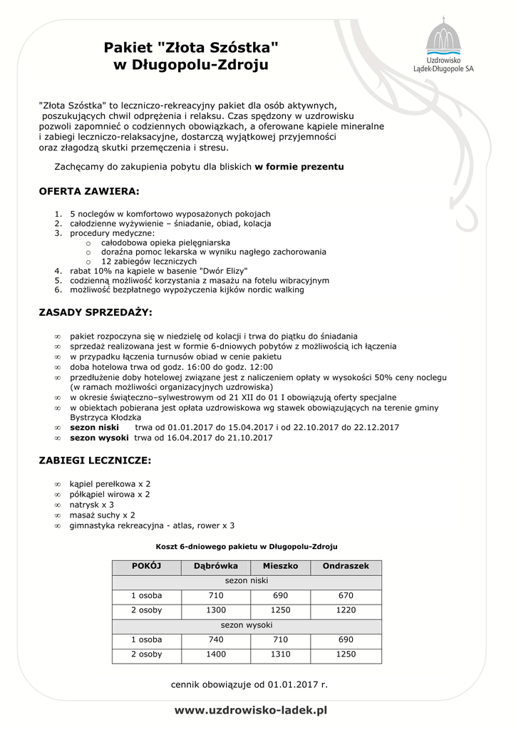 Pakiet "Złota Szóstka" w Długopolu-Zdroju "Złota Szóstka" to leczniczo-rekreacyjny pakiet dla osób aktywnych, poszukujących chwil odprężenia i relaksu. Czas spędzony w uzdrowisku pozwoli zapomnieć o codziennych obowiązkach, a oferowane kąpiele mineralne i zabiegi leczniczo-relaksacyjne, dostarczą wyjątkowej przyjemności oraz złagodzą skutki przemęczenia i stresu. Zachęcamy do zakupienia pobytu dla bliskich w formie prezentu OFERTA ZAWIERA: 1. 5 noclegów w komfortowo wyposażonych pokojach 2. całodzienne wyżywienie – śniadanie, obiad, kolacja 3. procedury medyczne: o całodobowa opieka pielęgniarska o doraźna pomoc lekarska w wyniku nagłego zachorowania o 12 zabiegów leczniczych 4. rabat 10% na kąpiele w basenie "Dwór Elizy" 5. codzienną możliwość korzystania z masażu na fotelu wibracyjnym 6. możliwość bezpłatnego wypożyczenia kijków nordic walking ZASADY SPRZEDAŻY: • • • • • • • • • pakiet rozpoczyna się w niedzielę od kolacji i trwa do piątku do śniadania sprzedaż realizowana jest w formie 6-dniowych pobytów z możliwością ich łączenia w przypadku łączenia turnusów obiad w cenie pakietu doba hotelowa trwa od godz. 16:00 do godz. 12:00 przedłużenie doby hotelowej związane jest z naliczeniem opłaty w wysokości 50% ceny noclegu (w ramach możliwości organizacyjnych uzdrowiska) w okresie świąteczno–sylwestrowym od 21 XII do 01 I obowiązują oferty specjalne w obiektach pobierana jest opłata uzdrowiskowa wg stawek obowiązujących na terenie gminy Bystrzyca Kłodzka sezon niski trwa od 01.01.2017 do 15.04.2017 i od 22.10.2017 do 22.12.2017 sezon wysoki trwa od 16.04.2017 do 21.10.2017 ZABIEGI LECZNICZE: • • • • • kąpiel perełkowa x 2 półkąpiel wirowa x 2 natrysk x 3 masaż suchy x 2 gimnastyka rekreacyjna - atlas, rower x 3 Koszt 6-dniowego pakietu w Długopolu-Zdroju POKÓJ Dąbrówka Mieszko Ondraszek sezon niski 1 osoba 710 690 670 2 osoby 1300 1250 1220 sezon wysoki 1 osoba 740 710 690 2 osoby 1400 1310 1250 cennik obowiązuje od 01.01.2017 r.