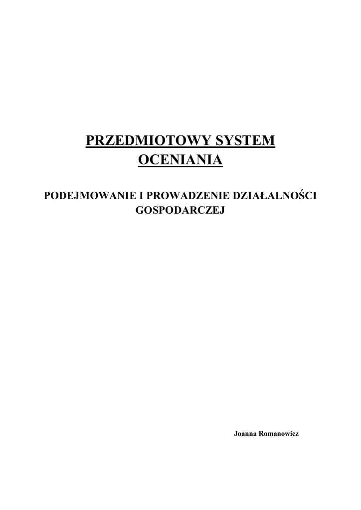 PRZEDMIOTOWY SYSTEM OCENIANIA PODEJMOWANIE I PROWADZENIE DZIAŁALNOŚCI GOSPODARCZEJ Joanna Romanowicz PRZEDMIOTOWY SYSTEM OCENIANIA - PODEJMOWANIE I PROWADZENIE DZIAŁALNOŚCI GOSPODARCZEJ 1. • • • • • • Na lekcjach z przedmiotów zawodowych oceniane są następujące obszary: postępy w nauce wynikające z wkładu pracy ucznia, współpraca ucznia z innymi uczniami, aktywność ucznia na zajęciach lekcyjnych, sprawność ucznia w rozwiązywaniu problemów, aktywność ucznia w realizacji zadań poza szkołą (np. konkursy, olimpiady), obowiązkowość ucznia i odpowiedzialność za przyjęte zadania. 2. Wymagania edukacyjne niezbędne do uzyskania poszczególnych ocen semestralnych i rocznych z zajęć lekcyjnych: 1. konieczne – (dopuszczający) – wiedza i umiejętności najbardziej niezbędne, pozwalające proste zadania z życia codziennego, absolutnie konieczne wykonać do kontynuowania dalszej nauki, 2. podstawowe – (dostateczny) – najbardziej przystępne elementy treści nauczania, najprostsze i najbardziej uniwersalne, najpewniejsze naukowo, niezbędne na danym i na wyższych etapach kształcenia, bezpośrednio użyteczne w pozaszkolnej działalności ucznia, 3. rozszerzające – (dobry) – umiarkowanie przystępne elementy treści, bardziej złożone i mniej typowe, w pewnym stopniu hipotetyczne, sprawdzające umiejętność myślenia przyczynowoskutkowego, przydatne na danym i na wyższych etapach kształcenia, pośrednio użyteczne w pozaszkolnych działaniach ucznia, 4. dopełniające – (bardzo dobry) – trudne do opanowania elementy treści najbardziej złożone i unikalne, twórcze i oryginalne naukowo, odległe od bezpośredniej i pozaszkolnej działalności ucznia i słuchacza, 5. ponadprogramowe – (celujący) – treści programowe, wyspecjalizowane ponad potrzeby głównego kierunku nauki. 3. Zasady oceniania uczniów: 1. Ocenie podlegają: • prace klasowe – 1 lub 2 godzinna forma pracy ucznia, dotycząca większej liczby działów treści edukacyjnych, • sprawdziany - forma pracy ucznia dotycząca większej niż 3 jednostki lekcyjne, • kartkówki- trwające do 20 minut i obejmujące nie więcej niż 3 jednostki lekcyjne, • odpowiedzi ustne - obejmują nie więcej niż 3 jednostki lekcyjne, • ćwiczenia - samodzielna praca ucznia w zeszycie ćwiczeń, zeszycie przedmiotowym lub w karcie pracy, • praca domowa • projekty edukacyjne indywidualne lub zespołowe • praca w grupach • aktywność na lekcji 2. Oceny są jawne. Na prośbę ucznia lub rodzica nauczyciel przedstawia wyjaśnienia do wystawionej oceny. 3. Sprawdziany/prace klasowe są obowiązkowe. Gdy uczeń jest nieobecny na sprawdzianie nauczyciel wpisuje do dziennika: nb., /, - . 4. Nauczyciel informuje uczniów o planowanym sprawdzianie lub pracy klasowej najpóźniej tydzień przed jego terminem i potwierdza fakt zamieszczeniem adnotacji w dzienniku lekcyjnym/elektronicznym lub terminarzu w dzienniku elektronicznym. 5. Jeżeli z przyczyn losowych uczeń nie może pisać sprawdzianu/pracy klasowej w terminie ustalonym dla całej klasy, powinien uczynić to w terminie do dwóch tygodni po powrocie do szkoły. W przypadku odmowy pisania sprawdzianu w tym terminie uczeń otrzymuje ocenę niedostateczną. Ocena podlega procedurze poprawy: w przypadku dłuższej (powyżej 3 tygodni) usprawiedliwionej nieobecności ucznia, nauczyciel ustala termin i sposób wsparcia podczas uzupełniania zaległości. w przypadku krótkiej, np. krótszej niż tydzień nieobecności ucznia, podczas której odbył się sprawdzian/praca klasowa uczeń ma obowiązek zaliczyć sprawdzian w najbliższym wskazanym przez nauczyciela terminie. 6. W przypadku nieusprawiedliwionej nieobecności na sprawdzianie, pracy klasowej, uczniowi przysługuje jeden termin zaliczenia sprawdzianu/ pracy klasowej. 7. Uczeń, któremu udowodniono pisanie pracy w sposób niesamodzielny otrzymuje ocenę niedostateczną. Ocena podlega procedurze poprawy. 8. Poprawa sprawdzianów/prac klasowych jest dobrowolna i dotyczy każdej oceny, która nie satysfakcjonuje ucznia. Musi odbyć się w ciągu 2 tygodni od daty oddania prac pisemnych przez nauczyciela. Uczeń poprawia ocenę tylko raz. Pod uwagę brane są obie oceny. 9. Uczeń chcący poprawić niesatysfakcjonującą go ocenę z pracy klasowej, po uprzednim omówieniu wszystkich popełnionych błędów na pracy klasowej, ustala wraz z nauczycielem termin oraz formę poprawy. 10. Nauczyciel stwarza jednakowe warunki poprawy dla wszystkich uczniów zaliczających sprawdzian/pracę klasową w tym samym czasie. 11. Sprawdzanie prac pisemnych odbywa się w ciągu 12 dni nauki w szkole. 12. W przypadku przekroczenia terminu oddania prac, nauczyciel nie może wpisać oceny niesatysfakcjonujących ucznia. Prace pisemne są przechowywane na terenie szkoły do końca roku szkolnego. 13. Sprawdzone i ocenione prace klasowe nauczyciel przedstawia uczniom na lekcji i omawia błędy. Uczeń nie otrzymuje prac klasowych do domu, gdyż przechowuje je nauczyciel. Na prośbę rodziców nauczyciel umożliwia wgląd w pracę i uzasadnia ocenę. 14. Z jednej pracy pisemnej może być wystawiona tylko jedna ocena. 15. Ocenę można poprawić wyłącznie z zapowiedzianych wcześniej sprawdzianów i prac klasowych. Nie ma możliwości poprawienia ocen z innych form aktywności (np. z odpowiedzi, pracy domowej, itp.). 16. Odpowiedzi ustne ucznia i bieżące prace pisemne (np. kartkówka) obejmują wiadomości i umiejętności niezbędne dla realizacji danego tematu. Nie muszą być zapowiadane. 17. Nauczyciel w ciągu jednego semestru powinien wystawić każdemu uczniowi co najmniej tyle ocen cząstkowych, ile wynosi tygodniowa liczba godzin realizowania danego przedmiotu + 1. Wymagania te nie dotyczą II semestru klasy programowo najwyższej. 18. Uczeń ma prawo zgłosić nieprzygotowanie do lekcji 2 razy w semestrze bez ponoszenia konsekwencji. W przypadku, gdy zajęcia lekcyjne odbywaj