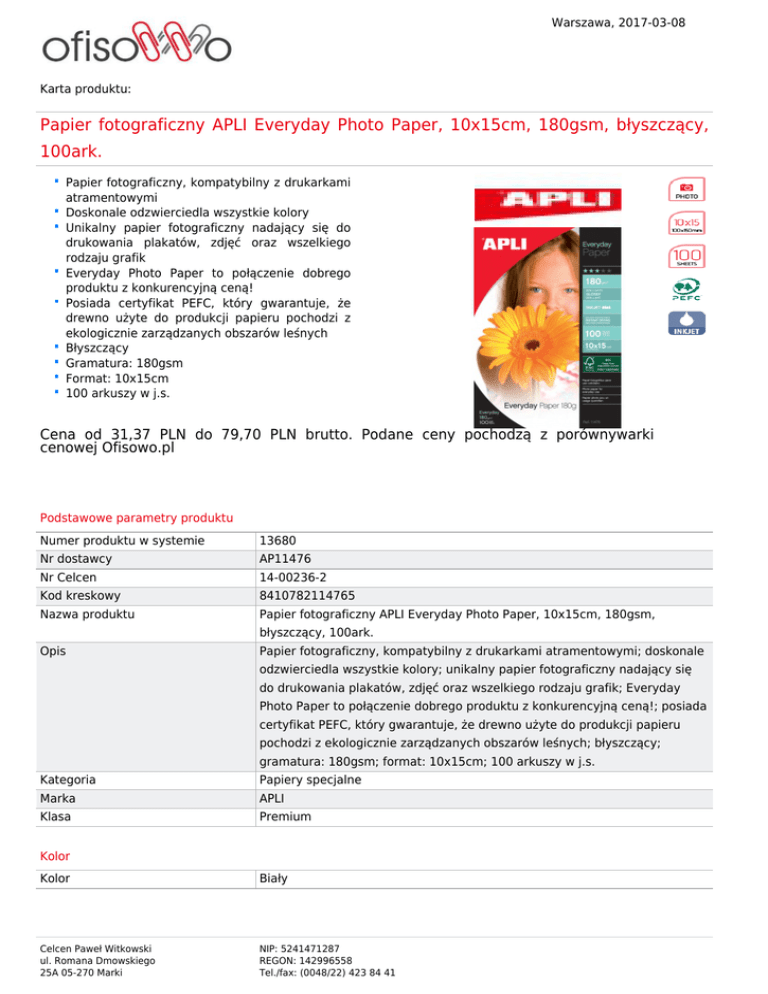 Warszawa, 2017-03-08 Karta produktu: Papier fotograficzny APLI Everyday Photo Paper, 10x15cm, 180gsm, błyszczący, 100ark. Papier fotograficzny, kompatybilny z drukarkami atramentowymi Doskonale odzwierciedla wszystkie kolory Unikalny papier fotograficzny nadający się do drukowania plakatów, zdjęć oraz wszelkiego rodzaju grafik Everyday Photo Paper to połączenie dobrego produktu z konkurencyjną ceną! Posiada certyfikat PEFC, który gwarantuje, że drewno użyte do produkcji papieru pochodzi z ekologicznie zarządzanych obszarów leśnych Błyszczący Gramatura: 180gsm Format: 10x15cm 100 arkuszy w j.s. Cena od 31,37 PLN do 79,70 PLN brutto. Podane ceny pochodzą z porównywarki cenowej Ofisowo.pl Podstawowe parametry produktu Numer produktu w systemie 13680 Nr dostawcy AP11476 Nr Celcen 14-00236-2 Kod kreskowy 8410782114765 Nazwa produktu Papier fotograficzny APLI Everyday Photo Paper, 10x15cm, 180gsm, błyszczący, 100ark. Opis Papier fotograficzny, kompatybilny z drukarkami atramentowymi; doskonale odzwierciedla wszystkie kolory; unikalny papier fotograficzny nadający się do drukowania plakatów, zdjęć oraz wszelkiego rodzaju grafik; Everyday Photo Paper to połączenie dobrego produktu z konkurencyjną ceną!; posiada certyfikat PEFC, który gwarantuje, że drewno użyte do produkcji papieru pochodzi z ekologicznie zarządzanych obszarów leśnych; błyszczący; gramatura: 180gsm; format: 10x15cm; 100 arkuszy w j.s. Kategoria Papiery specjalne Marka APLI Klasa Premium Kolor Kolor Biały Celcen Paweł Witkowski ul. Romana Dmowskiego 25A 05-270 Marki NIP: 5241471287 REGON: 142996558 Tel./fax: (0048/22) 423 84 41 Warszawa, 2017-03-08 Karta katalogowa produktu cd. Papier fotograficzny APLI Everyday Photo Paper, 10x15cm, 180gsm, błyszczący, 100ark. Cecha W ofercie od 2013-01 Materiał Papier Produkt Papier fotograficzny Rodzaj Foto everyday Typ Inkjet Wymiary Wymiary (mm) 10x15 Format 10x15 Format 10x15 Gramatura (g/m2) 180 Ilość Ilość arkuszy 100 Certyfikaty Hit Standard Ilość lat gwarancji 1 Nowy produkt w ofercie Standard Wspólny słownik zamówień CPV 30197644-2 Serdecznie zapraszamy do współpracy zespół. Ofisowo.pl Celcen Paweł Witkowski ul. Romana Dmowskiego 25A 05-270 Marki NIP: 5241471287 REGON: 142996558 Tel./fax: (0048/22) 423 84 41