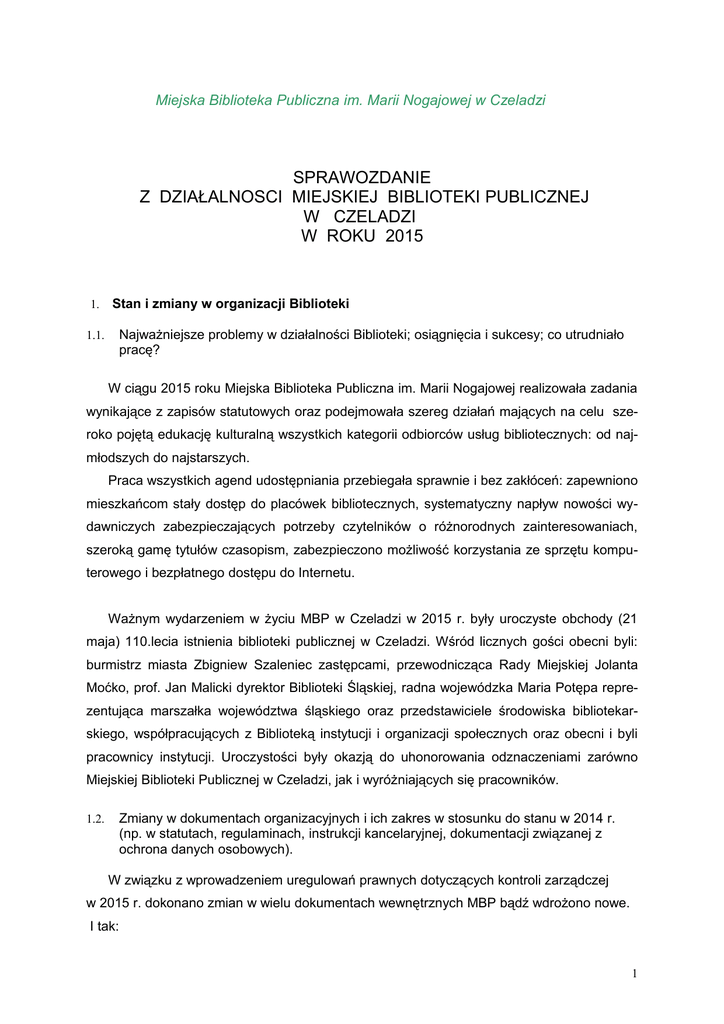 Miejska Biblioteka Publiczna im. Marii Nogajowej w Czeladzi SPRAWOZDANIE Z DZIAŁALNOSCI MIEJSKIEJ BIBLIOTEKI PUBLICZNEJ W CZELADZI W ROKU 2015 1. Stan i zmiany w organizacji Biblioteki Najważniejsze problemy w działalności Biblioteki; osiągnięcia i sukcesy; co utrudniało pracę? 1.1. W ciągu 2015 roku Miejska Biblioteka Publiczna im. Marii Nogajowej realizowała zadania wynikające z zapisów statutowych oraz podejmowała szereg działań mających na celu szeroko pojętą edukację kulturalną wszystkich kategorii odbiorców usług bibliotecznych: od najmłodszych do najstarszych. Praca wszystkich agend udostępniania przebiegała sprawnie i bez zakłóceń: zapewniono mieszkańcom stały dostęp do placówek bibliotecznych, systematyczny napływ nowości wydawniczych zabezpieczających potrzeby czytelników o różnorodnych zainteresowaniach, szeroką gamę tytułów czasopism, zabezpieczono możliwość korzystania ze sprzętu komputerowego i bezpłatnego dostępu do Internetu. Ważnym wydarzeniem w życiu MBP w Czeladzi w 2015 r. były uroczyste obchody (21 maja) 110.lecia istnienia biblioteki publicznej w Czeladzi. Wśród licznych gości obecni byli: burmistrz miasta Zbigniew Szaleniec zastępcami, przewodnicząca Rady Miejskiej Jolanta Moćko, prof. Jan Malicki dyrektor Biblioteki Śląskiej, radna wojewódzka Maria Potępa reprezentująca marszałka województwa śląskiego oraz przedstawiciele środowiska bibliotekarskiego, współpracujących z Biblioteką instytucji i organizacji społecznych oraz obecni i byli pracownicy instytucji. Uroczystości były okazją do uhonorowania odznaczeniami zarówno Miejskiej Biblioteki Publicznej w Czeladzi, jak i wyróżniających się pracowników. Zmiany w dokumentach organizacyjnych i ich zakres w stosunku do stanu w 2014 r. (np. w statutach, regulaminach, instrukcji kancelaryjnej, dokumentacji związanej z ochrona danych osobowych). 1.2. W związku z wprowadzeniem uregulowań prawnych dotyczących kontroli zarządczej w 2015 r. dokonano zmian w wielu dokumentach wewnętrznych MBP bądź wdrożono nowe. I tak: 1 • Opracowano i wdrożono Misję Miejskiej Biblioteki Publicznej im. Marii Nogajowej w Czeladzi • Opracowano i wdrożono Kodeks etyki pracownika Miejskiej Biblioteki Publicznej im. Marii Nogajowej w Czeladzi • Wprowadzono nowy Regulamin kontroli zbiorów w Miejskiej Bibliotece Publicznej im. Marii Nogajowej w Czeladzi • Wprowadzono nową Instrukcję w sprawie ewidencji i kontroli druków ścisłego zarachowania • Wprowadzono Regulamin podnoszenia kwalifikacji zawodowych pracowników Miejskiej Biblioteki Publicznej im. Marii Nogajowej w Czeladzi • Wdrożono nowy Regulamin pracy • Wprowadzono zmiany w Regulaminie korzystania z Miejskiej Biblioteki Publicznej w Czeladzi • Wprowadzono nową Politykę bezpieczeństwa w zakresie ochrony danych osobowych • Wdrożono zarządzenie w sprawie Przydziału pracownikom odzieży, obuwia roboczego oraz środków ochrony indywidualnej • Wdrożono zarządzenie w sprawie Zasad dokonywania samooceny funkcjonowania systemu kontroli zarządczej w Miejskiej Biblioteki Publicznej w Czeladzi • Wprowadzono nową Instrukcje bezpieczeństwa przeciwpożarowego • Znowelizowano Cennik opłat za najem lokali użytkowych w MBP w Czeladzi • Wprowadzono nową Instrukcję procedur kontroli finansowej w MBP w Czeladzi • 1.3. Znowelizowano Instrukcję ewidencji materiałów bibliotecznych….. Czy istnieją zagrożenia, a może własne plany dotyczące zmian w sieci bibliotecznej w 2016 r. (np. łączenie lub likwidacja filii, połączenie Biblioteki z inną instytucją). Według stanu wiedzy Dyrektora MBP wymienione wyżej zagrożenia nie występują. 1.4. Nagrody, wyróżnienia otrzymane przez Bibliotekę i bibliotekarzy w 2014 r., (kto przyznał, za co). Odznaczenia • Odznakę honorową „Zasłużony dla kultury polskiej” otrzymała Miejska Biblioteka Publiczna w czasie uroczystych obchodów 110.lecia istnienia biblioteki publicznej w Czeladzi • MBP została także uhonorowana złotą odznaką „Zasłużony dla województwa śląskiego”. • Odznakę honorową „Zasłużony dla kultury polskiej” otrzymała Beata Marcinkowska – kierownik Czytelni Naukowej i Czasopism Biblioteki Głównej 2 • Srebrną odznakę „Zasłużony dla województwa śląskiego” przyznaną przez działającą przy Sejmiku Województwa Śląskiego Kapitułę otrzymała Bożena Plutecka – kierownik Działu Gromadzenia i Opracowania Zbiorów • Odznakę „W dowód uznania” przyznaną przez Zarząd Główny Stowarzyszenia Bibliotekarzy Polskich otrzymały Ewa Ambroży i Beata Marcinkowska • Srebrną odznaką honorową Polskiego Związku Filatelistów uhonorowana została Ewa Ambroży • Kombatancki „Krzyż Zwycięstwa” przyznany przez Zarząd Główny Związku Kombatantów Rzeczypospolitej Polskiej i Byłych Więźniów Politycznych za zasługi w zakresie upowszechniania szczytnych tradycji kombatanckich otrzymała dyrektor MBP Ewa Ambroży Wyróżnienia • Czeladzkie Koło Gospodyń Miejskich to inicjatywa społeczna, która w grudniu ubiegłego roku wygrała w konkursie grantowym „Tu mieszkam, tu zmieniam" Fundacji Banku Zachodniego WBK w Warszawie; zgłoszono 2.861 wniosków i MBP w Czeladzi znalazła się w gronie 247 przyjętych do realizacji! • Zestawy nagród książkowych za udział w konkursie, pod patronatem The Walt Disney Company, na ciekawie zaaranżowane zdjęcie z plakatem popularyzującym czytanie sagi „Gwiezdne wojny” – Oddział dla Dzieci i Młodzieży Biblioteki Głównej i Filia 1 • Sieciakowy Piknik Edukacyjny, który odbył się 12 sierpnia, znalazł się wśród 20 najlepiej ocenionych przez jury konkursowe pikników w ramach akcji „Sieciaki na wakacjach w Twoim mieście 2015 - Oddział dla Dzieci i Młodzieży MBP w nagrodę od Fundacji Dzieci Niczyje otrzymał 15 bestselerów książkowych dla dzieci i młodzieży oraz małe designerskie ra