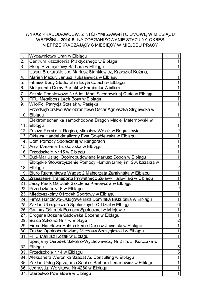 WYKAZ PRACODAWCÓW, Z KTÓRYMI ZAWARTO UMOWĘ W MIESIĄCU WRZEŚNIU 2010 R NA ZORGANIZOWANIE STAŻU NA OKRES NIEPRZEKRACZAJĄCY 6 MIESIĘCY W MIEJSCU PRACY 1. 2. 3. 4. 5. 6. 7. 8. 9. 10. 11. 12. 13. 14. 15. 16. 17. 18. 19. 20. 21. 22. 23. 24. 25. 26. 27. 28. 29. 30. 31. 32. 33. 34. 35. 36. 37. Wydawnictwo Uran w Elblągu Centrum Kształcenia Praktycznego w Elblągu Sklep Przemysłowy Barbara w Elblągu Usługi Brukarskie s.c. Mariusz Stankiewicz, Krzysztof Kuźma, Marian Mazur, Janusz Kubasiewicz w Elblągu Fitness Body Studio Slim Edyta Łotach w Elblągu Małgorzata Dulny Perfekt w Kamionku Wielkim Szkoła Podstawowa Nr 6 im. Marii Skłodowskiej-Curie w Elblągu PPU Metalboss Lech Boss w Elblągu Wik-Pol Patrycja Stasiak w Pasłęku Przedsiębiorstwo Wielobranżowe Oscar Agnieszka Stryjewska w Elblągu Elektromechanika samochodowa Dragon Maciej Maternowski w Elblągu Zajazd Remi s.c. Regina, Mirosław Wójcik w Bogaczewie Oktawa Handel detaliczny Ewa Gołębiewska w Elblągu Dom Pomocy Społecznej w Rangórach Aura Marzena Truskolaska w Elblągu Przedszkole Nr 15 w Elblągu Bud-Mar Usługi Ogólnobudowlane Mariusz Soboń w Elblągu Elbląskie Stowarzyszenie Pomocy Humanitarnej im. Św. Łazarza w Elblągu Biuro Rachunkowe Wadex 2 Małgorzata Zamłyńska w Elblągu Zrzeszenie Transportu Prywatnego Żuławy Hallo-Taxi w Elblągu Jerzy Pasik Ośrodek Szkolenia Kierowców w Elblągu Przedszkole Nr 6 w Elblągu Międzyszkolny Ośrodek Sportowy w Elblągu Firma Handlowo-Usługowe Bika Dominika Biskupska w Elblągu Zakład Ubezpieczeń Społecznych Oddział w Elblągu Gminny Ośrodek Pomocy Społecznej w Milejewie Drogeria Bożena Sadowska Bożena w Elblągu Bursa Szkolna Nr 4 w Elblągu Firma Handlowa Holdomkemp Dariusz Jaworski w Elblągu Zakład Ogólnobudowlany Mirosław Szczygłowski w Elblągu PHU Mariusz Kozak w Elblągu Specjalny Ośrodek Szkolno-Wychowawczy Nr 2 im. J. Korczaka w Elblągu Przedszkole Nr 4 w Elblągu Aleksandra Weronika Szabat As Consulting w Elblągu Zakład Usług Sprzątania Sauber Barbara Lenartowicz w Elblągu Jednostka Wojskowa Nr 4260 w Elblągu Starostwo Powiatowe w Elblągu 1 1 1 1 1 1 1 1 1 1 1 2 1 1 1 1 1 2 1 1 1 2 1 1 6 1 1 2 1 1 1 5 5 1 1 1 1 38. 39. 40. 41. 42. 43. 44. 45. 46. 47. 48. 49. 50. 51. 52. 53. 54. Przedszkole Nr 23 w Elblągu Tartak-Jagodno Artur Zagalski Dom Pomocy Społecznej Niezapominajka w Elblągu Przedszkole Nr 31 w Elblągu Instalatorstwo Elektryczne Zakład Ogólnobudowlany Marian Piórkowski w Elblągu Centrum Nauki i Biznesu Żak Sp. z o.o. w Łodzi Przedszkole Nr 14 w Elblągu Urząd Gminy w Gronowie Elbląskim Centrum Spotkań Europejskich Światowid w Elblągu Cykada Teresa Miszkiewicz-Florczyk w Elblągu Siemens Sp. z o.o. w Warszawie Zespół Szkół Nr 2 w Elblągu Przedszkole Nr 6 w Elblągu Fundacja Leczenia Dzieci Niepełnosprawnych Hipoterapią Końskie Zdrowie w Elblągu Zespół Szkół Inżynierii Środowiska i Usług im. Mikołaja Kopernika w Elblągu Przedszole Niepubliczne Bajka w Elblągu Ciastkarnia Elżbieta& Piotr Panek w Elblągu 5 2 1 4 1 1 1 1 2 1 1 1 1 5 2 1 1 55. Handel Artykułami Rolno-Spożywczymi i Kwiaty Malinka w Elblągu Urząd Marszałkowski Województwa Warmińsko-Mazurskiego w 56. Olsztynie 57. Sklep Ogólnospożywczy Adaś Czesław Bildziuk w Elblągu 1 58. Elbląskie Przedsiębiorstwo Inżynierskie Jerzy Łyszkiewicz w Elblągu Wojewódzki Zespół do Spraw Orzekania o Niepełnosprawności w 59. Elblągu PHU Oil-Car Zygmunt Klimowski, Dorota Klimowska-Pychyńska 60. Sp.j. w Elblągu 61. Elblągdis Sp. zo o.o. w Elblągu 62. Ciastkarnia U Wołka Marek Wołek w Elblągu 63. PUH Budchem w Elblągu Wielofunkcyjna Całodobowa Placówka Opiekuńczo-Wychowawcza 64. w Elblągu Szkoła Podstawowa im. 106 Dywizji Piechoty Armii Krajowej w 65. Pogrodziu 66. Elbląski Uniwersytet Robotniczy Sp. zo.o. 67. Restauracja Tokyo-Sushi Marek Słabuszewski w Elblągu 68. PPHU Aktina Radosław Pawlak w Gronowie Elbląskim Instalatorstwo i Pomiary Elektryczne Januszkiewicz Ryszard w 69. Elblągu 70. Clean Car Aleksandra Józefowicz-Janczuk w Elblągu Razem 1 1 1 1 2 3 1 1 2 1 1 1 1 1 1 105