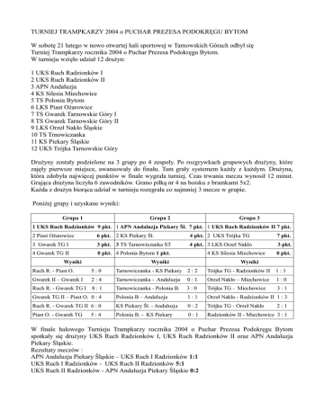 TURNIEJ TRAMPKARZY 2004 o PUCHAR PREZESA PODOKRĘGU BYTOM W sobotę 21 lutego w nowo otwartej hali sportowej w Tarnowskich Górach odbył się Turniej Trampkarzy rocznika 2004 o Puchar Prezesa Podokręgu Bytom. W turnieju wzięło udział 12 drużyn: 1 UKS Ruch Radzionków I 2 UKS Ruch Radzionków II 3 APN Andaluzja 4 KS Silesia Miechowice 5 TS Polonia Bytom 6 LKS Piast Ożarowice 7 TS Gwarek Tarnowskie Góry I 8 TS Gwarek Tarnowskie Góry II 9 LKS Orzeł Nakło Śląskie 10 TS Trnowiczanka 11 KS Piekary Śląskie 12 UKS Trójka Tarnowskie Góry Drużyny zostały podzielone na 3 grupy po 4 zespoły. Po rozgrywkach grupowych drużyny, które zajęły pierwsze miejsce, awansowały do finału. Tam grały systemem każdy z każdym. Drużyna, która zdobyła najwięcej punktów w finale wygrała turniej. Czas trwania meczu wynosił 12 minut. Grająca drużyna liczyła 6 zawodników. Grano piłką nr 4 na boisku z bramkami 5x2. Każda z drużyn biorąca udział w turnieju rozegrała co najmniej 3 mecze w grupie. Poniżej grupy i uzyskane wyniki: Grupa 1 Grupa 2 Grupa 3 1 UKS Ruch Radzionków 9 pkt. 1 APN Andaluzja Piekary Śl. 7 pkt. 1 UKS Ruch Radzionków II 7 pkt. 2 Piast Ożarowice 6 pkt. 2 KS Piekary Śl. 4 pkt. 2 UKS Trójka TG 7 pkt. 3 Gwarek TG I 3 pkt. 3 TS Tarnowiczanka ST 4 pkt. 3 LKS Orzeł Nakło 3 pkt. 4 Gwarek TG II 0 pkt. 4 Polonia Bytom 1 pkt. Wyniki 4 KS Silesia Miechowice Wyniki 0 pkt. Wyniki Ruch R. - Piast O. 5:0 Tarnowiczanka - KS Piekary 2 : 2 Trójka TG - Radzionków II 1 : 1 Gwarek II – Gwarek I 2:4 Tarnowiczanka - Andaluzja 0:1 Orzeł Nakło – Miechowice 1:0 Ruch R. - Gwarek TG I 8:1 Tarnowiczanka - Polonia B. 3:0 Trójka TG - Miechowice 3:1 Gwarek TG II – Piast O. 0 : 4 Polonia B – Andaluzja 1:1 Orzeł Nakło - Radzionków II 1 : 3 Ruch R. - Gwarek TG II 6 : 0 KS Piekary Śl. - Andaluzja 0:2 Trójka TG - Orzeł Nakło Piast O. - Gwarek TG Polonia B. - KS Piekary 0:1 Radzionków II - Miechowice 3 : 1 5:4 2:1 W finale halowego Turnieju Trampkarzy rocznika 2004 o Puchar Prezesa Podokręgu Bytom spotkały się drużyny UKS Ruch Radzionków I, UKS Ruch Radzionków II oraz APN Andaluzja Piekary Śląskie. Rezultaty meczów : APN Andaluzja Piekary Śląskie – UKS Ruch I Radzionków 1:1 UKS Ruch I Radzionków - UKS Ruch II Radzionków 5:1 UKS Ruch II Radzionków - APN Andaluzja Piekary Śląskie 0:2 Klasyfikacja końcowa: 1 miejsce UKS Ruch I Radzionków ( Paweł Kwaśniewski, Sebastian Golus, Mateusz Lipp, Kacper Zalewski, Tobiasz Matejczyk, Aleksander Imiolczyk, Aleksander Tobolik, Maksymilian Ficulak) 2 miejsce APN Andaluzja Piekary Śląskie (Kamil Wełnicki, Dominik Kozak, Bartłomiej Rojek, Filip Zychowicz, Patryk Panasiuk, Dawid Franielczyk, Michał Franielczyk, Bartosz Gogola, Alan Nurek, Bartosz Chmiel) 3 UKS Ruch II Radzionków ( Bartosz Szop, Franciszek Malicki, Jakub Potoczny, Paweł Szulewa, Szymon Wilczek, Wiktor Gońda, Mikołaj Trybel, Dawid Biadacz, Mikołaj Waniek, Szymon Cieślik) Wszystkie drużyny otrzymały dyplomy, a trzy najlepsze zespoły nagrodzone zostały pucharami. Przyznano także wyróżnienia indywidualne. Statuetki otrzymali: Najlepszy bramkarz - Kamil Wełnicki /APN Andaluzja Piekary Śląskie/ Król strzelców - Kacper Zalewski /Ruch Radzionków I/ - 9 bramek Najlepszy zawodnika - Mateusz Lipp /Ruch Radzionków I Patronat nad turniejem objął Burmistrz Miasta Tarnowskie Góry. Nagrody i wyróżnienia wręczyli Burmistrz Arkadiusz Czech, Prezes Krzysztof Seweryn, Przewodniczący Wydziału Szkolenia Artur Maligłówka.