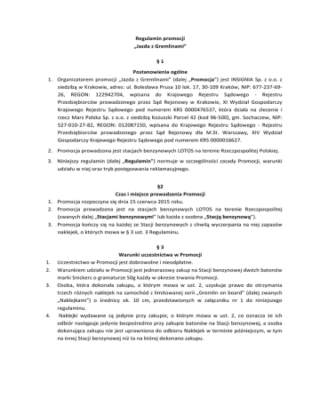 Regulamin promocji „Jazda z Gremlinami” § 1 Postanowienia ogólne 1. Organizatorem promocji „Jazda z Gremlinami” (dalej „Promocja”) jest INSIGNIA Sp. z o.o. z siedzibą w Krakowie, adres: ul. Bolesława Prusa 10 lok. 17, 30-‐109 Kraków, NIP: 677-‐237-‐69-‐ 26, REGON: 122942704, wpisana do Krajowego Rejestru Sądowego -‐ Rejestru Przedsiębiorców prowadzonego przez Sąd Rejonowy w Krakowie, XI Wydział Gospodarczy Krajowego Rejestru Sądowego pod numerem KRS 0000476537, która działa na zlecenie i rzecz Mars Polska Sp. z o.o. z siedzibą Kożuszki Parcel 42 (kod 96-‐500), gm. Sochaczew, NIP: 527-‐010-‐27-‐82, REGON: 012087150, wpisana do Krajowego Rejestru Sądowego -‐ Rejestru Przedsiębiorców prowadzonego przez Sąd Rejonowy dla M.St. Warszawy, XIV Wydział Gospodarczy Krajowego Rejestru Sądowego pod numerem KRS 0000016627. 2. Promocja prowadzona jest stacjach benzynowych LOTOS na terenie Rzeczpospolitej Polskiej. 3. Niniejszy regulamin (dalej „Regulamin") normuje w szczególności zasady Promocji, warunki udziału w niej oraz tryb postępowania reklamacyjnego. §2 Czas i miejsce prowadzenia Promocji 1. Promocja rozpoczyna się dnia 15 czerwca 2015 roku. 2. Promocja prowadzona jest na stacjach benzynowych LOTOS na terenie Rzeczpospolitej (zwanych dalej „Stacjami benzynowymi” lub każda z osobna „Stacją benzynową”). 3. Promocja kończy się na każdej ze Stacji benzynowych z chwilą wyczerpania na niej zapasów naklejek, o których mowa w § 3 ust. 3 Regulaminu. § 3 Warunki uczestnictwa w Promocji 1. Uczestnictwo w Promocji jest dobrowolne i nieodpłatne. 2. Warunkiem udziału w Promocji jest jednorazowy zakup na Stacji benzynowej dwóch batonów marki Snickers o gramaturze 50g każdy w okresie trwania Promocji. 3. Osoba, która dokonała zakupu, o którym mowa w ust. 2, uzyskuje prawo do otrzymania trzech różnych naklejek na samochód z limitowanej serii „Gremlin on board” (dalej zwanych „Naklejkami”) o średnicy ok. 10 cm, przedstawionych w załączniku nr 1 do niniejszego regulaminu. 4. Naklejki wydawane są jedynie przy zakupie, o którym mowa w ust. 2, co oznacza że ich odbiór następuje jedynie bezpośrednio przy zakupie batonów na Stacji benzynowej, a osoba dokonująca zakupu nie jest uprawniona do odbioru Naklejek w terminie późniejszym, w tym na innej Stacji benzynowej niż ta na której dokonano zakupu. 1. 2. 3. 4. 5. 6. 7. § 4 Reklamacje Reklamacje dotyczące Promocji mogą być składane w czasie trwania Promocji i po jej zakończeniu do dnia 31.12.2015 w formie pisemnej listem poleconym na adres INSIGNIA Sp. z o.o. z siedzibą w Krakowie, ul. Bolesława Prusa 10 lok. 17, 30-‐109 Kraków z dopiskiem „Jazda z Gremlinami” lub mailowo na adres e-‐mail: [email protected] . O zachowaniu terminu, o którym mowa w zdaniu poprzednim decyduje data wpływu reklamacji do Organizatora. Reklamacje wpływające po terminie określonym powyżej w ust. 1 nie będą rozpatrywane. Reklamacje winny zawierać imię, nazwisko i adres korespondencyjny zgłaszającego oraz zwięzłe wskazanie przyczyn reklamacji. Skutecznie złożone reklamacje będą rozpatrywane w terminie 21 dni od daty ich otrzymania, a zgłaszający reklamację zostanie powiadomiony o sposobie rozpatrzenia reklamacji na podany adres e-‐mail lub listem poleconym. Regulamin jest dostępny na Stacjach benzynowych oraz w siedzibie Organizatora. Organizator zastrzega sobie prawo dokonywania modyfikacji postanowień Regulaminu, o ile zmiany te nie wpływają niekorzystnie na prawa już nabyte w Promocji. Wszelkie informacje na temat Promocji można uzyskać kontaktując się z Organizatorem pod adresem e-‐mail : [email protected]. Załącznik nr 1 – naklejki na samochód