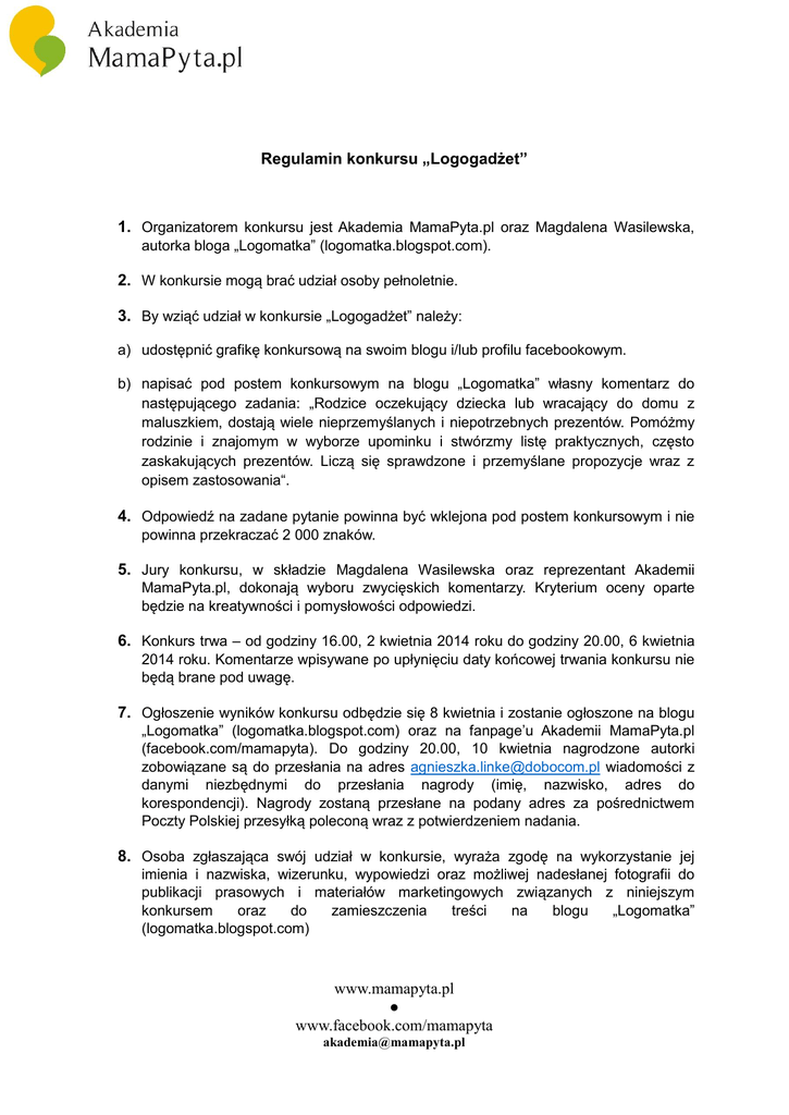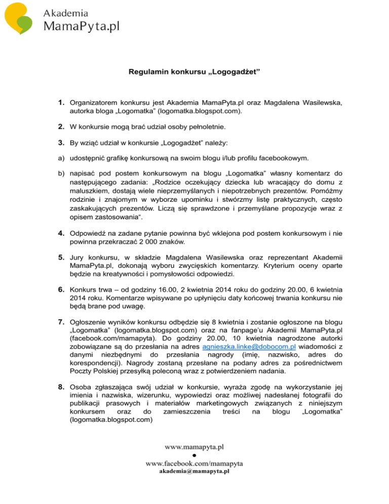 Regulamin konkursu „Logogadżet” 1. Organizatorem konkursu jest Akademia MamaPyta.pl oraz Magdalena Wasilewska, autorka bloga „Logomatka” (logomatka.blogspot.com). 2. W konkursie mogą brać udział osoby pełnoletnie. 3. By wziąć udział w konkursie „Logogadżet” należy: a) udostępnić grafikę konkursową na swoim blogu i/lub profilu facebookowym. b) napisać pod postem konkursowym na blogu „Logomatka” własny komentarz do następującego zadania: „Rodzice oczekujący dziecka lub wracający do domu z maluszkiem, dostają wiele nieprzemyślanych i niepotrzebnych prezentów. Pomóżmy rodzinie i znajomym w wyborze upominku i stwórzmy listę praktycznych, często zaskakujących prezentów. Liczą się sprawdzone i przemyślane propozycje wraz z opisem zastosowania“. 4. Odpowiedź na zadane pytanie powinna być wklejona pod postem konkursowym i nie powinna przekraczać 2 000 znaków. 5. Jury konkursu, w składzie Magdalena Wasilewska oraz reprezentant Akademii MamaPyta.pl, dokonają wyboru zwycięskich komentarzy. Kryterium oceny oparte będzie na kreatywności i pomysłowości odpowiedzi. 6. Konkurs trwa – od godziny 16.00, 2 kwietnia 2014 roku do godziny 20.00, 6 kwietnia 2014 roku. Komentarze wpisywane po upłynięciu daty końcowej trwania konkursu nie będą brane pod uwagę. 7. Ogłoszenie wyników konkursu odbędzie się 8 kwietnia i zostanie ogłoszone na blogu „Logomatka” (logomatka.blogspot.com) oraz na fanpage’u Akademii MamaPyta.pl (facebook.com/mamapyta). Do godziny 20.00, 10 kwietnia nagrodzone autorki zobowiązane są do przesłania na adres [email protected] wiadomości z danymi niezbędnymi do przesłania nagrody (imię, nazwisko, adres do korespondencji). Nagrody zostaną przesłane na podany adres za pośrednictwem Poczty Polskiej przesyłką poleconą wraz z potwierdzeniem nadania. 8. Osoba zgłaszająca swój udział w konkursie, wyraża zgodę na wykorzystanie jej imienia i nazwiska, wizerunku, wypowiedzi oraz możliwej nadesłanej fotografii do publikacji prasowych i materiałów marketingowych związanych z niniejszym konkursem oraz do zamieszczenia treści na blogu „Logomatka” (logomatka.blogspot.com) www.mamapyta.pl ● www.facebook.com/mamapyta [email protected] 9. Nagrody przewidziane w konkursie: I miejsce: - zestaw do karmienia Calma - zestaw Breast Care Set - zestaw kosmetyków dla kobiet w ciąży i młodych mam Tołpa, w którego skład wchodzą: oliwka do mycia i kąpieli 4w1, olejek przeciw rozstępom, serum liftingujące biust II i III miejsce: - zestaw kosmetyków dla kobiet w ciąży i młodych mam Tołpa, w którego skład wchodzą: oliwka do mycia i kąpieli 4w1, olejek przeciw rozstępom, serum liftingujące biust 10. Organizatorzy zastrzegają sobie prawo do nieprzyznania wszystkich nagród. 11. Organizatorzy zastrzegają sobie prawo do zmiany regulaminu w każdym momencie trwania konkursu. www.mamapyta.pl ● www.facebook.com/mamapyta [email protected]