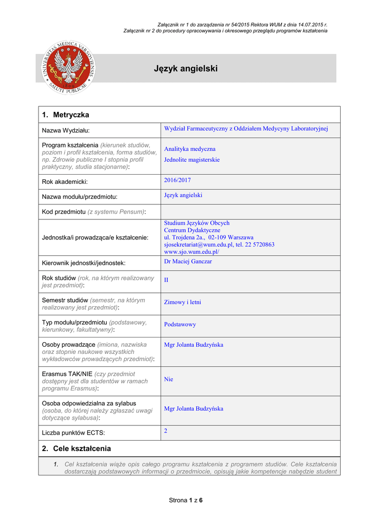 Załącznik nr 1 do zarządzenia nr 54/2015 Rektora WUM z dnia 14.07.2015 r. Załącznik nr 2 do procedury opracowywania i okresowego przeglądu programów kształcenia Język angielski 1. Metryczka Nazwa Wydziału: Program kształcenia (kierunek studiów, poziom i profil kształcenia, forma studiów, np. Zdrowie publiczne I stopnia profil praktyczny, studia stacjonarne): Wydział Farmaceutyczny z Oddziałem Medycyny Laboratoryjnej Analityka medyczna Jednolite magisterskie Rok akademicki: 2016/2017 Nazwa modułu/przedmiotu: Język angielski Kod przedmiotu (z systemu Pensum): Jednostka/i prowadząca/e kształcenie: Studium Języków Obcych Centrum Dydaktyczne ul. Trojdena 2a., 02-109 Warszawa [email protected], tel. 22 5720863 www.sjo.wum.edu.pl/ Kierownik jednostki/jednostek: Dr Maciej Ganczar Rok studiów (rok, na którym realizowany jest przedmiot): II Semestr studiów (semestr, na którym realizowany jest przedmiot): Zimowy i letni Typ modułu/przedmiotu (podstawowy, kierunkowy, fakultatywny): Podstawowy Osoby prowadzące (imiona, nazwiska oraz stopnie naukowe wszystkich wykładowców prowadzących przedmiot): Mgr Jolanta Budzyńska Erasmus TAK/NIE (czy przedmiot dostępny jest dla studentów w ramach programu Erasmus): Nie Osoba odpowiedzialna za sylabus (osoba, do której należy zgłaszać uwagi dotyczące sylabusa): Mgr Jolanta Budzyńska Liczba punktów ECTS: 2 2. Cele kształcenia 1. Cel kształcenia wiąże opis całego programu kształcenia z programem studiów. Cele kształcenia dostarczają podstawowych informacji o przedmiocie, opisują jakie kompetencje nabędzie student Strona 1 z 6 Załącznik nr 1 do zarządzenia nr 54/2015 Rektora WUM z dnia 14.07.2015 r. Załącznik nr 2 do procedury opracowywania i okresowego przeglądu programów kształcenia po zakończeniu danego kursu. Ćwiczenie umiejętności językowych pozwalających na osiągnięcie biegłości języka angielskiego w dziedzinie medycyny laboratoryjnej, zgodnie z wymaganiami określonymi dla poziomu B2+ Europejskiego Systemu Opisu Kształcenia Językowego Rady Europy. Strona 2 z 6 Załącznik nr 1 do zarządzenia nr 54/2015 Rektora WUM z dnia 14.07.2015 r. Załącznik nr 2 do procedury opracowywania i okresowego przeglądu programów kształcenia 3. Wymagania wstępne 1. W tym polu zawarte są informacje na temat np. przedmiotów lub oraz efektów kształcenia, które student powinien mieć zaliczone, aby uczestniczyć w zajęciach z przedmiotu.… Zaliczony kurs języka angielskiego na I roku. 4. Przedmiotowe efekty kształcenia Lista efektów kształcenia Symbol przedmiotowego efektu kształcenia Treść przedmiotowego efektu kształcenia Odniesienie do efektu kierunkowego (numer) Symbol tworzony przez osobę wypełniającą sylabus (kategoria: W-wiedza, U-umiejętności, K-kompetencje oraz numer efektu) Efekty kształcenia określają co student powinien wiedzieć, rozumieć i być zdolny wykonać po zakończeniu zajęć. Efekty kształcenia wynikają z celów danego przedmiotu. Osiągniecie każdego z efektów powinno być zweryfikowane, aby student uzyskał zaliczenie. Numer kierunkowego efektu kształcenia zawarty w Rozporządzeniu Ministra Nauki bądź Uchwały Senatu WUM właściwego kierunku studiów. U-1 Posługuje się językiem angielskim w zakresie medycyny laboratoryjnej na poziomie biegłości B2+ Europejskiego Systemu Opisu Kształcenia Językowego Rady Europy. K-U41 Korzysta z piśmiennictwa specjalistycznego w języku angielskim, rozumie teksty o tematyce zawodowej, instrukcje i druki informacyjne; Potrafi przekazać wynik testu (doświadczenia); Potrafi napisać raport z przeprowadzonego testu (doświadczenia); U-2 Potrafi przygotować i przedstawić edukacyjną prezentację z dziedziny medycyny laboratoryjnej; K-U41 Doskonali nabyte umiejętności poprzez stały kontakt ze specjalistycznym językiem angielskim, np. poprzez czytanie prasy specjalistycznej. 5. Formy prowadzonych zajęć Forma Liczba godzin Liczba grup Minimalna liczba osób w grupie nieobowiązkowe Wykład Strona 3 z 6 Załącznik nr 1 do zarządzenia nr 54/2015 Rektora WUM z dnia 14.07.2015 r. Załącznik nr 2 do procedury opracowywania i okresowego przeglądu programów kształcenia nieobowiązkowe Seminarium Ćwiczenia 60 2 nieobowiązkowe 6. Tematy zajęć i treści kształcenia Dla wszystkich zajęć symbol przedmiotowego efektu kształcenia – U-1,2 C1 Omówienie treści i regulaminu kursu. Omówienie egzaminu. C2 Słownictwo: biochemia. Opis budowy, funkcji i procesu. C3 Słownictwo: fizjologia. Opis budowy, funkcji i procesu. C4 Słownictwo: biologia molekularna. C 5 Słownictwo: biologia molekularna – techniki badawcze. C 6 Słownictwo: immunologia. C 7 Słownictwo: cukrzyca – testy diagnostyczne. C 8 Słownictwo: elektrolity – testy diagnostyczne. C 9 Słownictwo: hormony – testy diagnostyczne. C 10 Słownictwo: ogólne badanie krwi. C 11 Słownictwo: ogólne badanie krwi. C 12 Słownictwo: immunologia. Testy diagnostyczne wykorzystujące przeciwciała. C 13 Powtórzenie. C 14 Test. C 15 Omówienie i poprawa testu. C 16 Aparatura laboratoryjna (powtórzenie i rozszerzenie słownictwa). C 17 Słownictwo: analiza instrumentalna – techniki i metody. C 18 Słownictwo: analiza instrumentalna – techniki i metody. C 19 Słownictwo: ogólne badanie moczu. C 20 Słownictwo: ogólne badanie moczu. C 21 Słownictwo: słowa funkcyjne w tekstach specjalistycznych. C 22 Słownictwo: słowa funkcyjne w tekstach specjalistycznych. C 23 Słownictwo: diagnosta laboratoryjny – opis zawodu. C 24 Słownictwo: diagnosta laboratoryjny – opis zawodu. C 25 Funkcje językowe: udzielanie informacji, prośby, propozycje, doradzanie, ostrzeganie. Ćwiczenia w pisaniu. C 26 Funkcje językowe: wyrażanie opinii, możliwości, niemożliwości, konieczności, prawdopodobieństwa. Ćwiczenia w pisaniu. C 27 Powtórzenie do zaliczenia. C 28 Powtórzenie do egzaminu. C 29 Test. C 30 Omówienie i poprawa testu. 7. Sposoby weryfikacji 