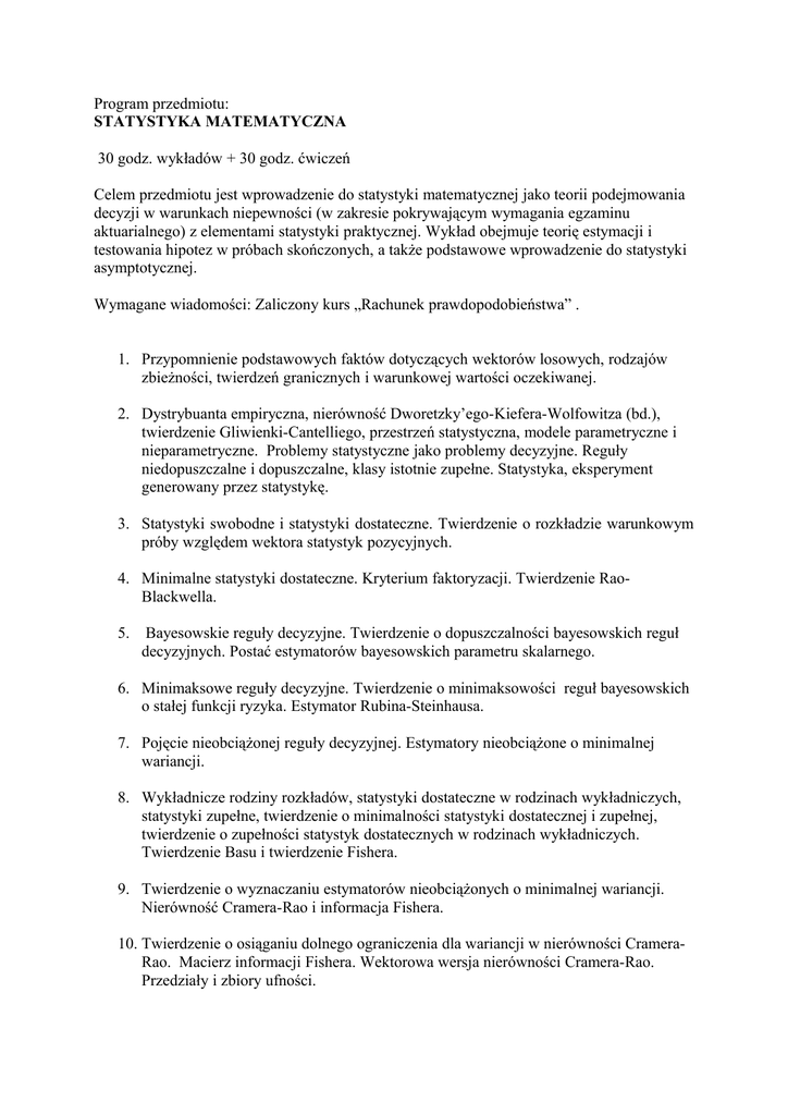 Program przedmiotu: STATYSTYKA MATEMATYCZNA 30 godz. wykładów + 30 godz. ćwiczeń Celem przedmiotu jest wprowadzenie do statystyki matematycznej jako teorii podejmowania decyzji w warunkach niepewności (w zakresie pokrywającym wymagania egzaminu aktuarialnego) z elementami statystyki praktycznej. Wykład obejmuje teorię estymacji i testowania hipotez w próbach skończonych, a także podstawowe wprowadzenie do statystyki asymptotycznej. Wymagane wiadomości: Zaliczony kurs „Rachunek prawdopodobieństwa” . 1. Przypomnienie podstawowych faktów dotyczących wektorów losowych, rodzajów zbieżności, twierdzeń granicznych i warunkowej wartości oczekiwanej. 2. Dystrybuanta empiryczna, nierówność Dworetzky’ego-Kiefera-Wolfowitza (bd.), twierdzenie Gliwienki-Cantelliego, przestrzeń statystyczna, modele parametryczne i nieparametryczne. Problemy statystyczne jako problemy decyzyjne. Reguły niedopuszczalne i dopuszczalne, klasy istotnie zupełne. Statystyka, eksperyment generowany przez statystykę. 3. Statystyki swobodne i statystyki dostateczne. Twierdzenie o rozkładzie warunkowym próby względem wektora statystyk pozycyjnych. 4. Minimalne statystyki dostateczne. Kryterium faktoryzacji. Twierdzenie RaoBlackwella. 5. Bayesowskie reguły decyzyjne. Twierdzenie o dopuszczalności bayesowskich reguł decyzyjnych. Postać estymatorów bayesowskich parametru skalarnego. 6. Minimaksowe reguły decyzyjne. Twierdzenie o minimaksowości reguł bayesowskich o stałej funkcji ryzyka. Estymator Rubina-Steinhausa. 7. Pojęcie nieobciążonej reguły decyzyjnej. Estymatory nieobciążone o minimalnej wariancji. 8. Wykładnicze rodziny rozkładów, statystyki dostateczne w rodzinach wykładniczych, statystyki zupełne, twierdzenie o minimalności statystyki dostatecznej i zupełnej, twierdzenie o zupełności statystyk dostatecznych w rodzinach wykładniczych. Twierdzenie Basu i twierdzenie Fishera. 9. Twierdzenie o wyznaczaniu estymatorów nieobciążonych o minimalnej wariancji. Nierówność Cramera-Rao i informacja Fishera. 10. Twierdzenie o osiąganiu dolnego ograniczenia dla wariancji w nierówności CrameraRao. Macierz informacji Fishera. Wektorowa wersja nierówności Cramera-Rao. Przedziały i zbiory ufności. 11. Estymatory asymptotycznie normalne, asymptotyczna nierówność typu Cramera-Rao dla estymatorów asymptotycznie normalnych, program Fishera, asymptotyczna efektywność. 12. Metoda największej wiarogodności. Twierdzenia o własnościach estymatorów w próbach skończonych i twierdzenie o asymptotycznym istnieniu i normalności przy warunkach typu Cramera. 13. Metoda najmniejszych kwadratów (MNK). Model liniowy. Twierdzenie GaussaMarkowa. Własności estymatorów w modelu z losowymi zmiennymi objaśniającymi. MNK dla modeli nieliniowych. 14. Teoria i lemat Neymana-Pearsona. Testy najmocniejsze w rodzinach z monotonicznym ilorazem wiarogodności. Testy nieobciążone. Test KołmogorowaSmirnowa. Test Wilcoxona. Test Kołmogorowa. Testy normalności Lillieforsa i Shapiro-Wilka. Test chi-kwadrat. Test ilorazu wiarogodności. Literatura: 1. J.Bartoszewicz, Wykłady ze statystyki matematycznej, PWN, 1989. 2. C.R. Rao, Modele liniowe statystyki matematycznej, PWN, 1982. 3. M. Krzyśko, Statystyka matematyczna, Wydawnictwo UAM, 1996. 4. E.L.Lehman, Teoria estymacji punktowej, PWN, 1991. 5. A.Jokiel-Rokita, R. Magiera, Modele i metody statystyki matematycznej w zadaniach, GiS, 2005. Program przygotował: Zbigniew Szkutnik 23 marca 2012