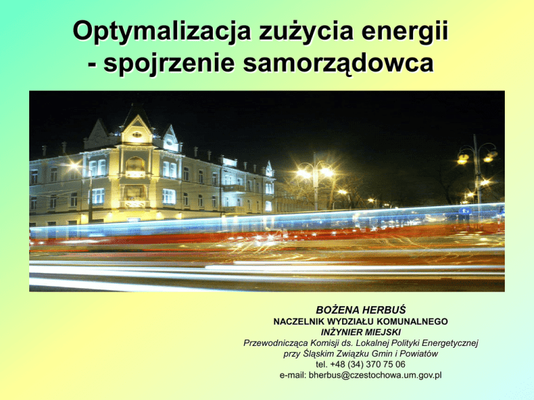 Optymalizacja zużycia energii - spojrzenie samorządowca BOŻENA HERBUŚ NACZELNIK WYDZIAŁU KOMUNALNEGO INŻYNIER MIEJSKI Przewodnicząca Komisji ds. Lokalnej Polityki Energetycznej przy Śląskim Związku Gmin i Powiatów tel. +48 (34) 370 75 06 e-mail: [email protected] Zarządzanie energią stanowi obecnie jeden z podstawowych obszarów zainteresowania firm we wszystkich sektorach przemysłu i usług, zwiększa się również energetyczna świadomość podstawowych jednostek samorządu terytorialnego. Przesłanki, które decydują o wdrożeniu przez organizację procesu zarządzania energią: wzrost kosztów paliw i energii konieczność podjęcia działań optymalizujących koszty stałe optymalizacja kosztów produkcji racjonalne, oszczędne i uzasadnione wydatkowanie środków publicznych zachowanie konkurencyjności na rynku zmniejszanie się ilości energetycznych surowców naturalnych zmiany klimatyczne bezpieczeństwo energetyczne organizacji i otoczenia wymagania prawne związane z ochroną środowiska realizacja zapisów ustawy o efektywności energetycznej z 15 kwietnia 2011roku realizacja pakietu klimatyczno – energetycznego 3x20 dążenie do postrzegania organizacji przez otoczenie jako społecznie odpowiedzialnej Zarządzanie energią w obiektach użyteczności publicznej wprowadza porządek w obszarze użytkowanie mediów energetycznych w zakresie: określenia odpowiedzialności za realizowany obszar z delegowaniem uprawnień dla odpowiedniej osoby lub struktury optymalizacji zużyć mediów energetycznych i polepszenia jakości atmosfery osiągnięcia odpowiednich standardów usług energetycznych (komfort cieplny, oświetlenie, emisja zanieczyszczeń) ograniczenia kosztów ponoszonych na zaopatrzenie w media energetyczne określenia katalogu niezbędnych inicjatyw i podejmowania działań według efektywności ekonomicznej i energetycznej podnoszenia świadomości administratorów zarządzających obiektami użyteczności publicznej W Częstochowie od 2003 roku realizowany jest program „Zarządzanie energią i środowiskiem w obiektach użyteczności publicznej”. Monitorowane i raportowane efekty działań dla 120 obiektów oświatowych: zużycie paliw i energii w 2010 roku wyniosło 58 100 MWh i było mniejsze o 14 500 MWh (co stanowi 20%) w porównaniu do roku 2003, łączna emisja CO2 w 2010 roku wyniosła 26 200 Mg i była mniejsza o 7 800 Mg (co stanowi 18.6%) w porównaniu do roku 2003, zużycie wody w roku 2010 wyniosło 126 tys. m3 i było mniejsze o 76 tys. m3 (co stanowi 36,8%) w porównaniu do roku 2003 Efektywność wykorzystania mediów energetycznych oceniana jest na podstawie wartości jednostkowych wskaźników zużycia mediów energetycznych na 1 m2 powierzchni ogrzewanej obiektu, natomiast w przypadku wody na 1 ucznia. Jednostkowe średnie zużycie paliw i energii zmniejszyło się z 231 kWh/m2 na rok w 2003 r. do 172 kWh/m2 na rok w 2010 r., czyli o 24,9%. Jednostkowe średnie zużycie wody zmniejszyło się z 3,80 m3 na osobę na rok w 2003 r. do 3,05 m3 na osobę na rok w 2010 r., czyli o 19,7%. Łączne efekty działań za lata 2004 - 2010 dla 120 obiektów oświatowych wynoszą: ograniczenie zużycia energii o 108 000 MWh ograniczenie emisji CO2 o 46 000 Mg ograniczenie zużycia wody o 433146 m3 Zarządzanie energią i środowiskiem w samorządzie miejskim skutkujące optymalizacją zużycia energii i wody oraz ograniczeniem wydatkowania środków na ten cel wymaga ciągłej realizacji pięciu podstawowych działań: Planowanie – ustalenie celów oraz określenie procesów niezbędnych do uzyskania oczekiwanych efektów Realizacja – wdrożenie procesów z zaangażowaniem wszystkich zainteresowanych uczestników Monitorowanie – sprawdzanie i porównywanie osiąganych efektów w odniesieniu do założonych celów Raportowanie – syntetyczne zestawianie uzyskiwanych efektów, stanowiące podstawę do określania dalszych działań Korygowanie – podejmowanie działań pozwalających na doskonalenie funkcjonującego systemu zarządzania energią i środowiskiem Nierozłączny element towarzyszący procesowi zarządzania energią i środowiskiem stanowi szeroko pojęta edukacja. Efektywne i sprawne korzystanie z wolnego rynku energii elektrycznej kształtuje partnerskie postawy po stronie odbiorcy oraz przedsiębiorstw energetycznych zajmujących się obrotem energią elektryczną i tych świadczących usługi dystrybucji energii elektrycznej. Przede wszystkim jednak zapewnia odpowiednie gospodarowanie środkami publicznymi przeznaczonymi na ten obszar aktywności gmin i jednostek im podległych. Z dniem 1 lipca 2007 roku Prezes Urzędu Regulacji Energetyki dokonał pełnego otwarcie rynku energii elektrycznej. W wyniku nowelizacji ustawy Prawo energetyczne umożliwiono wszystkim odbiorcom swobodny wybór dostawcy energii elektrycznej (art. 4 pkt. j „odbiorcy paliw gazowych lub energii mają prawo zakupu tych paliw lub energii od wybranego przez siebie dostawcy”). Przeprowadzono szereg zmian w strukturze rynku energii elektrycznej w zakresie wyodrębnienia: operatorów systemów przesyłowych, operatorów systemów dystrybucyjnych przedsiębiorstw energetycznych zajmujących się obrotem energią elektryczną Przetargi organizowane przez Urząd Miasta Częstochowy na zakup energii elektrycznej dla potrzeb Urzędu i jednostek gminy w latach 2009-2012 Rok j.m. 2009 2009 2010 2011 2012 01.01-31.12 01.04-31.12 01.01-31.12 01.01-31.12 01.01-31.12 liczba jednostek objętych postępowaniem 1 10 38 64 133 ilość punktów odbioru energii 33 43 733 799 933 1,12 1,53 20,40 21,65 33,55 2 2 3 6 6 [zł] 379859,20 569313,00 6198624,80 6451445,40 10637717,73 [zł/kWh] 0,2780 0,3050 0,2491 0,2443 0,2578 okres zamówienia wolumen energii [GWh] liczba oferentów wartość wybranej oferty brutto uzyskana średnia cena energii elektrycznej netto Dotychczasowe oszczędności uzyskane w poprzednich przetargach na zakup energii w latach 2009 – 2011, pr