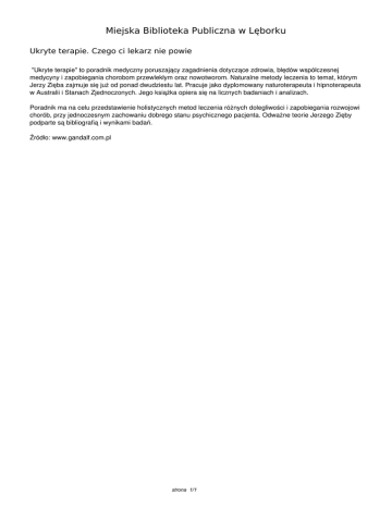 Miejska Biblioteka Publiczna w Lęborku Ukryte terapie. Czego ci lekarz nie powie "Ukryte terapie" to poradnik medyczny poruszający zagadnienia dotyczące zdrowia, błędów współczesnej medycyny i zapobiegania chorobom przewlekłym oraz nowotworom. Naturalne metody leczenia to temat, którym Jerzy Zięba zajmuje się już od ponad dwudziestu lat. Pracuje jako dyplomowany naturoterapeuta i hipnoterapeuta w Australii i Stanach Zjednoczonych. Jego książka opiera się na licznych badaniach i analizach. Poradnik ma na celu przedstawienie holistycznych metod leczenia różnych dolegliwości i zapobiegania rozwojowi chorób, przy jednoczesnym zachowaniu dobrego stanu psychicznego pacjenta. Odważne teorie Jerzego Zięby podparte są bibliografią i wynikami badań. Źródło: www.gandalf.com.pl strona 1/1 Powered by TCPDF (www.tcpdf.org)