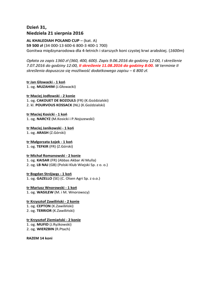 Dzień 31, Niedziela 21 sierpnia 2016 AL KHALEDIAH POLAND CUP – (kat. A) 59 500 zł (34 000-13 600-6 800-3 400-1 700) Gonitwa międzynarodowa dla 4-letnich i starszych koni czystej krwi arabskiej. (1600m) Opłata za zapis 1360 zł (360, 400, 600). Zapis 9.06.2016 do godziny 12:00, I skreślenie 7.07.2016 do godziny 12:00, II skreślenie 11.08.2016 do godziny 8:00. W terminie II skreślenia dopuszcza się możliwość dodatkowego zapisu – 6 800 zł. tr Jan Głowacki - 1 koń 1. og. MUZAHIM (J.Głowacki) tr Maciej Jodłowski - 2 konie 1. og. CAKOUET DE BOZOULS (FR) (K.Goździalski) 2. kl. POURVOUS KOSSACK (NL) (K.Goździalski) tr Maciej Kosicki - 1 koń 1. og. NARCYZ (M.Kosicki i P.Nojszewski) tr Maciej Janikowski - 1 koń 1. og. ARASH (Z.Górski) tr Małgorzata Łojek - 1 koń 1. og. TEFKIR (FR) (Z.Górski) tr Michał Romanowski - 2 konie 1. og. KAISAR (FR) (Abbas Akbar Al Mulla) 2. og. LB NAJ (GB) (Polski Klub Wiejski Sp. z o. o.) tr Bogdan Strójwąs - 1 koń 1. og. GAZELLO (SE) (C. Olsen Agri Sp. z o.o.) tr Mariusz Wnorowski - 1 koń 1. og. WASILEW (M. i M. Wnorowscy) tr Krzysztof Zawiliński - 2 konie 1. og. CEPTON (K.Zawiliński) 2. og. TERRIOR (K.Zawiliński) tr Krzysztof Ziemiański - 2 konie 1. og. MUFID (J.Ryżkowski) 2. og. WIERZBIN (R.Ptach) RAZEM 14 koni