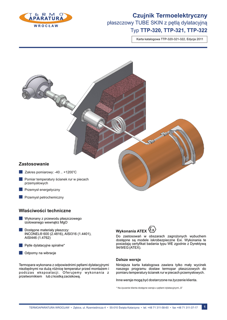 Czujnik Termoelektryczny płaszczowy TUBE SKIN z pętlą dylatacyjną Typ TTP-320, TTP-321, TTP-322 Karta katalogowa TTP-320-321-322, Edycja 2011 Zastosowanie Zakres pomiarowy: -40 .. +1200oC Pomiar temperatury ścianek rur w piecach przemysłowych Przemysł energetyczny Przemysł petrochemiczny Właściwości techniczne Wykonany z przewodu płaszczowego izolowanego wewnątrz MgO Dostępne materiały płaszczy: INCONEL® 600 (2.4816), AISI316 (1.4401), AISI446 (1.4762) Pętle dylatacyjne spiralne* Wykonania ATEX Do zastosowań w obszarach zagrożonych wybuchem dostępne są modele iskrobezpieczne Exi. Wykonania te posiadają certyfikat badania typu WE zgodnie z Dyrektywą 94/9/EG (ATEX). Odporny na wibracje Dalsze wersje Termopara wykonana z odpowiednimi pętlami dylatacyjnymi niezbędnymi na dużą różnicę temperatur przed montażem i podczas ekspoatacji. Oferujemy wykonania z przetwornikiem lub z kostką zaciskową. Niniejsza karta katalogowa zawiera tylko mały wycinek naszego programu dostaw termopar płaszczowych do pomiaru temperatury ścianek rur w piecach przemysłowych. Inne wersje mogą być dostarczone na życzenie klienta. * Na życzenie klienta dostępne wersje z pętlami dylatacyjnymi „S” TERMOAPARATURA WROCŁAW • Zębice, ul. Rzemieślnicza 4 • 55-010 Święta Katarzyna • tel. +48 71 311-58-60 • fax +48 71 311-37-17 1 1 2 Płytka do wspawania typu PAD 2 3 C 2 4 Tulejka do wspawania typu KNIFE EDGE L B - Głowica przyłączeniowa DAN lub XE-DANA ( wykonanie iskrobezpieczne ) - Nypel - Łącznik - Redukcja 1/2"NPT / 1 1/2" NPT - Tulejka do wspawania typu KNIFE EDGE lub płytka typu PAD 2 3 4 5 A 40 1 Ø90 3 zwoje 5 Typ TTP-320, TTP-321, TTP-322 Wykonanie TTP-320 TERMOAPARATURA WROCŁAW • Zębice, ul. Rzemieślnicza 4 • 55-010 Święta Katarzyna • tel. +48 71 311-58-60 • fax +48 71 311-37-17 ØD 1 Płytka do wspawania typu PAD 2 3 C 2 4 Tulejka do wspawania typu KNIFE EDGE L B - Głowica przyłączeniowa DAN lub XE-DANA ( wykonanie iskrobezpieczne ) - Zacisk przesuwny UG4 - Przewód płaszczowy termopary - Redukcja 1/2"NPT / 1 1/2" NPT - Tulejka do wspawania typu KNIFE EDGE lub płytka typu PAD 2 3 4 5 A 40 1 Ø90 3 zwoje 5 Typ TTP-320, TTP-321, TTP-322 Wykonanie TTP-321 TERMOAPARATURA WROCŁAW • Zębice, ul. Rzemieślnicza 4 • 55-010 Święta Katarzyna • tel. +48 71 311-58-60 • fax +48 71 311-37-17 3 ØD 4 2 Płytka do wspawania typu PAD D 1 3 C 4 5 L Tulejka do wspawania typu KNIFE EDGE B - Kabel kompensacyjny - Tulejka - Przewód płaszczowy termopary - Zacisk przesuwny UG4 - Redukcja 1/2"NPT / 1 1/2"NPT - Tulejka do wspawania typu KNIFE EDGE lub płytka typu PAD 2 3 4 5 6 A 40 1 Ø90 3 zwoje 6 Typ TTP-320, TTP-321, TTP-322 Wykonanie TTP-322 TERMOAPARATURA WROCŁAW • Zębice, ul. Rzemieślnicza 4 • 55-010 Święta Katarzyna • tel. +48 71 311-58-60 • fax +48 71 311-37-17 ØD Typ TTP-320, TTP-321, TTP-322 Zakończenia termopar TUBE SKIN 30 4 Ø1 30 Płytka do wspawania typu PAD Tulejka do wspawania typu KNIFE EDGE Charakterystyka termoelektryczna termopar typu K, N wg PN-EN 60584 / IEC 584 Temperatura Typ K Typ N Wartość podstawowa o C 100 200 300 400 500 600 700 mV mV 4.10 2.77 8.14 5.91 12.21 9.34 16.40 12.97 20.64 16.75 24.91 20.61 29.13 24.53 o ±1.5 ±1.5 ±1.5 ±1.6 ±2.0 ±2.4 ±2.8 o ±2.5 ±2.5 ±2.5 ±3.0 ±3.7 ±4.5 ±5.2 C Dopuszczalny Klasa 1 błąd Klasa 2 C Tolerancje błędów Norma PN-EN 60584 określa wzory obliczania dopuszczalnych błędów pomiarowych. Więcej informacji w ogólnej karcie dotyczącej czujników termoelektrycznych. Typ K ( NiCr-Ni ), Typ N ( NiCrSi-NiSi ) Klasa 1 2 Zakres temperatury Dopuszczalny błąd ± 1.5 oC -40 oC .. +375 oC o o ± 0.0040 x | t | +375 C .. +1000 C ± 2.5 oC -40 oC .. +333 oC +333 oC .. +1200 oC ± 0.0075 x | t | Możliwe kombinacje średnic płaszczy i krotności czujnika Krotność czujnika Średnica płaszcza [ mm ] Ø 4.5 Ø 6.0 Ø 6.4 Ø 8.0 Ø 10.0 Ø 12.7 Pojedynczy ( 1xP ) a a a * a a a Podwójny ( 2xP ) a a a * a a a Potrójny ( 3xP ) a a r r r r a : możliwe r : brak możliwości *Opcja, wykonanie na życzenie klienta TERMOAPARATURA WROCŁAW • Zębice, ul. Rzemieślnicza 4 • 55-010 Święta Katarzyna • tel. +48 71 311-58-60 • fax +48 71 311-37-17 5 Typ TTP-320, TTP-321, TTP-322 Materiały płaszcza Maksymalna temperatura Materiał 800°C 1.4401 AISI 316 Właściwości materiału Stal z dodatkiem molibdenu charakteryzująca się podwyższoną odpornością na korozję w środowiskach kwasowych. Charakteryzuje się odpornością na korozję wżerową, wodę morską oraz odporność na działanie środowisk agresywnych. Może być stosowana w temperaturze do ok. 800°C. Cechuje się dobrą spawalnością we wszystkich standardowych procesach spawalniczych bez konieczności stosowania obróbki pospawalniczej. Dobra plastyczność. 1200°C 1.4749 1.4762 AISI 446 Bardzo dobra odporność na atmosferę redukującą zawierającą siarkę. Bardzo dobra odporność na utlenianie i powietrze. Dobra odporność korozję wobec popiołów po spawaniu, miedź, ołów oraz cynę. Dobra spawalność metodą łukową oraz TIG. Ogrzewanie wstępne do temperatury 200–400°C. Nie wymagana obróbka cieplna po spawaniu. 1150°C 2.4816 Inconel 600™ * Dobra ogólna odporność na korozję, odporność na korozję naprężeniową. Bardzo dobra odporność na utlenianie. Nie zalecany z gazami zawierającymi CO2 oraz siarkę powyżej 550°C, oraz sód powyżej 750°C. Dla pracy w powietrzu odporny do temperatury 1150°C. Cechuje się dobrą spawalnością we wszystkich standardowych procesach. Znakomita plastyczność nawet przy długotrwałym stosowaniu. * znak handlowy Inco Alloys Przewody kompensacyjne Oznaczenia barwne przewodów kompensacyjnych zgodnie z IEC 584-3 Typ Biegun + Oznaczenie barwne Materiał przewodu kompensacyjnego Rodzaj termoelementu Biegun - Oznaczenie Biegun + Żyły Biegun - Biegun + Płaszcz Biegun - K NiCr Ni KCA Fe CuNi zielony biały zielony N NiCrSi NiSi