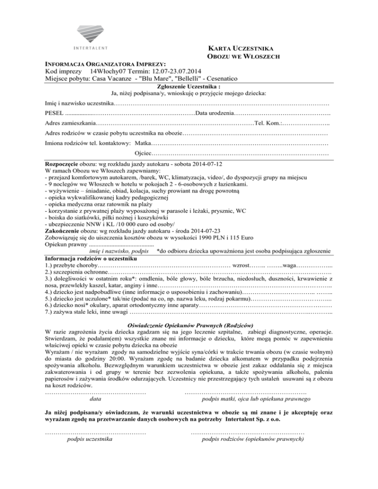 KARTA UCZESTNIKA OBOZU WE WŁOSZECH INFORMACJA ORGANIZATORA IMPREZY: Kod imprezy 14Włochy07 Termin: 12.07-23.07.2014 Miejsce pobytu: Casa Vacanze - "Blu Mare", "Bellelli" - Cesenatico Zgłoszenie Uczestnika : Ja, niżej podpisana/y, wnioskuję o przyjęcie mojego dziecka: Imię i nazwisko uczestnika………………………………………………………………………………………… PESEL ..................…………………………………………Data urodzenia………………………………………. Adres zamieszkania…………………………………………………………………Tel. Kom.:………………….. Adres rodziców w czasie pobytu uczestnika na obozie…………………………………………………………… Imiona rodziców tel. kontaktowy: Matka………………………………………………………………………… Ojciec………………………………………………………………………… Rozpoczęcie obozu: wg rozkładu jazdy autokaru - sobota 2014-07-12 W ramach Obozu we Włoszech zapewniamy: - przejazd komfortowym autokarem, /barek, WC, klimatyzacja, video/, do dyspozycji grupy na miejscu - 9 noclegów we Włoszech w hotelu w pokojach 2 - 6-osobowych z łazienkami. - wyżywienie – śniadanie, obiad, kolacja, suchy prowiant na drogę powrotną - opieka wykwalifikowanej kadry pedagogicznej - opieka medyczna oraz ratownik na plaży - korzystanie z prywatnej plaży wyposażonej w parasole i leżaki, prysznic, WC - boiska do siatkówki, piłki nożnej i koszykówki - ubezpieczenie NNW i KL /10 000 euro od osoby/ Zakończenie obozu: wg rozkładu jazdy autokaru - środa 2014-07-23 Zobowiązuję się do uiszczenia kosztów obozu w wysokości 1990 PLN i 115 Euro Opiekun prawny ......................................... imię i nazwisko, podpis *do odbioru dziecka upoważniona jest osoba podpisująca zgłoszenie Informacja rodziców o uczestniku 1.) przebyte choroby……………………………………………………… wzrost…….. ……..waga……………... 2.) szczepienia ochronne……………………………………………………………………………………………. 3.) dolegliwości w ostatnim roku*: omdlenia, bóle głowy, bóle brzucha, niedosłuch, duszności, krwawienie z nosa, przewlekły kaszel, katar, anginy i inne……………………………………………………………………….. 4.) dziecko jest nadpobudliwe (inne informacje o usposobieniu i zachowaniu)…………………………….. …….. 5.) dziecko jest uczulone* tak/nie (podać na co, np. nazwa leku, rodzaj pokarmu)………………………………... 6.) dziecko nosi* okulary, aparat ortodontyczny inne aparaty……………………………………………………… 7.) zażywa stale leki, inne uwagi …………………………………………………………………………..……….. Oświadczenie Opiekunów Prawnych (Rodziców) W razie zagrożenia życia dziecka zgadzam się na jego leczenie szpitalne, zabiegi diagnostyczne, operacje. Stwierdzam, że podałam(em) wszystkie znane mi informacje o dziecku, które mogą pomóc w zapewnieniu właściwej opieki w czasie pobytu dziecka na obozie Wyrażam / nie wyrażam zgody na samodzielne wyjście syna/córki w trakcie trwania obozu (w czasie wolnym) do miasta do godziny 20:00. Wyrażam zgodę na badanie dziecka alkomatem w przypadku podejrzenia spożywania alkoholu. Bezwzględnym warunkiem uczestnictwa w obozie jest zakaz oddalania się z miejsca zakwaterowania i od grupy w terenie bez zezwolenia opiekuna, a także spożywania alkoholu, palenia papierosów i zażywania środków odurzających. Uczestnicy nie przestrzegający tych ustaleń usuwani są z obozu na koszt rodziców. ………………………………………… …………………………………………………. data podpis matki, ojca lub opiekuna prawnego Ja niżej podpisana/y oświadczam, że warunki uczestnictwa w obozie są mi znane i je akceptuję oraz wyrażam zgodę na przetwarzanie danych osobowych na potrzeby Intertalent Sp. z o.o. ………………………………………… podpis uczestnika ……………………………………………… podpis rodziców (opiekunów prawnych)