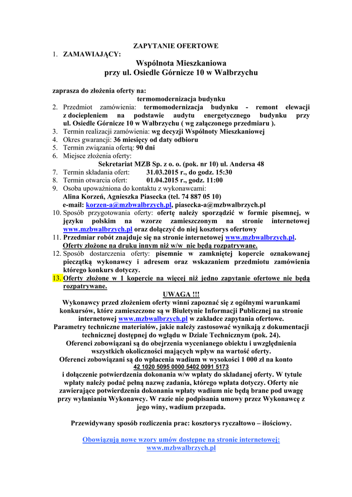ZAPYTANIE OFERTOWE 1. ZAMAWIAJĄCY: Wspólnota Mieszkaniowa przy ul. Osiedle Górnicze 10 w Wałbrzychu zaprasza do złożenia oferty na: termomodernizacja budynku 2. Przedmiot zamówienia: termomodernizacja budynku - remont elewacji z dociepleniem na podstawie audytu energetycznego budynku przy ul. Osiedle Górnicze 10 w Wałbrzychu ( wg załączonego przedmiaru ). 3. Termin realizacji zamówienia: wg decyzji Wspólnoty Mieszkaniowej 4. Okres gwarancji: 36 miesięcy od daty odbioru 5. Termin związania ofertą: 90 dni 6. Miejsce złożenia oferty: Sekretariat MZB Sp. z o. o. (pok. nr 10) ul. Andersa 48 7. Termin składania ofert: 31.03.2015 r., do godz. 15:30 8. Termin otwarcia ofert: 01.04.2015 r., godz. 11:00 9. Osoba upoważniona do kontaktu z wykonawcami: Alina Korzeń, Agnieszka Piasecka (tel. 74 887 05 10) e-mail: [email protected], [email protected] 10. Sposób przygotowania oferty: ofertę należy sporządzić w formie pisemnej, w języku polskim na wzorze zamieszczonym na stronie internetowej www.mzbwalbrzych.pl oraz dołączyć do niej kosztorys ofertowy 11. Przedmiar robót znajduje się na stronie internetowej www.mzbwalbrzych.pl. Oferty złożone na druku innym niż w/w nie będą rozpatrywane. 12. Sposób dostarczenia oferty: pisemnie w zamkniętej kopercie oznakowanej pieczątką wykonawcy i adresem oraz wskazaniem przedmiotu zamówienia którego konkurs dotyczy. 13. Oferty złożone w 1 kopercie na więcej niż jedno zapytanie ofertowe nie będą rozpatrywane. UWAGA !!! Wykonawcy przed złożeniem oferty winni zapoznać się z ogólnymi warunkami konkursów, które zamieszczone są w Biuletynie Informacji Publicznej na stronie internetowej www.mzbwalbrzych.pl w zakładce zapytania ofertowe. Parametry techniczne materiałów, jakie należy zastosować wynikają z dokumentacji technicznej dostępnej do wglądu w Dziale Technicznym (pok. 24). Oferenci zobowiązani są do obejrzenia wycenianego obiektu i uwzględnienia wszystkich okoliczności mających wpływ na wartość oferty. Oferenci zobowiązani są do wpłacenia wadium w wysokości 1 000 zł na konto 42 1020 5095 0000 5402 0091 5173 i dołączenie potwierdzenia dokonania w/w wpłaty do składanej oferty. W tytule wpłaty należy podać pełną nazwę zadania, którego wpłata dotyczy. Oferty nie zawierające potwierdzenia dokonania wpłaty wadium nie będą brane pod uwagę przy wyłanianiu Wykonawcy. W razie nie podpisania umowy przez Wykonawcę z jego winy, wadium przepada. Przewidywany sposób rozliczenia prac: kosztorys ryczałtowo – ilościowy. Obowiązują nowe wzory umów dostępne na stronie internetowej: www.mzbwalbrzych.pl