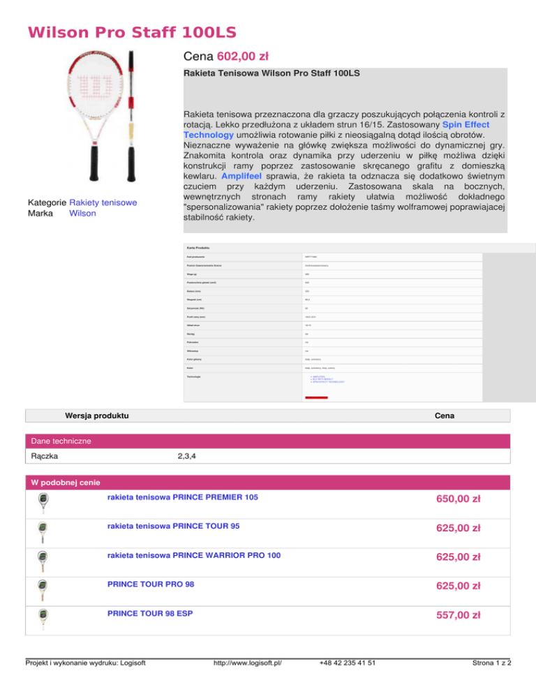 Wilson Pro Staff 100LS Cena 602,00 zł Rakieta Tenisowa Wilson Pro Staff 100LS Kategorie Rakiety tenisowe Marka Wilson Rakieta tenisowa przeznaczona dla grzaczy poszukujących połączenia kontroli z rotacją. Lekko przedłużona z układem strun 16/15. Zastosowany Spin Effect Technology umożliwia rotowanie piłki z nieosiągalną dotąd ilością obrotów. Nieznaczne wyważenie na główkę zwiększa możliwości do dynamicznej gry. Znakomita kontrola oraz dynamika przy uderzeniu w piłkę możliwa dzięki konstrukcji ramy poprzez zastosowanie skręcanego grafitu z domieszką kewlaru. Amplifeel sprawia, że rakieta ta odznacza się dodatkowo świetnym czuciem przy każdym uderzeniu. Zastosowana skala na bocznych, wewnętrznych stronach ramy rakiety ułatwia możliwość dokładnego "spersonalizowania" rakiety poprzez dołożenie taśmy wolframowej poprawiajacej stabilność rakiety. Karta Produktu Kod producenta WRT71990 Poziom Zaawansowania Gracza średniozaawansowany Waga (g) 285 Powierzchnia główki (cm2) 645 Balans (mm) 335 Długość (cm) 69,2 Sztywność (RA) 63 Profil ramy (mm) 19/21,5/21 Układ strun 16/15 Naciąg tak Pokrowiec nie Wibrastop nie Kolor główny biały, czerwony Kolor biały, czerwony, złoty, czarny Technologie AMPLIFEEL BLX WITH BASALT SPIN EFFECT TECHNOLOGY rakieta na zamówienia Wersja produktu Cena Dane techniczne Rączka 2,3,4 W podobnej cenie rakieta tenisowa PRINCE PREMIER 105 650,00 zł rakieta tenisowa PRINCE TOUR 95 625,00 zł rakieta tenisowa PRINCE WARRIOR PRO 100 625,00 zł PRINCE TOUR PRO 98 625,00 zł PRINCE TOUR 98 ESP 557,00 zł Projekt i wykonanie wydruku: Logisoft http://www.logisoft.pl/ +48 42 235 41 51 Strona 1 z 2 rakieta tenisowa BABOLAT PURE DRIVE 260 + torba tenisowa BABOLAT TEAM X6 Roland Garros+piłki tyger x-force Projekt i wykonanie wydruku: Logisoft Powered by TCPDF (www.tcpdf.org) http://www.logisoft.pl/ +48 42 235 41 51 619,00 zł Strona 2 z 2