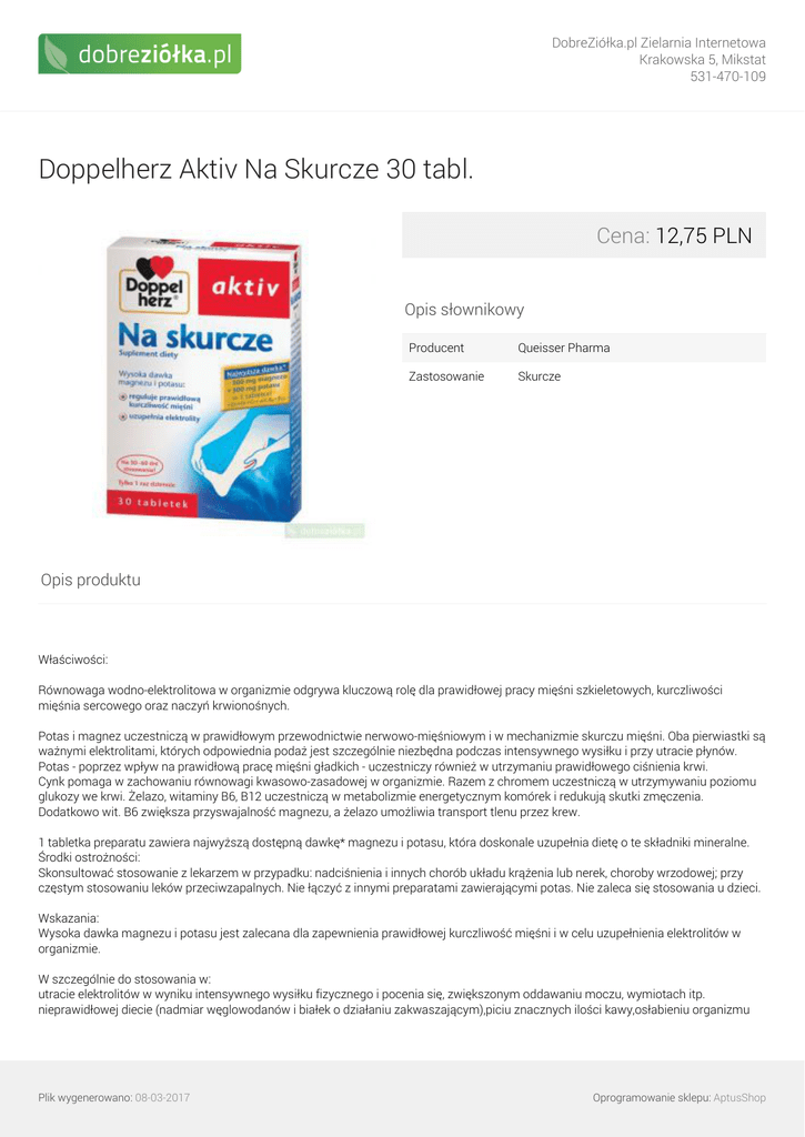 DobreZiółka.pl Zielarnia Internetowa Krakowska 5, Mikstat 531-470-109 Doppelherz Aktiv Na Skurcze 30 tabl. Cena: 12,75 PLN Opis słownikowy Producent Queisser Pharma Zastosowanie Skurcze Opis produktu Właściwości: Równowaga wodno-elektrolitowa w organizmie odgrywa kluczową rolę dla prawidłowej pracy mięśni szkieletowych, kurczliwości mięśnia sercowego oraz naczyń krwionośnych. Potas i magnez uczestniczą w prawidłowym przewodnictwie nerwowo-mięśniowym i w mechanizmie skurczu mięśni. Oba pierwiastki są ważnymi elektrolitami, których odpowiednia podaż jest szczególnie niezbędna podczas intensywnego wysiłku i przy utracie płynów. Potas - poprzez wpływ na prawidłową pracę mięśni gładkich - uczestniczy również w utrzymaniu prawidłowego ciśnienia krwi. Cynk pomaga w zachowaniu równowagi kwasowo-zasadowej w organizmie. Razem z chromem uczestniczą w utrzymywaniu poziomu glukozy we krwi. Żelazo, witaminy B6, B12 uczestniczą w metabolizmie energetycznym komórek i redukują skutki zmęczenia. Dodatkowo wit. B6 zwiększa przyswajalność magnezu, a żelazo umożliwia transport tlenu przez krew. 1 tabletka preparatu zawiera najwyższą dostępną dawkę* magnezu i potasu, która doskonale uzupełnia dietę o te składniki mineralne. Środki ostrożności: Skonsultować stosowanie z lekarzem w przypadku: nadciśnienia i innych chorób układu krążenia lub nerek, choroby wrzodowej; przy częstym stosowaniu leków przeciwzapalnych. Nie łączyć z innymi preparatami zawierającymi potas. Nie zaleca się stosowania u dzieci. Wskazania: Wysoka dawka magnezu i potasu jest zalecana dla zapewnienia prawidłowej kurczliwość mięśni i w celu uzupełnienia elektrolitów w organizmie. W szczególnie do stosowania w: utracie elektrolitów w wyniku intensywnego wysiłku fizycznego i pocenia się, zwiększonym oddawaniu moczu, wymiotach itp. nieprawidłowej diecie (nadmiar węglowodanów i białek o działaniu zakwaszającym),piciu znacznych ilości kawy,osłabieniu organizmu Plik wygenerowano: 08-03-2017 Oprogramowanie sklepu: AptusShop DobreZiółka.pl Zielarnia Internetowa Krakowska 5, Mikstat 531-470-109 (stany zmęczenie i znużenia). utracie elektrolitów w wyniku intensywnego wysiłku fizycznego i pocenia się, zwiększonym oddawaniu moczu, wymiotach itp. nieprawidłowej diecie (nadmiar węglowodanów i białek o działaniu zakwaszającym), piciu znacznych ilości kawy, osłabieniu organizmu (stany zmęczenie i znużenia).utracie elektrolitów w wyniku intensywnego wysiłku fizycznego i pocenia się,zwiększonym oddawaniu moczu, wymiotach itp.nieprawidłowej diecie (nadmiar węglowodanów i białek o działaniu zakwaszającym),piciu znacznych ilości kawy,osłabieniu organizmu (stany zmęczenie i znużenia) Zalecane dzienne spożycie: Stosować 1 tabletkę dziennie po posiłku, popijając dużą ilością płynu. Tabletkę można dzielić dla łatwiejszego połykania. Nie stosować na czczo. Przy długotrwałym stosowaniu (ponad 1 miesiąc) zaleca się ½ tabletki dziennie. Składniki: wodorowęglan potasu (diwęglan potasu), tlenek magnezu (Mg), dwutlenek krzemu (subst. przeciwzbrylająca), celuloza mikrokrystaliczna (substancja wypełniająca), mono- i diglicerydy kwasów tłuszczowych (emulgator), guma celulozowa usieciowana (stabilizator); celuloza sproszkowana i hydroksypropylometyloceluloza (subst. zagęszczające); poliwinylopirolidon (nośnik), siarczan cynku (Zn), sól wapniowa kwasów tłuszczowych (emulgator), dwutlenek tytanu (barwnik), szelak (subst. glazurująca), fumaran żelaza (II), talk (subst. przeciwzbrylająca), chlorowodorek pirydoksyny (wit. B6), olej z oliwek, cyjanokobalamina (wit. B12), chlorek chromu (III). Nie zawiera glutenu ani laktozy. Plik wygenerowano: 08-03-2017 Powered by TCPDF (www.tcpdf.org) Oprogramowanie sklepu: AptusShop