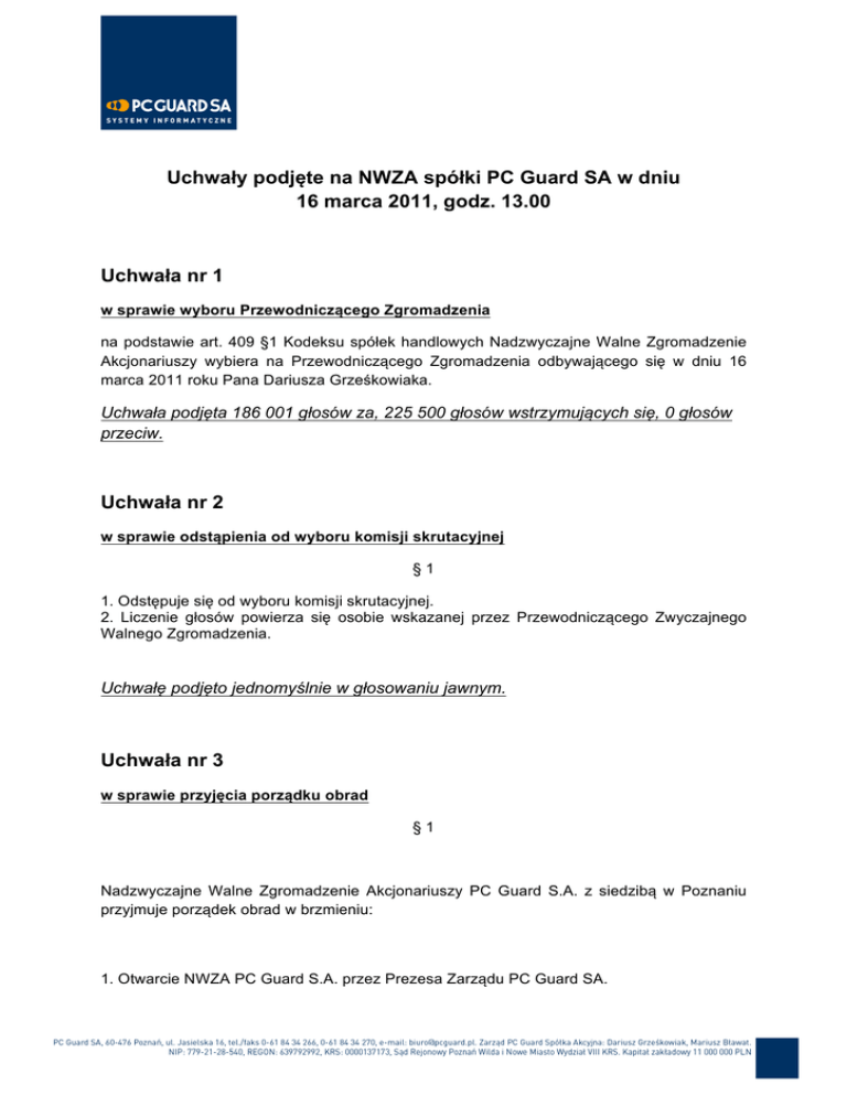 Uchwały podjęte na NWZA spółki PC Guard SA w dniu 16 marca 2011, godz. 13.00 Uchwała nr 1 w sprawie wyboru Przewodniczącego Zgromadzenia na podstawie art. 409 §1 Kodeksu spółek handlowych Nadzwyczajne Walne Zgromadzenie Akcjonariuszy wybiera na Przewodniczącego Zgromadzenia odbywającego się w dniu 16 marca 2011 roku Pana Dariusza Grześkowiaka. Uchwała podjęta 186 001 głosów za, 225 500 głosów wstrzymujących się, 0 głosów przeciw. Uchwała nr 2 w sprawie odstąpienia od wyboru komisji skrutacyjnej §1 1. Odstępuje się od wyboru komisji skrutacyjnej. 2. Liczenie głosów powierza się osobie wskazanej przez Przewodniczącego Zwyczajnego Walnego Zgromadzenia. Uchwałę podjęto jednomyślnie w głosowaniu jawnym. Uchwała nr 3 w sprawie przyjęcia porządku obrad §1 Nadzwyczajne Walne Zgromadzenie Akcjonariuszy PC Guard S.A. z siedzibą w Poznaniu przyjmuje porządek obrad w brzmieniu: 1. Otwarcie NWZA PC Guard S.A. przez Prezesa Zarządu PC Guard SA. 2. Wybór Przewodniczącego NWZA a) podjęcie uchwały w sprawie wyboru Przewodniczącego Zgromadzenia. 3. Stwierdzenie prawidłowości zwołania WZA oraz jego zdolności do podejmowania uchwał. 4. Podjęcie uchwały o odstąpieniu od wyboru komisji skrutacyjnej. 5. Przyjęcie porządku obrad WZA a) podjęcie uchwały w sprawie przyjęcia porządku obrad. 6. Podjęcie uchwał: a) w sprawie zmiany statutu Spółki PC Guard SA przewidującej upoważnienie zarządu Spółki do podwyższenia kapitału zakładowego w granicach kapitału docelowego; b) w sprawie zmiany statutu Spółki PC Guard SA przewidującej uprawnienie Spółki do emisji obligacji zamiennych; c) w sprawie emisji warrantów subskrypcyjnych, warunkowego podwyższenia kapitału zakładowego Spółki PC Guard SA w drodze emisji akcji serii F z wyłączeniem prawa poboru dotychczasowych akcjonariuszy oraz odpowiednich zmian statutu Spółki; d) Podjęcie uchwały w sprawie tekstu jednolitego Statutu. 7. Wolne głosy i wnioski. 8. Zamknięcie obrad. §2 Niniejsza uchwała wchodzi w życie z chwilą jej podjęcia Uchwała podjęta 410 500 głosów za, 0 głosów wstrzymujących się, 1001 głosów przeciw. Uchwała Nr 4 Nadzwyczajnego Walnego Zgromadzenia Spółki PC Guard S.A. (dalej: „Spółka PC Guard SA” lub „Spółka”) z siedzibą w Poznaniu, z dnia 16 marca 2011 roku w sprawie zmiany statutu Spółki PC Guard SA przewidującej upoważnienie zarządu Spółki PC Gurd SA do podwyższenia kapitału zakładowego w granicach kapitału docelowego wraz z upoważnieniem Zarządu do pozbawienia akcjonariuszy prawa poboru warrantów subskrypcyjnych oraz akcji emitowanych w ramach kapitału docelowego. 1. Nadzwyczajne Walne Zgromadzenie Akcjonariuszy dokonuje niniejszym zmiany Statutu Spółki PC Guard SA w zakresie wprowadzenia upoważnienia zarządu Spółki do podwyższenia kapitału zakładowego Spółki PC Guard SA w granicach kapitału docelowego w następujący sposób: a) w punkcie III Statutu dodaje się pkt. 4a w następującym brzmieniu: „4a. Zarząd jest upoważniony do dokonania jednego lub kilku podwyższeń kapitału zakładowego Spółki o kwotę nie większą niż 8 250 000,00 (słownie: osiem milionów dwieście pięćdziesiąt tysięcy) złotych poprzez emisję nie więcej niż 8 250 000 (słownie: osiem milionów dwieście pięćdziesiąt tysięcy) akcji zwykłych na okaziciela (Kapitał Docelowy), na następujących zasadach: a) Zarząd może wykonać przyznane mu upoważnienie przez dokonanie jednego albo kilku kolejnych podwyższeń kapitału zakładowego w granicach Kapitału Docelowego; b) podwyższenie kapitału zakładowego w ramach Kapitału Docelowego Zarząd może przeprowadzić poprzez emisję warrantów subskrypcyjnych, z terminem wykonywania prawa zapisu upływającym nie później niż okres, o którym mowa w lit. c) poniżej; warranty subskrypcyjne emitowane na zasadzie określonej w niniejszej lit. b) mogą być odpłatne lub nieodpłatne; Zarząd jest upoważniony do ustalenia ceny emisyjnej warrantów subskrypcyjnych; c) upoważnienie określone w niniejszym ustępie, zostało udzielone na okres nie dłuższy niż 3 lata licząc od dnia wpisu do rejestru zmiany Statutu w zakresie określonym niniejszym punktem; d) akcje wydane w ramach Kapitału Docelowego mogą być obejmowane w zamian za wkłady pieniężne lub niepieniężne; e) cenę emisyjną akcji wydawanych w ramach Kapitału Docelowego ustali Zarząd w uchwale o podwyższeniu kapitału zakładowego w ramach niniejszego upoważnienia; w powyższej sprawie zgoda Rady Nadzorczej nie jest wymagana, z zastrzeżeniem lit. g) poniżej; f) uchwała Zarządu podjęta w ramach statutowego upoważnienia udzielonego w niniejszym artykule zastępuje uchwałę Walnego Zgromadzenia w sprawie podwyższenia kapitału zakładowego; g) Zarząd samodzielnie decyduje o wszystkich sprawach związanych z podwyższeniem kapitału w ramach Kapitału Docelowego, z zastrzeżeniem postanowień niniejszego pkt 4a; h) Zarząd jest upoważniony za zgodą Rady Nadzorczej, do wydania akcji w zamian za wkład niepieniężny; ustalenie przez Zarząd ceny emisyjnej akcji wydawanych za wkład niepieniężny wymaga zgody Rady Nadzorczej; i) Zarząd jest upoważniony, za zgodą Rady Nadzorczej, do pozbawienia dotychczasowych akcjonariuszy prawa poboru w całości lub w części.” 2. Nadzwyczajne Walne Zgromadzenie Akcjonariuszy Spółki ustala, iż warranty subskrypcyjne emitowane w ramach kapitału docelowego, zgodnie z upoważnieniem Statutu Spółki, powołanym w pkt 1 mogą zostać zbyte, wyłącznie po uprzednim udzieleniu w tym przedmiocie pisemnej zgody przez Zarząd Spółki. 3. Nadzwyczajne Walne Zgromadzenie Akcjonariuszy Spółki ustala, iż w ramach kapitału docelowego, zgodnie z upoważnieniem Statutu Spółki, powołanym w pkt 1 zostaną wyemitowane akcje po cenie emisyjnej nie większej niż 2.69 zł (słownie: dwa złote sześćdziesiąt dziewięć gruszy). 4. Nadzwyczajne Waln