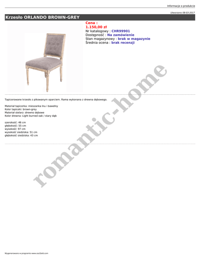 Informacje o produkcie Utworzono 08-03-2017 Krzesło ORLANDO BROWN-GREY Cena : 1.150,00 zł ho m e Nr katalogowy : CHR99901 Dostępność : Na zamówienie Stan magazynowy : brak w magazynie Średnia ocena : brak recenzji ro m an szerokość: 46 cm głębokość: 55 cm wysokość: 97 cm wysokość siedziska: 51 cm głębokość siedziska: 43 cm ti Materiał tapicerka: mieszanka lnu i bawełny Kolor tapiceki: brown-grey Materiał stelarz: drewno dębowe Kolor drewna: Light burned oak / stary dąb c- Tapicerowane krzesło z pikowanym oparciem. Rama wykonana z drewna dębowego. Wygenerowano w programie www.oscGold.com