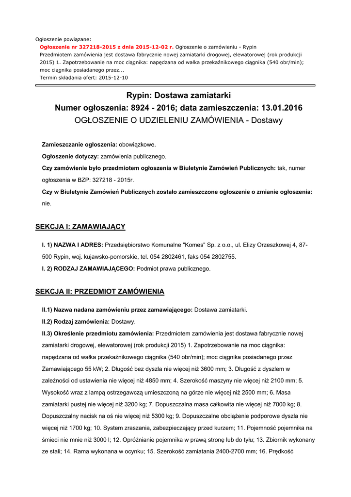 Ogłoszenie powiązane: Ogłoszenie nr 327218-2015 z dnia 2015-12-02 r. Ogłoszenie o zamówieniu - Rypin Przedmiotem zamówienia jest dostawa fabrycznie nowej zamiatarki drogowej, elewatorowej (rok produkcji 2015) 1. Zapotrzebowanie na moc ciągnika: napędzana od wałka przekaźnikowego ciągnika (540 obr/min); moc ciągnika posiadanego przez... Termin składania ofert: 2015-12-10 Rypin: Dostawa zamiatarki Numer ogłoszenia: 8924 - 2016; data zamieszczenia: 13.01.2016 OGŁOSZENIE O UDZIELENIU ZAMÓWIENIA - Dostawy Zamieszczanie ogłoszenia: obowiązkowe. Ogłoszenie dotyczy: zamówienia publicznego. Czy zamówienie było przedmiotem ogłoszenia w Biuletynie Zamówień Publicznych: tak, numer ogłoszenia w BZP: 327218 - 2015r. Czy w Biuletynie Zamówień Publicznych zostało zamieszczone ogłoszenie o zmianie ogłoszenia: nie. SEKCJA I: ZAMAWIAJĄCY I. 1) NAZWA I ADRES: Przedsiębiorstwo Komunalne "Komes" Sp. z o.o., ul. Elizy Orzeszkowej 4, 87500 Rypin, woj. kujawsko-pomorskie, tel. 054 2802461, faks 054 2802755. I. 2) RODZAJ ZAMAWIAJĄCEGO: Podmiot prawa publicznego. SEKCJA II: PRZEDMIOT ZAMÓWIENIA II.1) Nazwa nadana zamówieniu przez zamawiającego: Dostawa zamiatarki. II.2) Rodzaj zamówienia: Dostawy. II.3) Określenie przedmiotu zamówienia: Przedmiotem zamówienia jest dostawa fabrycznie nowej zamiatarki drogowej, elewatorowej (rok produkcji 2015) 1. Zapotrzebowanie na moc ciągnika: napędzana od wałka przekaźnikowego ciągnika (540 obr/min); moc ciągnika posiadanego przez Zamawiającego 55 kW; 2. Długość bez dyszla nie więcej niż 3600 mm; 3. Długość z dyszlem w zależności od ustawienia nie więcej niż 4850 mm; 4. Szerokość maszyny nie więcej niż 2100 mm; 5. Wysokość wraz z lampą ostrzegawczą umieszczoną na górze nie więcej niż 2500 mm; 6. Masa zamiatarki pustej nie więcej niż 3200 kg; 7. Dopuszczalna masa całkowita nie więcej niż 7000 kg; 8. Dopuszczalny nacisk na oś nie więcej niż 5300 kg; 9. Dopuszczalne obciążenie podporowe dyszla nie więcej niż 1700 kg; 10. System zraszania, zabezpieczający przed kurzem; 11. Pojemność pojemnika na śmieci nie mnie niż 3000 l; 12. Opróżnianie pojemnika w prawą stronę lub do tyłu; 13. Zbiornik wykonany ze stali; 14. Rama wykonana w ocynku; 15. Szerokość zamiatania 2400-2700 mm; 16. Prędkość zamiatania do 20 km/godz.; 17. Szczotki talerzowe stalowe o średnicy min 1000 mm; 18. Szczotka walcowa stalowa - włosie mix tworzywo sztuczne z drutem nabite na rurze z tworzywa sztucznego; 19. Długość szczotki walcowej min 1100 mm; 20. Układ hydrauliczny umożliwiający zmianę kata pochylenia prawej i lewej szczotki talerzowej, 21. Regulowanie zawieszenia szczotek; 22. Transporter z napędem hydraulicznym, osobne podnoszenie obniżanie podnośnika, wysokość listew zgarniających min 65 mm; 23. Instalacja wodna: zbiornik na wodę o pojemności min 1100 l, pompa wodna o wydajności min 30 l/min, pompa zabezpieczona przed pracą na sucho; 24. Instalacja hydrauliczna: pompa hydrauliczna z multiplikatorem zakładanym na WOM, obroty wałka 540 obr/minutę, wydajność pompy co najmniej 100 l/minutę, posiadająca czujnik informujący o zbyt niskim poziomie oleju hydraulicznego w układzie; 25. Instalacja elektryczna 12 V; 26. Pulpit sterujący wszystkimi operacjami zamiatania z kabiny kierowcy tj.: włączenie i wyłączenie funkcji zamiatania, załączanie pompy wodnej, regulacja obrotów szczotek talerzowych, hydrauliczne przesuwanie dyszla w prawo, licznik roboczogodzin; 27. Prędkość transportowa do 25 km/godz.; 28. Układ hamulcowy pneumatyczny; 29. Błotniki; 30. Oświetlenie ostrzegawcze wraz ze znakiem nakazu (C9 lub C10) montowane z tyłu; 31. Lampa ostrzegawcza błyskowa pomarańczowa na górze zamiatarki; 32. Podpora postojowa o zmiennej wysokości; 33. Oświetlenie tylne pozwalające na poruszanie się po drogach publicznych; 34. Zapasowy komplet szczotek (2 szt. talerzowych i 1 szt. walcowej); 35. Dokumenty pozwalające na rejestrację zamiatarki na terytorium RP; 36. Czas fizyczny reakcji serwisu w okresie gwarancji tj. przyjazd na miejsce awarii do 8 godzin od zgłoszenia faxem, telefonicznie; usunięcie awarii do 3 dni roboczych od zgłoszenia; 37. Wykonawca w ramach zamówienie przeszkoli min. dwie osoby wskazane przez Zamawiającego do obsługi; 38. Odbiór oraz pierwsze uruchomienie zostanie dokonane w siedzibie Zamawiającego bez ponoszenia przez Zamawiającego dodatkowych kosztów.. II.4) Wspólny Słownik Zamówień (CPV): 34.92.11.00-0, 34.92.12.00-1. SEKCJA III: PROCEDURA III.1) TRYB UDZIELENIA ZAMÓWIENIA: Przetarg nieograniczony III.2) INFORMACJE ADMINISTRACYJNE Zamówienie dotyczy projektu/programu finansowanego ze środków Unii Europejskiej: nie SEKCJA IV: UDZIELENIE ZAMÓWIENIA IV.1) DATA UDZIELENIA ZAMÓWIENIA: 11.01.2016. IV.2) LICZBA OTRZYMANYCH OFERT: 2. IV.3) LICZBA ODRZUCONYCH OFERT: 0. IV.4) NAZWA I ADRES WYKONAWCY, KTÓREMU UDZIELONO ZAMÓWIENIA: Narolco sp. z o.o., ul. Dojazdowa 11, 87-500 Rypin, kraj/woj. kujawsko-pomorskie. IV.5) Szacunkowa wartość zamówienia (bez VAT): 150000,00 PLN. IV.6) INFORMACJA O CENIE WYBRANEJ OFERTY ORAZ O OFERTACH Z NAJNIŻSZĄ I NAJWYŻSZĄ CENĄ Cena wybranej oferty: 180195,00 Oferta z najniższą ceną: 164082,00 / Oferta z najwyższą ceną: 180195,00 Waluta: PLN .