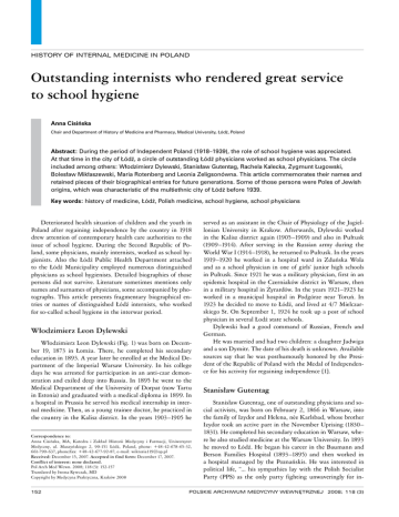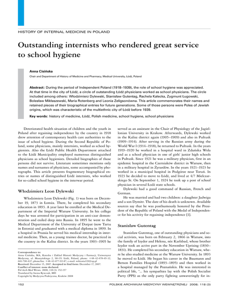 HISTORY OF INTERNAL MEDICINE IN POLAND Outstanding internists who rendered great service to school hygiene Anna Cisińska Chair and Department of History of Medicine and Pharmacy, Medical University, Łódź, Poland Abstract: During the period of Independent Poland (1918–1939), the role of school hygiene was appreciated. At that time in the city of Łódź, a circle of outstanding Łódź physicians worked as school physicians. The circle included among others: Włodzimierz Dylewski, Stanisław Gutentag, Rachela Kalecka, Zygmunt Ługowski, Bolesław Mikłaszewski, Maria Rotenberg and Leonia Zeligsonówna. This article commemorates their names and retained pieces of their biographical entries for future generations. Some of those persons were Poles of Jewish origins, which was characteristic of the multiethnic city of Łódź before 1939. Key words: history of medicine, Łódź, Polish medicine, school hygiene, school physicians Deteriorated health situation of children and the youth in Poland after regaining independence by the country in 1918 drew attention of contemporary health care authorities to the issue of school hygiene. During the Second Republic of Poland, some physicians, mainly internists, worked as school hygienists. Also the Łódź Public Health Department attached to the Łódź Municipality employed numerous distinguished physicians as school hygienists. Detailed biographies of those persons did not survive. Literature sometimes mentions only names and surnames of physicians, some accompanied by photographs. This article presents fragmentary biographical entries or names of distinguished Łódź internists, who worked for so-called school hygiene in the interwar period. Włodzimierz Leon Dylewski Włodzimierz Leon Dylewski (Fig. 1) was born on December 19, 1873 in Łomża. There, he completed his secondary education in 1893. A year later he enrolled at the Medical Department of the Imperial Warsaw University. In his college days he was arrested for participation in an anti-czar demonstration and exiled deep into Russia. In 1895 he went to the Medical Department of the University of Dorpat (now Tartu in Estonia) and graduated with a medical diploma in 1899. In a hospital in Prussia he served his medical internship in internal medicine. Then, as a young trainee doctor, he practiced in the country in the Kalisz district. In the years 1903–1905 he Correspondence to: Anna Cisińska, MA, Katedra i Zakład Historii Medycyny i Farmacji, Uniwersytet Medyczny, ul. Muszyńskiego 2, 90-151 Łódź, Poland, phone: +48-42-678-65-32, 661-790-637, phone/fax: +48-42-677-92-87, e-mail: [email protected] Received: December 15, 2007. Accepted in find form: December 17, 2007. Conflict of interest: none declared. Pol Arch Med Wewn. 2008; 118 (3): 152-157 Translated by Iwona Rywczak, MD Copyright by Medycyna Praktyczna, Kraków 2008 152 served as an assistant in the Chair of Physiology of the Jagiellonian University in Krakow. Afterwards, Dylewski worked in the Kalisz district again (1905–1909) and also in Pułtusk (1909–1914). After serving in the Russian army during the World War I (1914–1918), he returned to Pułtusk. In the years 1919–1920 he worked in a hospital ward in Zduńska Wola and as a school physician in one of girls’ junior high schools in Pułtusk. Since 1921 he was a military physician, first in an epidemic hospital in the Czerniaków district in Warsaw, then in a military hospital in Żyrardów. In the years 1921–1923 he worked in a municipal hospital in Podgórze near Toruń. In 1923 he decided to move to Łódź, and lived at 4/7 Mielczarskiego St. On September 1, 1924 he took up a post of school physician in several Łodź state schools. Dylewski had a good command of Russian, French and German. He was married and had two children: a daughter Jadwiga and a son Dymitr. The date of his death is unknown. Available sources say that he was posthumously honored by the President of the Republic of Poland with the Medal of Independence for his activity for regaining independence [1]. Stanisław Gutentag Stanisław Gutentag, one of outstanding physicians and social activists, was born on February 2, 1866 in Warsaw, into the family of Izydor and Helena, nèe Karlsbad, whose brother Izydor took an active part in the November Uprising (1830– 1831). He completed his secondary education in Warsaw, where he also studied medicine at the Warsaw University. In 1893 he moved to Łódź. He began his career in the Baumann and Berson Families Hospital (1893–1895) and then worked in a hospital managed by the Poznańskis. He was interested in political life, “... his sympathies lay with the Polish Socialist Party (PPS) as the only party fighting unwaveringly for in- POLSKIE ARCHIWUM MEDYCYNY WEWNĘTRZNEJ 2008; 118 (3) HISTORY OF INTERNAL MEDICINE IN POLAND Fig. 1. Włodzimierz Leon Dylewski (reproduced from: Akta osobiste Włodzimierza Dylewskiego, sygn. 5586, k.1, Archiwum Państwowe w Łodzi) dependence of his homeland”. Instructed by the PPS, he hid several (2 or 3) fighters carried away from the Pawiak prison in Warsaw by Col Jur Gorzechowski (initially in his own flat at 40 Cegielniana St. in Łódź and then in a mental hospital in Kochanówka) [2]. In October 1918, he started working as a school physician and since March 1919 he took the duties of the head school physician. In May 1922, on his initiative, a special outpatient clinic for children with trachoma was opened, and in November 1922, in Łódź, the first in Poland schools for children with trachoma were established. In 1923, Gutentag organized courses in anatomy, physiology and hygiene for school hygienists. Two years later (1925) he prepared and conducted a survey concerning alcohol consumption among children from common schools. The questionnaire to be filled in, titled Questionnaire on alcohol experience of children from urban elementary schools, was as follows [3]: 1. Have you ever drunk vodka, wine or
