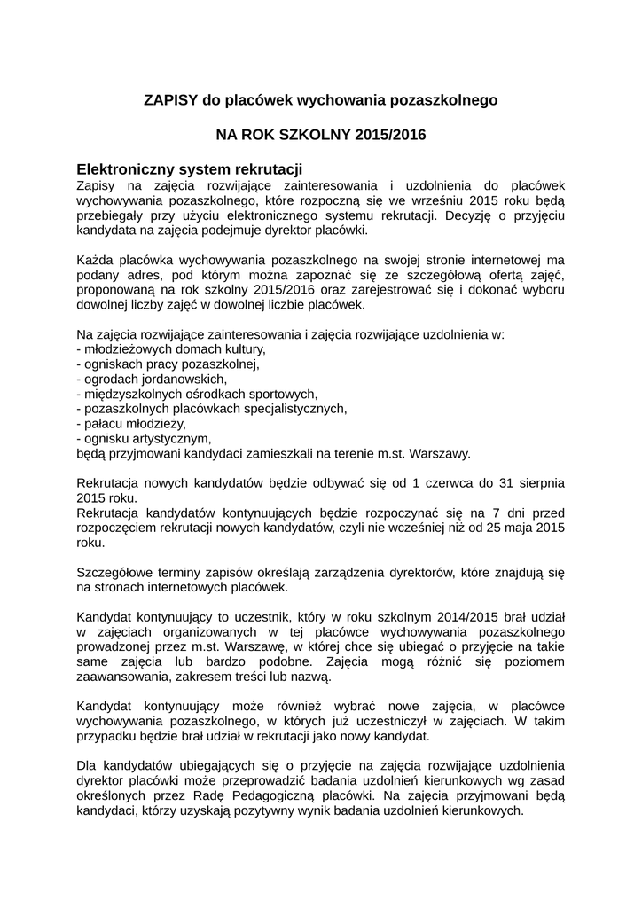 ZAPISY do placówek wychowania pozaszkolnego NA ROK SZKOLNY 2015/2016 Elektroniczny system rekrutacji Zapisy na zajęcia rozwijające zainteresowania i uzdolnienia do placówek wychowywania pozaszkolnego, które rozpoczną się we wrześniu 2015 roku będą przebiegały przy użyciu elektronicznego systemu rekrutacji. Decyzję o przyjęciu kandydata na zajęcia podejmuje dyrektor placówki. Każda placówka wychowywania pozaszkolnego na swojej stronie internetowej ma podany adres, pod którym można zapoznać się ze szczegółową ofertą zajęć, proponowaną na rok szkolny 2015/2016 oraz zarejestrować się i dokonać wyboru dowolnej liczby zajęć w dowolnej liczbie placówek. Na zajęcia rozwijające zainteresowania i zajęcia rozwijające uzdolnienia w: - młodzieżowych domach kultury, - ogniskach pracy pozaszkolnej, - ogrodach jordanowskich, - międzyszkolnych ośrodkach sportowych, - pozaszkolnych placówkach specjalistycznych, - pałacu młodzieży, - ognisku artystycznym, będą przyjmowani kandydaci zamieszkali na terenie m.st. Warszawy. Rekrutacja nowych kandydatów będzie odbywać się od 1 czerwca do 31 sierpnia 2015 roku. Rekrutacja kandydatów kontynuujących będzie rozpoczynać się na 7 dni przed rozpoczęciem rekrutacji nowych kandydatów, czyli nie wcześniej niż od 25 maja 2015 roku. Szczegółowe terminy zapisów określają zarządzenia dyrektorów, które znajdują się na stronach internetowych placówek. Kandydat kontynuujący to uczestnik, który w roku w zajęciach organizowanych w tej placówce prowadzonej przez m.st. Warszawę, w której chce same zajęcia lub bardzo podobne. Zajęcia zaawansowania, zakresem treści lub nazwą. szkolnym 2014/2015 brał udział wychowywania pozaszkolnego się ubiegać o przyjęcie na takie mogą różnić się poziomem Kandydat kontynuujący może również wybrać nowe zajęcia, w placówce wychowywania pozaszkolnego, w których już uczestniczył w zajęciach. W takim przypadku będzie brał udział w rekrutacji jako nowy kandydat. Dla kandydatów ubiegających się o przyjęcie na zajęcia rozwijające uzdolnienia dyrektor placówki może przeprowadzić badania uzdolnień kierunkowych wg zasad określonych przez Radę Pedagogiczną placówki. Na zajęcia przyjmowani będą kandydaci, którzy uzyskają pozytywny wynik badania uzdolnień kierunkowych. W postępowaniu rekrutacyjnym do placówek wychowania pozaszkolnego na rok szkolny 2015/2016 obowiązują: KRYTERIA USTAWOWE W przypadku większej liczby chętnych niż miejsc brane będą pod uwagę kryteria określone w art. 20c ust. 2 ustawy z dnia 7 września 1991 r. o systemie oświaty tj.: Wielodzietność rodziny kandydata - 2 pkt; Niepełnosprawność kandydata - 2 pkt; Niepełnosprawność jednego z rodziców kandydata - 2 pkt; Niepełnosprawność obojga rodziców kandydata - 2 pkt; Niepełnosprawność rodzeństwa kandydata - 2 pkt; Samotne wychowywanie kandydata w rodzinie - 2 pkt; Objęcie kandydata pieczą zastępczą - 2 pkt; KRYTERIA MIEJSKIE W przypadku, równorzędnych wyników uzyskanych przez kandydatów po pierwszym etapie postępowania rekrutacyjnego, na drugim etapie postępowania rekrutacyjnego brane są pod uwagę kryteria określone przez organ prowadzący zgodnie z § 1 uchwały Nr VII/128/2015 Rady Miasta Stołecznego Warszawy z dnia 12 marca 2015 r. w sprawie określenia kryteriów rekrutacji na zajęcia rozwijające zainteresowania lub rozwijające uzdolnienia organizowane w placówkach oświatowo – wychowawczych prowadzonych przez m.st. Warszawę, liczby punktów za każde z tych kryteriów i dokumentów niezbędnych do ich potwierdzenia tj.: - kandydat, którego rodzice/opiekunowie prawni albo rodzic/opiekun prawny mieszkają w m.st. Warszawie i rozliczają podatek dochodowy od osób fizycznych w urzędzie skarbowym na terenie m.st. Warszawy lub kandydat mieszkający na terenie m.st. Warszawy i rozliczający podatek dochodowy od osób fizycznych w urzędzie skarbowym na terenie m.st. Warszawy - 2 pkt; - uczestnictwo kandydata w roku szkolnym poprzedzającym postępowanie rekrutacyjne: - w podobnych zajęciach organizowanych w placówkach oświatowowychowawczych, instytucjach kultury lub ośrodkach sportu i rekreacji prowadzonych przez m.st. Warszawa - 1 pkt, - w podobnych zajęciach organizowanych w szkole w ramach kół zainteresowań – 1 pkt, - w innych zajęciach w tej samej placówce oświatowo-wychowawczej - 1 pkt; - kandydat ma rodzeństwo uczęszczające do przedszkoli, szkół i placówek oświatowo –wychowawczych na terenie m.st. Warszawy – 2 pkt. STRONY INTERNETOWE PLACÓWEK WYCHOWANIA POZASZKOLNEGO Lp 1 Placówka Pałac Młodzieży www www.pm.waw.pl 2 Stołeczne Centrum Edukacji Kulturalnej www.scek.pl 3 Bielańskie Centrum Edukacji Kulturalnej www.centrumszegedynska9a.pl 4 www.mdk.waw.pl 5 Młodzieżowy Dom Kultury im. W. Broniewskiego „ŁAZIENKOWSKA” Młodzieżowy Dom Kultury Mokotów 6 Młodzieżowy Dom Kultury Bielany www.mdkbielany.pl 7 Młodzieżowy Dom Kultury „Muranów” im. Cypriana Kamila Norwida www.mdk-muranow.waw.pl 8 mdk-mokotow.pl/dom-kultury mdkochota.edu.pl 9 Młodzieżowy Dom Kultury „Ochota” Młodzieżowy Dom Kultury im. Marii Gwizdak www.mdkandersena.pl 10 Ognisko Pracy Pozaszkolnej nr 1 www.opp1.waw.pl 11 Ognisko Pracy Pozaszkolnej nr 2 www.opp2.waw.pl 12 www.opp3.waw.pl Ognisko Pracy Pozaszkolnej nr 3 13 www.opp4.waw.pl 14 Ognisko Pracy Pozaszkolnej nr 4 Ognisko Pracy Pozaszkolnej „175” www.ognisko175.edu.pl 15 Ognisko Pracy Pozaszkolnej „Żoliborz” www.oppzoliborz.waw.pl 16 Ognisko Pracy Pozaszkolnej przy SP 70 www.opp70.szkolnastrona.pl 17 Ognisko Pracy Pozaszkolnej przy SP 264 www.sp264.internetdsl.pl 18 II Ogród Jordanowski www.ogrodjordanowski.pl 19 III Ogród Jordanowski www.ogrodjordanowski3.szkolnastrona.pl 20 VII Ogród Jordanowski oj7.szkolnastrona.pl 21 VIII Ogród Jordanowski www.oj8.edu.pl 22 www.zwpek.pl Zespół Wolskich Placówek Edukacji Kulturalnej 23 24 mos2.pl Mi