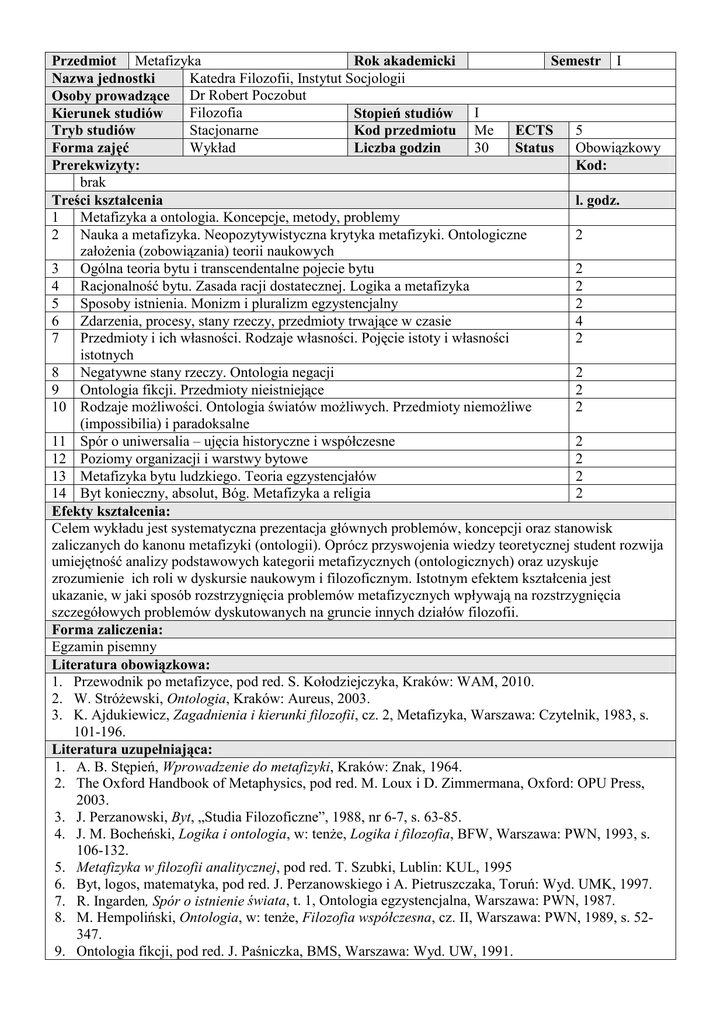 Przedmiot Metafizyka Rok akademicki Semestr I Katedra Filozofii, Instytut Socjologii Nazwa jednostki Osoby prowadzące Dr Robert Poczobut Filozofia Kierunek studiów Stopień studiów I Stacjonarne 5 Tryb studiów Kod przedmiotu Me ECTS Wykład 30 Forma zajęć Liczba godzin Status Obowiązkowy Prerekwizyty: Kod: brak Treści kształcenia l. godz. 1 Metafizyka a ontologia. Koncepcje, metody, problemy 2 Nauka a metafizyka. Neopozytywistyczna krytyka metafizyki. Ontologiczne 2 założenia (zobowiązania) teorii naukowych 3 Ogólna teoria bytu i transcendentalne pojecie bytu 2 4 Racjonalność bytu. Zasada racji dostatecznej. Logika a metafizyka 2 5 Sposoby istnienia. Monizm i pluralizm egzystencjalny 2 6 Zdarzenia, procesy, stany rzeczy, przedmioty trwające w czasie 4 7 Przedmioty i ich własności. Rodzaje własności. Pojęcie istoty i własności 2 istotnych 8 Negatywne stany rzeczy. Ontologia negacji 2 9 Ontologia fikcji. Przedmioty nieistniejące 2 10 Rodzaje możliwości. Ontologia światów możliwych. Przedmioty niemożliwe 2 (impossibilia) i paradoksalne 11 Spór o uniwersalia – ujęcia historyczne i współczesne 2 12 Poziomy organizacji i warstwy bytowe 2 13 Metafizyka bytu ludzkiego. Teoria egzystencjałów 2 14 Byt konieczny, absolut, Bóg. Metafizyka a religia 2 Efekty kształcenia: Celem wykładu jest systematyczna prezentacja głównych problemów, koncepcji oraz stanowisk zaliczanych do kanonu metafizyki (ontologii). Oprócz przyswojenia wiedzy teoretycznej student rozwija umiejętność analizy podstawowych kategorii metafizycznych (ontologicznych) oraz uzyskuje zrozumienie ich roli w dyskursie naukowym i filozoficznym. Istotnym efektem kształcenia jest ukazanie, w jaki sposób rozstrzygnięcia problemów metafizycznych wpływają na rozstrzygnięcia szczegółowych problemów dyskutowanych na gruncie innych działów filozofii. Forma zaliczenia: Egzamin pisemny Literatura obowiązkowa: 1. Przewodnik po metafizyce, pod red. S. Kołodziejczyka, Kraków: WAM, 2010. 2. W. Stróżewski, Ontologia, Kraków: Aureus, 2003. 3. K. Ajdukiewicz, Zagadnienia i kierunki filozofii, cz. 2, Metafizyka, Warszawa: Czytelnik, 1983, s. 101-196. Literatura uzupełniająca: 1. A. B. Stępień, Wprowadzenie do metafizyki, Kraków: Znak, 1964. 2. The Oxford Handbook of Metaphysics, pod red. M. Loux i D. Zimmermana, Oxford: OPU Press, 2003. 3. J. Perzanowski, Byt, „Studia Filozoficzne”, 1988, nr 6-7, s. 63-85. 4. J. M. Bocheński, Logika i ontologia, w: tenże, Logika i filozofia, BFW, Warszawa: PWN, 1993, s. 106-132. 5. Metafizyka w filozofii analitycznej, pod red. T. Szubki, Lublin: KUL, 1995 6. Byt, logos, matematyka, pod red. J. Perzanowskiego i A. Pietruszczaka, Toruń: Wyd. UMK, 1997. 7. R. Ingarden, Spór o istnienie świata, t. 1, Ontologia egzystencjalna, Warszawa: PWN, 1987. 8. M. Hempoliński, Ontologia, w: tenże, Filozofia współczesna, cz. II, Warszawa: PWN, 1989, s. 52347. 9. Ontologia fikcji, pod red. J. Paśniczka, BMS, Warszawa: Wyd. UW, 1991. 10. S. Swieżawski, Istnienie i tajemnica, Lublin: RW KUL, 1993. 11. M. A. Krąpiec, Metafizyka, Lublin: TN KUL, 1988. 12. J. Wojtysiak, Dlaczego istnieje raczej coś niż nic?, Lublin: TN KUL, 2008. 13. B. Wolniewicz, Ontologia sytuacji, Warszawa: PWN, 1985. 14. J. M. Bocheński, Zagadnienie powszechników, tłum. T. Baszniak, w: tenże, Logika i filozofia, BWF, Warszawa: PWN, 1993, s. 79-105. 15. U. Żegleń, Modalność w logice i filozofii, BMS, Warszawa: Wyd. UW, 1990. 16. L. Nowak: Byt i myśl, t.1. Poznań: Zysk i S-ka, 1998. 17. 3. N. Hartmann: O podstawach ontologii. Cele i drogi analizy kategorialnej. Toruń: Wyd. Comer, 1994. 18. M. Heidegger, Bycie i czas, tłum. B. Baran, Warszawa: PWN, 2008. Podpis osób prowadzących: Podpis kierownika jednostki:
