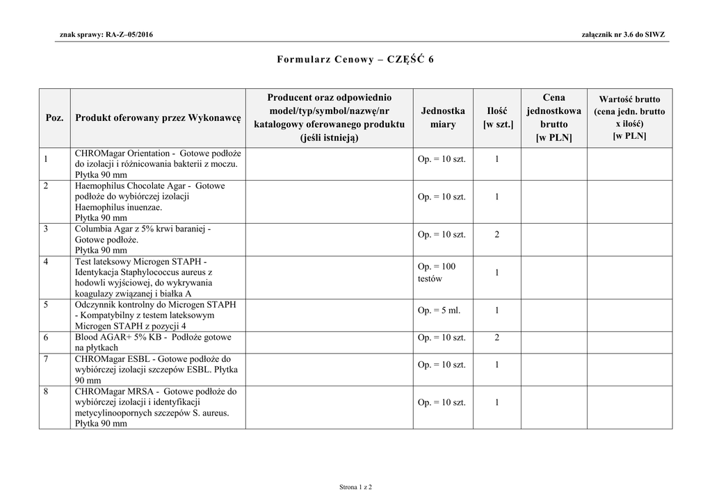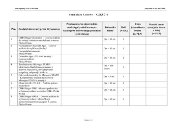 znak sprawy: RA-Z–05/2016 załącznik nr 3.6 do SIWZ Formularz Cenowy – CZĘŚĆ 6 Poz. 1 2 3 4 5 6 7 8 Produkt oferowany przez Wykonawcę Producent oraz odpowiednio model/typ/symbol/nazwę/nr katalogowy oferowanego produktu (jeśli istnieją) CHROMagar Orientation - Gotowe podłoże do izolacji i różnicowania bakterii z moczu. Płytka 90 mm Haemophilus Chocolate Agar - Gotowe podłoże do wybiórczej izolacji Haemophilus inuenzae. Płytka 90 mm Columbia Agar z 5% krwi baraniej Gotowe podłoże. Płytka 90 mm Test lateksowy Microgen STAPH Identykacja Staphylococcus aureus z hodowli wyjściowej, do wykrywania koagulazy związanej i białka A Odczynnik kontrolny do Microgen STAPH - Kompatybilny z testem lateksowym Microgen STAPH z pozycji 4 Blood AGAR+ 5% KB - Podłoże gotowe na płytkach CHROMagar ESBL - Gotowe podłoże do wybiórczej izolacji szczepów ESBL. Płytka 90 mm CHROMagar MRSA - Gotowe podłoże do wybiórczej izolacji i identyfikacji metycylinoopornych szczepów S. aureus. Płytka 90 mm Strona 1 z 2 Jednostka miary Ilość [w szt.] Op. = 10 szt. 1 Op. = 10 szt. 1 Op. = 10 szt. 2 Op. = 100 testów 1 Op. = 5 ml. 1 Op. = 10 szt. 2 Op. = 10 szt. 1 Op. = 10 szt. 1 Cena jednostkowa brutto [w PLN] Wartość brutto (cena jedn. brutto x ilość) [w PLN] znak sprawy: RA-Z–05/2016 załącznik nr 3.6 do SIWZ Formularz Cenowy – CZĘŚĆ 6 9 10 11 12 Mueller Hinton z 4% NaCl i oksacyliną (MRSA) - Gotowe podłoże do izolacji metycylinoopornych szczepów S. aureus. Płytka 90 mm CHROMagar KPC - Gotowe podłoże do wybiórczej izolacjia i różnicowania bakterii G (-) z obniżoną wrażliwością na większość karbapenemów. Płytka 90 mm Podłoże do wykrywania enterococcus opornych na wankomycynę - Podłoże gotowe na płytkach. Podłoże do wykrywania mechanizmu oporności HLAR u Enterococcus spp , zawierające 500mg/l gentamycyny Podłoże do enterokoków -wykrywanie szczepów wankomycynoopornych - Podłoże gotowe na płytkach. Podłoże przeglądowe do enterokoków -wykrywanie szczepów wankomycynoopornych. wankomycyną (6 mg/l) Op. = 10 szt. 1 Op. = 10 szt. 1 Op. = 10 szt. 2 Op. = 10 szt. 2 KWOTA OGÓŁEM BRUTTO (suma wartości wszystkich pozycji – kwota do przeniesienia do Formularza OFERTA w zakresie Części 6) UWAGA!!! Wskazanie produktów oraz Specyfikacja oferowanych produktów stanowią treść oferty i nie podlegają uzupełnieniu. Brak wskazania produktów i/lub szczegółowej specyfikacji, jej części lub niezgodność wskazanych parametrów z wymaganiami spowoduje odrzucenie oferty na mocy ustawy PZP. ............................................................................ podpis Wykonawcy Strona 2 z 2
