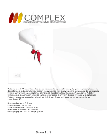 Pistolety z serii FR idealnie nadają się do nanoszenia tapet natryskowych, tynków, gładzi gipsowych, do malowania farbą emulsyjną, farbami klejowymi itp. Jest to rewolucyjne rozwiązanie do nanoszenia tynków akrylowych na docieplenia, jak również do robienia tzw. "baranków" na ścianie. Pistolety wykonane są z aluminium przez co są lekkie i wygodne a przy tym bardzo wydajne w eksploatacji. Pistolety pracują w przedziale ciśnień od 4 do 8 bar. Praca sprawdza się już ze sprężarką ze zbiornikiem 50l. Rozmiar dyszy - 4, 6, 8 mm Ciśnienie pracy - 4 - 6 bar Zużycie powietrza - 227-396 l/min Pojemność zbiornika - 8 l (plastik) Gwint przyłącza - 1/4" GZ (wtyk typ 26) Strona 1 z 1