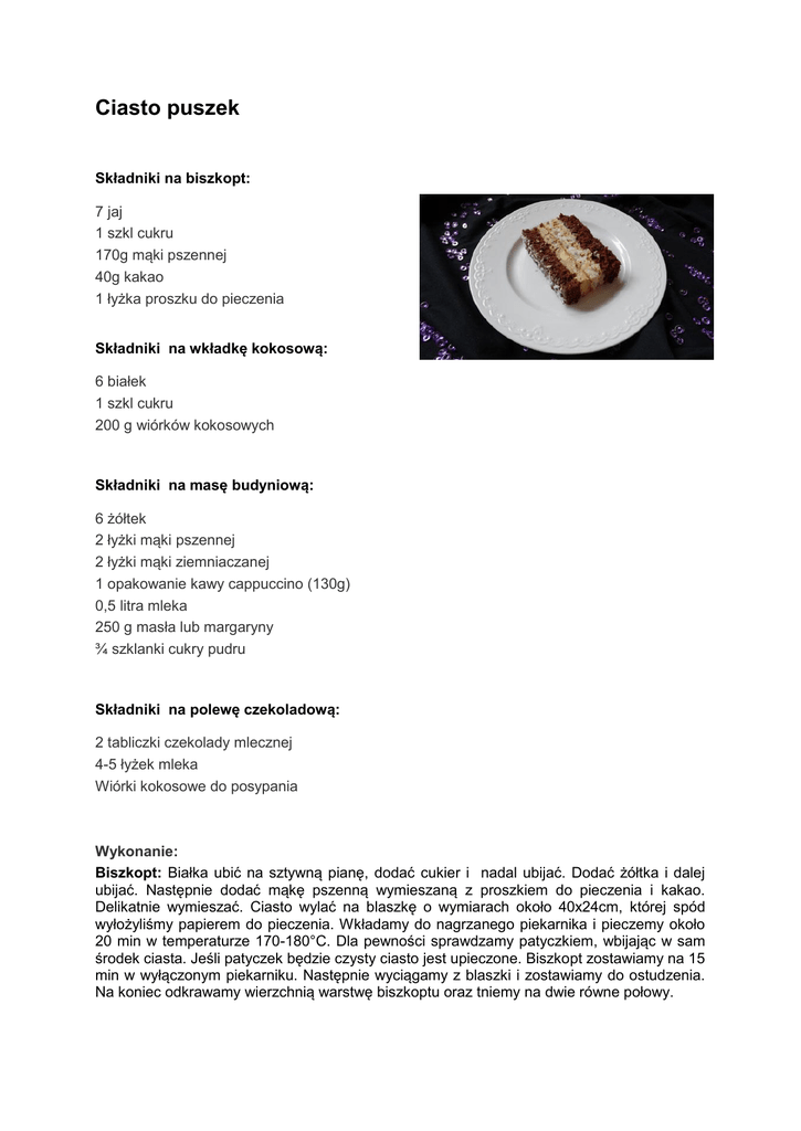 Ciasto puszek Składniki na biszkopt: 7 jaj 1 szkl cukru 170g mąki pszennej 40g kakao 1 łyżka proszku do pieczenia Składniki na wkładkę kokosową: 6 białek 1 szkl cukru 200 g wiórków kokosowych Składniki na masę budyniową: 6 żółtek 2 łyżki mąki pszennej 2 łyżki mąki ziemniaczanej 1 opakowanie kawy cappuccino (130g) 0,5 litra mleka 250 g masła lub margaryny ¾ szklanki cukry pudru Składniki na polewę czekoladową: 2 tabliczki czekolady mlecznej 4-5 łyżek mleka Wiórki kokosowe do posypania Wykonanie: Biszkopt: Białka ubić na sztywną pianę, dodać cukier i nadal ubijać. Dodać żółtka i dalej ubijać. Następnie dodać mąkę pszenną wymieszaną z proszkiem do pieczenia i kakao. Delikatnie wymieszać. Ciasto wylać na blaszkę o wymiarach około 40x24cm, której spód wyłożyliśmy papierem do pieczenia. Wkładamy do nagrzanego piekarnika i pieczemy około 20 min w temperaturze 170-180°C. Dla pewności sprawdzamy patyczkiem, wbijając w sam środek ciasta. Jeśli patyczek będzie czysty ciasto jest upieczone. Biszkopt zostawiamy na 15 min w wyłączonym piekarniku. Następnie wyciągamy z blaszki i zostawiamy do ostudzenia. Na koniec odkrawamy wierzchnią warstwę biszkoptu oraz tniemy na dwie równe połowy. Wkładka kokosowa: Białka ubić na sztywno i cały czas ubijać, stopniowo dodawać cukier oraz wiórki kokosowe. Ciasto wylać do tej samej blachy, w której piekliśmy biszkopt i piec około 30min, aż ciasto uzyska złoty kolor. Masa budyniowa: Z 0,5 litra mleka odlać 1 szklankę, w której mieszamy obie mąki z żółtkami i kawą cappuccino. Resztę mleka gotujemy. Gdy mleko się zagotuje wlewamy wcześniej rozmieszane mleko z mąkami i cały czas mieszamy, aż do zagotowania. Po zagotowaniu przykrywamy budyń folią aluminiową i odstawiamy do ostudzenia. Masło i cukier dajemy do dużej miski i ucieramy mikserem lub ręcznie, aż do powstania puszystej masy. Następnie dodajemy stopniowo wystudzony budyń, cały czas ucierając mikserem lub ręcznie. Wykonanie polewy: 2 tabliczki czekolady i 4-5 łyżki mleka rozpuszczamy w rondelku na małym ogniu cały czas mieszając, aż czekolada się rozpuści i zrobi się szklista i błyszcząca. Składanie ciasta: Pierwszą połówkę biszkoptu wkładamy do blaszki, w której się piekł, a na to wykładamy połowę kremu i przykrywamy go kokosową wkładką. Następnie wykładamy pozostały krem, a na wierzch kładziemy drugi blat biszkoptowy. Na koniec ciasto polewamy polewą czekoladową i posypujemy wiórkami kokosowymi. Smacznego! Przepis ze strony Magia Kuchni http://magiakuchni.eu