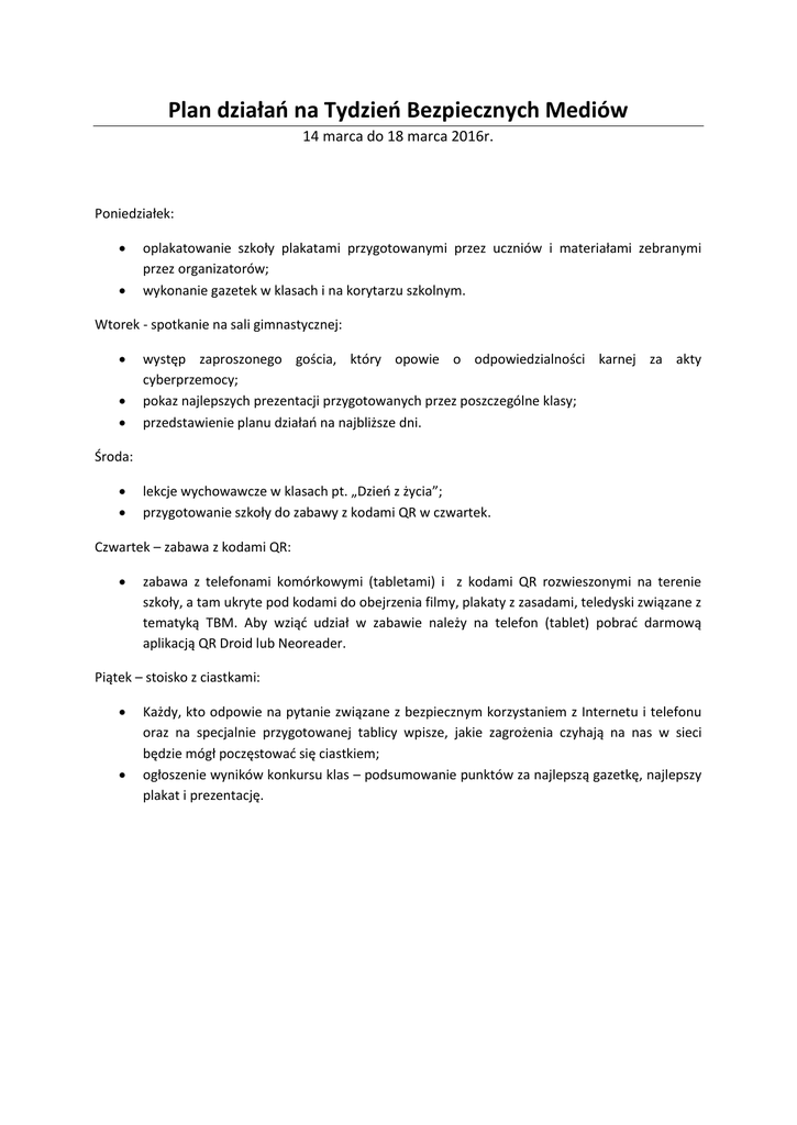 Plan działań na Tydzień Bezpiecznych Mediów 14 marca do 18 marca 2016r. Poniedziałek: oplakatowanie szkoły plakatami przygotowanymi przez uczniów i materiałami zebranymi przez organizatorów; wykonanie gazetek w klasach i na korytarzu szkolnym. Wtorek - spotkanie na sali gimnastycznej: występ zaproszonego gościa, który opowie o odpowiedzialności karnej za akty cyberprzemocy; pokaz najlepszych prezentacji przygotowanych przez poszczególne klasy; przedstawienie planu działao na najbliższe dni. Środa: lekcje wychowawcze w klasach pt. „Dzieo z życia”; przygotowanie szkoły do zabawy z kodami QR w czwartek. Czwartek – zabawa z kodami QR: zabawa z telefonami komórkowymi (tabletami) i z kodami QR rozwieszonymi na terenie szkoły, a tam ukryte pod kodami do obejrzenia filmy, plakaty z zasadami, teledyski związane z tematyką TBM. Aby wziąd udział w zabawie należy na telefon (tablet) pobrad darmową aplikacją QR Droid lub Neoreader. Piątek – stoisko z ciastkami: Każdy, kto odpowie na pytanie związane z bezpiecznym korzystaniem z Internetu i telefonu oraz na specjalnie przygotowanej tablicy wpisze, jakie zagrożenia czyhają na nas w sieci będzie mógł poczęstowad się ciastkiem; ogłoszenie wyników konkursu klas – podsumowanie punktów za najlepszą gazetkę, najlepszy plakat i prezentację.