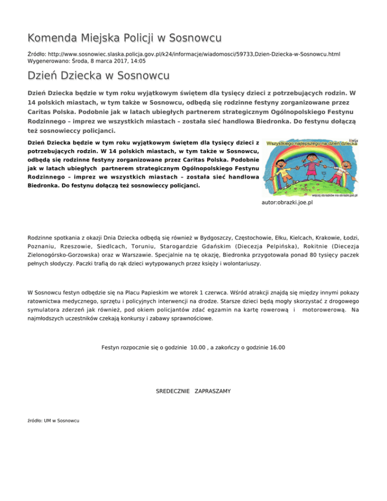 Komenda Miejska Policji w Sosnowcu Źródło: http://www.sosnowiec.slaska.policja.gov.pl/k24/informacje/wiadomosci/59733,Dzien-Dziecka-w-Sosnowcu.html Wygenerowano: Środa, 8 marca 2017, 14:05 Dzień Dziecka w Sosnowcu Dzień Dziecka będzie w tym roku wyjątkowym świętem dla tysięcy dzieci z potrzebujących rodzin. W 14 polskich miastach, w tym także w Sosnowcu, odbędą się rodzinne festyny zorganizowane przez Caritas Polska. Podobnie jak w latach ubiegłych partnerem strategicznym Ogólnopolskiego Festynu Rodzinnego – imprez we wszystkich miastach – została sieć handlowa Biedronka. Do festynu dołączą też sosnowieccy policjanci. Dzień Dziecka będzie w tym roku wyjątkowym świętem dla tysięcy dzieci z potrzebujących rodzin. W 14 polskich miastach, w tym także w Sosnowcu, odbędą się rodzinne festyny zorganizowane przez Caritas Polska. Podobnie jak w latach ubiegłych partnerem strategicznym Ogólnopolskiego Festynu Rodzinnego – imprez we wszystkich miastach – została sieć handlowa Biedronka. Do festynu dołączą też sosnowieccy policjanci. autor:obrazki.joe.pl Rodzinne spotkania z okazji Dnia Dziecka odbędą się również w Bydgoszczy, Częstochowie, Ełku, Kielcach, Krakowie, Łodzi, Poznaniu, Rzeszowie, Siedlcach, Toruniu, Starogardzie Gdańskim (Diecezja Pelpińska), Rokitnie (Diecezja Zielonogórsko-Gorzowska) oraz w Warszawie. Specjalnie na tę okazję, Biedronka przygotowała ponad 80 tysięcy paczek pełnych słodyczy. Paczki trafią do rąk dzieci wytypowanych przez księży i wolontariuszy. W Sosnowcu festyn odbędzie się na Placu Papieskim we wtorek 1 czerwca. Wśród atrakcji znajdą się między innymi pokazy ratownictwa medycznego, sprzętu i policyjnych interwencji na drodze. Starsze dzieci będą mogły skorzystać z drogowego symulatora zderzeń jak również, pod okiem policjantów zdać egzamin na kartę rowerową i najmłodszych uczestników czekają konkursy i zabawy sprawnościowe. Festyn rozpocznie się o godzinie 10.00 , a zakończy o godzinie 16.00 SREDECZNIE ZAPRASZAMY źródło: UM w Sosnowcu motorowerową. Na Wszystkim dzieciom dużo radości i spełnienia wszystkich marzeń życzą sosnowieccy policjanci. Pamiętajcie, każdy z Was ma swój własny wehikuł czasu. W przeszłość przenosicie się dzięki wspomnieniom, a w przyszłość dzięki marzeniom. Ocena: 0/5 (0) Tweetnij