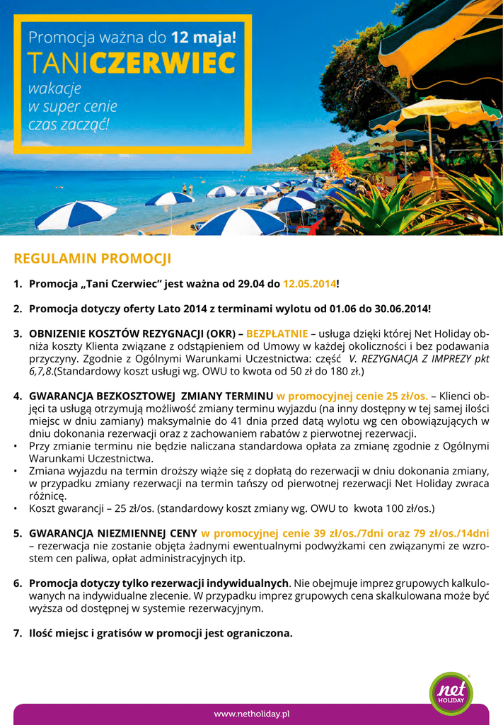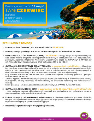 REGULAMIN PROMOCJI 1. Promocja „Tani Czerwiec” jest ważna od 29.04 do 12.05.2014! 2. Promocja dotyczy oferty Lato 2014 z terminami wylotu od 01.06 do 30.06.2014! 3. OBNIZENIE KOSZTÓW REZYGNACJI (OKR) – BEZPŁATNIE – usługa dzięki której Net Holiday obniża koszty Klienta związane z odstąpieniem od Umowy w każdej okoliczności i bez podawania przyczyny. Zgodnie z Ogólnymi Warunkami Uczestnictwa: część V. REZYGNACJA Z IMPREZY pkt 6,7,8.(Standardowy koszt usługi wg. OWU to kwota od 50 zł do 180 zł.) 4. GWARANCJA BEZKOSZTOWEJ ZMIANY TERMINU w promocyjnej cenie 25 zł/os. – Klienci objęci ta usługą otrzymują możliwość zmiany terminu wyjazdu (na inny dostępny w tej samej ilości miejsc w dniu zamiany) maksymalnie do 41 dnia przed datą wylotu wg cen obowiązujących w dniu dokonania rezerwacji oraz z zachowaniem rabatów z pierwotnej rezerwacji. • Przy zmianie terminu nie będzie naliczana standardowa opłata za zmianę zgodnie z Ogólnymi Warunkami Uczestnictwa. • Zmiana wyjazdu na termin droższy wiąże się z dopłatą do rezerwacji w dniu dokonania zmiany, w przypadku zmiany rezerwacji na termin tańszy od pierwotnej rezerwacji Net Holiday zwraca różnicę. • Koszt gwarancji – 25 zł/os. (standardowy koszt zmiany wg. OWU to kwota 100 zł/os.) 5. GWARANCJA NIEZMIENNEJ CENY w promocyjnej cenie 39 zł/os./7dni oraz 79 zł/os./14dni – rezerwacja nie zostanie objęta żadnymi ewentualnymi podwyżkami cen związanymi ze wzrostem cen paliwa, opłat administracyjnych itp. 6. Promocja dotyczy tylko rezerwacji indywidualnych. Nie obejmuje imprez grupowych kalkulowanych na indywidualne zlecenie. W przypadku imprez grupowych cena skalkulowana może być wyższa od dostępnej w systemie rezerwacyjnym. 7. Ilość miejsc i gratisów w promocji jest ograniczona. www.netholiday.pl