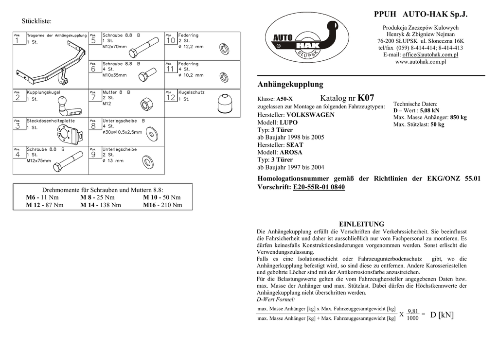 Anhängekupplung Katalog nr K07 = D [kN] PPUH AUTO