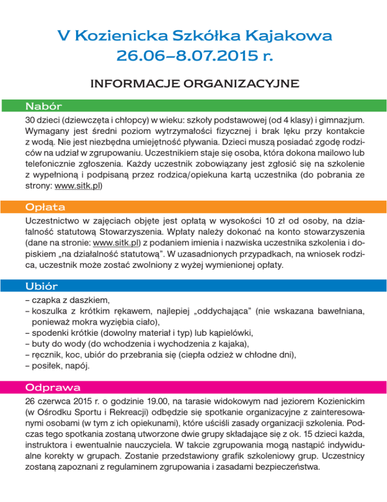 V Kozienicka Szkółka Kajakowa 26.06–8.07.2015 r. INFORMACJE ORGANIZACYJNE Nabór 30 dzieci (dziewczęta i chłopcy) w wieku: szkoły podstawowej (od 4 klasy) i gimnazjum. Wymagany jest średni poziom wytrzymałości fizycznej i brak lęku przy kontakcie z wodą. Nie jest niezbędna umiejętność pływania. Dzieci muszą posiadać zgodę rodziców na udział w zgrupowaniu. Uczestnikiem staje się osoba, która dokona mailowo lub telefonicznie zgłoszenia. Każdy uczestnik zobowiązany jest zgłosić się na szkolenie z wypełnioną i podpisaną przez rodzica/opiekuna kartą uczestnika (do pobrania ze strony: www.sitk.pl) Opłata Uczestnictwo w zajęciach objęte jest opłatą w wysokości 10 zł od osoby, na działalność statutową Stowarzyszenia. Wpłaty należy dokonać na konto stowarzyszenia (dane na stronie: www.sitk.pl) z podaniem imienia i nazwiska uczestnika szkolenia i dopiskiem „na działalność statutową”. W uzasadnionych przypadkach, na wniosek rodzica, uczestnik może zostać zwolniony z wyżej wymienionej opłaty. Ubiór – czapka z daszkiem, – koszulka z krótkim rękawem, najlepiej „oddychająca” (nie wskazana bawełniana, ponieważ mokra wyziębia ciało), – spodenki krótkie (dowolny materiał i typ) lub kąpielówki, – buty do wody (do wchodzenia i wychodzenia z kajaka), – ręcznik, koc, ubiór do przebrania się (ciepła odzież w chłodne dni), – posiłek, napój. Odprawa 26 czerwca 2015 r. o godzinie 19.00, na tarasie widokowym nad jeziorem Kozienickim (w Ośrodku Sportu i Rekreacji) odbędzie się spotkanie organizacyjne z zainteresowanymi osobami (w tym z ich opiekunami), które uściśli zasady organizacji szkolenia. Podczas tego spotkania zostaną utworzone dwie grupy składające się z ok. 15 dzieci każda, instruktora i ewentualnie nauczyciela. W takcie zgrupowania mogą nastąpić indywidualne korekty w grupach. Zostanie przedstawiony grafik szkoleniowy grup. Uczestnicy zostaną zapoznani z regulaminem zgrupowania i zasadami bezpieczeństwa. Zgrupowanie Zgrupowanie odbywać się będzie na zasadzie niestacjonarnej. Uczestnicy po zajęciach udają się do swoich domów. Zajęcia realizowane będą w okresie 27.06–7.07.2015 r. Szkolenie odbywać się będzie w 4 półtoragodzinnych sesjach. Pierwsze dwie, w godzinach od 9.30 do 13.00 (z półgodzinną przerwą między kolejnymi grupami), kolejne w godzinach od 15.00 do 18.30 (z półgodzinną przerwą między kolejnymi grupami). Czas od 13.00 do 15.00 jest przeznaczony na obiad. Posiłki uczestnicy realizują we własnym zakresie i na własny koszt. Zgrupowanie przeznaczone jest dla amatorów. Wszystko rozpoczynać się będzie od tzw. poziomu „zerowego”. 15-osobowe grupy szkoleniowe (plus instruktor oraz nauczyciel) będą realizować zajęcia zgodnie z ustalonym programem. W pierwszym tygodniu pierwsza grupa będzie ćwiczyć do południa, w pierwszej sesji półtoragodzinnej przed obiadem (w godzinach od 9.30 do 11.00) i po obiedzie (w godzinach 15.00–16.30). W drugim tygodniu pierwsza grupa rozpocznie zajęcia w drugiej sesji półtoragodzinnej przed obiadem (w godzinach od 11.30 do 13.00) i po obiedzie (w godzinach 17.00–18.30). Druga grupa szkoleniowa odwrotnie. Pierwsze zajęcia to głównie nauka bezpiecznego wsiadania do kajaka, właściwego wiosłowania, umiejętności manewrowania kajakiem oraz postępowania na wypadek wywrotki. Kolejne zajęcia wskażą niezbędne techniki sprawnego manewrowania ww. sprzętem. W cykl szkolenia włączone będą gry i zabawy rekreacyjne. Sprzęt i bezpieczeństwo Jednym z najważniejszych atutów zgrupowania jest utrzymanie wysokiego poziomu bezpieczeństwa jego uczestników. Uczestnicy pływać będą we właściwie dobranym, sprawnym sprzęcie asekuracyjnym. Sprzęt zapewnia organizator – Stowarzyszenie Instruktorów i Trenerów Kajakarstwa. Nad całością zgrupowania opiekę sprawuje jego kierownik – Ryszard Roman, tel. 500 237 228. Jest to doświadczony trener dyscypliny kajak-polo i wychowawca młodzieży. Uczestnicy są zobowiązani do wykonywania jego poleceń oraz poleceń organizatora. Nieobecność uczestnika na zajęciach musi być uprzednio zgłoszona przez opiekuna uczestnika! W imieniu organizatora szkolenia Iza Książek – Prezes SITK Dofinansowano ze środków Urzędu Gminy w Kozienicach