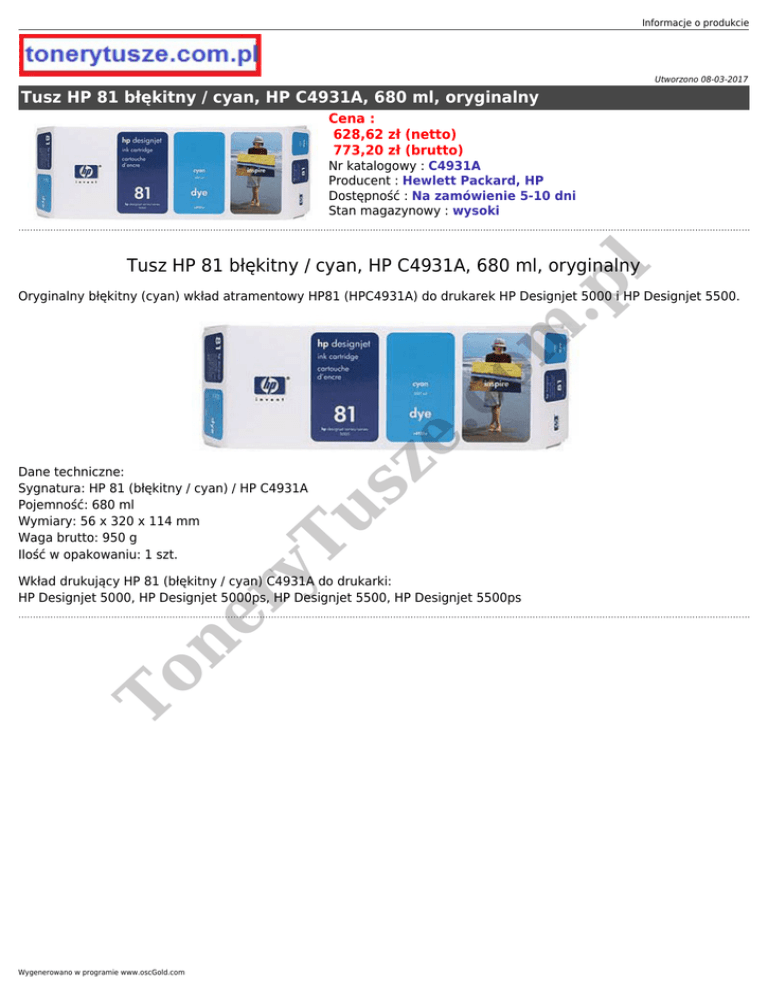 Informacje o produkcie Utworzono 08-03-2017 Tusz HP 81 błękitny / cyan, HP C4931A, 680 ml, oryginalny Cena : 628,62 zł (netto) 773,20 zł (brutto) Nr katalogowy : C4931A Producent : Hewlett Packard, HP Dostępność : Na zamówienie 5-10 dni Stan magazynowy : wysoki .p l Tusz HP 81 błękitny / cyan, HP C4931A, 680 ml, oryginalny yT u Dane techniczne: Sygnatura: HP 81 (błękitny / cyan) / HP C4931A Pojemność: 680 ml Wymiary: 56 x 320 x 114 mm Waga brutto: 950 g Ilość w opakowaniu: 1 szt. sz e. c om Oryginalny błękitny (cyan) wkład atramentowy HP81 (HPC4931A) do drukarek HP Designjet 5000 i HP Designjet 5500. To ne r Wkład drukujący HP 81 (błękitny / cyan) C4931A do drukarki: HP Designjet 5000, HP Designjet 5000ps, HP Designjet 5500, HP Designjet 5500ps Wygenerowano w programie www.oscGold.com