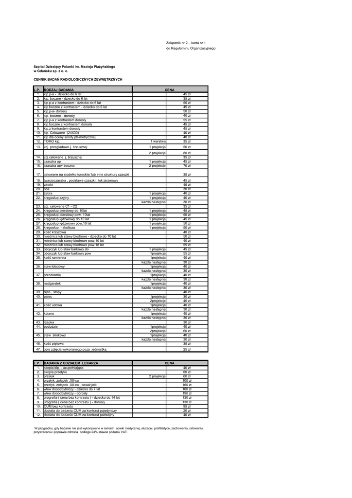 Załącznik nr 2 – karta nr 1 do Regulaminu Organizacyjnego Szpital Dziecięcy Polanki im. Macieja Płażyńskiego w Gdańsku sp. z o. o. CENNIK BADAŃ RADIOLOGICZNYCH ZEWNĘTRZNYCH L.P. 1. 2. 3. 4. 5. 6. 7. 8. 9. 10. 11. 12. RODZAJ BADANIA klp.p-a - dziecko do 6 lat klp. boczne - dziecko do 6 lat klp.p-a z kontrastem - dziecko do 6 lat klp.boczne z kontrastem - dziecko do 6 lat klp.p-a- dorosły klp. boczne - dorosły klp.p-a z kontrastem dorosły klp.boczne z kontrastem dorosły klp.z kontrastem dorosły klp. Celowane (24X30) klp.dla oceny sondy ph-metrycznej TOMO klp. 13. zdj. przeglądowe j. brzusznej 14. zdj.celowane j. brzusznej 15. czaszka ap 16. czaszka ap+ boczna CENA 1 warstwa 45 zł 35 zł 50 zł 45 zł 50 zł 40 zł 55 zł 45 zł 45 zł 40 zł 40 zł 35 zł 1 projekcja 50 zł 2 projekcje 80 zł 35 zł 45 zł 70 zł 1 projekcja 2 projekcje 17. celowane na siodełko tureckie/ lub inne struktury czaszki 35 zł 18. 19. 20. 21. 22. twarzoczaszka , podstawa czaszki , łuk jarzmowy zatoki nos żebra kręgosłup szyjny 23. 24. 25. 26. 27. 28. 29. 30. 31. 32. 33. 34. 35. zdj. celowane C1 - C2 kręgosłup piersiowy do 10lat kręgosłup piersiowy pow. 10lat kręgosłup lędźwiowy do 10 lat kręgosłup lędźwiowy pow.10 lat kręgosłup - skolioza kość krzyżowa miednica lub stawy biodrowe - dziecko do 10 lat miednica lub stawy biodrowe pow.10 lat miednica lub stawy biodrowe pow.18 lat obojczyk lub staw barkowy do obojczyk lub staw barkowy pow kość ramienna 46. kość piętowa 45 zł 45 zł 30 zł 40 zł 40 zł 30 zł 35 zł 45 zł 50 zł 45 zł 50 zł 50 zł 40 zł 50 zł 40 zł 55 zł 45 zł 55 zł 40 zł 30 zł 40 zł 30 zł 40 zł 30 zł 40 zł 30 zł 40 zł 30 zł 40 zł 40 zł 30 zł 40 zł 30 zł 30 zł 40 zł 60 zł 40 zł 30 zł 35 zł 47. opis zdjęcia wykonanego poza jednostką 25 zł 36. staw łokciowy 37. przedramię 38. nadgarstek 39. ręce , stopy 40. palec 41. kość udowa 42. kolano 43. rzepka 44. podudzie 45. staw skokowy L.P. 1. 2. 3. 4. 5. 6. 7. 8. 9. 10. 11. 12. BADANIA Z UDZIAŁEM LEKARZA skopia klp. - uzupełniająca skopia przełyku przełyk przełyk, żołądek ,XII-ca przełyk, żołądek ,XII-ca , pasaż jelit wlew dooodbytniczy - dziecko do 7 lat wlew dooodbytniczy - dorosły urografia ( cena bez kontrastu ) - dziecko do 14 lat urografia ( cena bez kontrastu ) - dorosły CUM bez kontrastu dopłata do badania CUM za kontrast pojedynczy dopłata do badania CUM za kontrast podwójny 1 projekcja 1 projekcja każda następna 1 projekcja 1 projekcja 1 projekcja 1 projekcja 1 projekcja 1 projekcja 1projekcja 1projekcja każda następna 1projekcja każda następna 1projekcja każda następna 1projekcja każda następna 1projekcja 2projekcje 1projekcja każda następna 1projekcja każda następna 1projekcja 2projekcje 1projekcja każda następna CENA 2 projekcje 40 zł 60 zł 60 zł 100 zł 160 zł 160 zł 190 zł 130 zł 130 zł 95 zł 20 zł 40 zł W przypadku, gdy badanie nie jest wykonywane w ramach opieki medycznej, służącej profilaktyce, zachowaniu, ratowaniu, przywracaniu i poprawie zdrowia podlega 23% stawce podatku VAT.