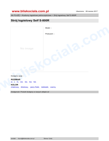 www.bliskociala.com.pl Utworzono : 08 marzec 2017 NA PLAŻĘ > Kostiumy kąpielowe jednoczęściowe > Strój kąpielowy Self S-800R Strój kąpielowy Self S-800R m o c . a l a Model : - Producent : - No image o k il s w b . w Dostępne opcje : ROZMIAR i c xl, l, m, 2xl, 3xl, 4xl, 5xl. KOLOR chabrowy, śliwkowy, jasny fiolet, niebieski, czarny. Dostępność: Produkt dostępny w naszym sklepie od kontakt : - [email protected] Strona 1/{nb}