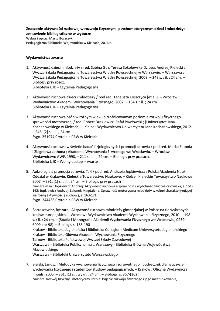 Znaczenie aktywności ruchowej w rozwoju fizycznym i psychomotorycznym dzieci i młodzieży: zestawienie bibliograficzne w wyborze Wybór i oprac. Marta Boszczyk Pedagogiczna Biblioteka Wojewódzka w Kielcach, 2016 r. Wydawnictwa zwarte 1. Aktywność dzieci i młodzieży / red. Sabina Guz, Teresa Sokołowska-Dzioba, Andrzej Pielecki ; Wyższa Szkoła Pedagogiczna Towarzystwa Wiedzy Powszechnej w Warszawie. – Warszawa : Wyższa Szkoła Pedagogiczna Towarzystwa Wiedzy Powszechnej, 2008. – 248 s. : il. ; 24 cm. – Bibliogr. przy rozdz. Biblioteka UJK – Czytelnia Pedagogiczna 2. Aktywność ruchowa dzieci i młodzieży / pod red. Tadeusza Koszczyca [et al.]. – Wrocław : Wydawnictwo Akademii Wychowania Fizycznego, 2007. – 154 s. : il. ; 24 cm Biblioteka UJK – Czytelnia Pedagogiczna 3. Aktywność ruchowa osób w różnym wieku o zróżnicowanym poziomie rozwoju fizycznego i sprawności motorycznej / red. Robert Dutkiewicz, Rafał Pawłowski ; [Uniwersytet Jana Kochanowskiego w Kielcach]. – Kielce : Wydawnictwo Uniwersytetu Jana Kochanowskiego, 2012. – 246, [2] s. : il. ; 24 cm Sygn. 251974 Czytelnia PBW w Kielcach 4. Aktywność ruchowa w świetle badań fizjologicznych i promocji zdrowia / pod red. Marka Zatonia i Zbigniewa Jethona ; Akademia Wychowania Fizycznego we Wrocławiu. – Wrocław : Wydawnictwo AWF, 1998. – 211 s. : il. ; 24 cm. – Bibliogr. przy pracach. Biblioteka UJK – Wolny dostęp – zwarte 5. Auksologia a promocja zdrowia. T. 4 / pod red. Andrzeja Jopkiewicza ; Polska Akademia Nauk. Oddział w Krakowie, Kieleckie Towarzystwo Naukowe. – Kielce : Kieleckie Towarzystwo Naukowe, 2007. – 291, [1] s. : il. ; 24 cm. – Bibliogr. przy pracach Zawiera m.in.: Jopkiewicz Andrzej: Aktywność ruchowa a sprawność i wydolność fizyczna człowieka, s. 151162; Jopkiewicz Andrzej, Lelonek Magdalena: Sprawność motoryczna młodzieży szkolnej charakteryzującej się różną aktywnością ruchową, s. 163-171. Sygn. 244438 Czytelnia PBW w Kielcach 6. Bartoszewicz, Ryszard : Aktywność ruchowa młodzieży gimnazjalnej w Polsce na tle wybranych krajów europejskich. – Wrocław : Wydawnictwo Akademii Wychowania Fizycznego, 2010. – 198 s. : il. ; 24 cm. – (Studia i Monografie Akademii Wychowania Fizycznego we Wrocławiu, 02396009 ; nr 98). – Bibliogr. s. 183-190 Kraków - Biblioteka Jagiellońska i Biblioteka Collegium Medicum Uniwersytetu Jagiellońskiego Kraków - Biblioteka Główna Akademii Wychowania Fizycznego Tarnów - Biblioteka Państwowej Wyższej Szkoły Zawodowej Warszawa - Biblioteka Publiczna m.st. Warszawy - Biblioteka Główna Województwa Mazowieckiego Warszawa - Biblioteki Uniwersytetu Warszawskiego 7. Bielski, Janusz : Metodyka wychowania fizycznego i zdrowotnego : podręcznik dla nauczycieli wychowania fizycznego i studentów studiów pedagogicznych. – Kraków : Oficyna Wydawnicza Impuls, 2005. – 361, [1] s. : wykr. ; 24 cm. – Bibliogr. s. 357-[362] Zawiera: Rozwój fizyczny i motoryczny ucznia: Pojęcie rozwoju fizycznego i jego uwarunkowania, Akceleracja rozwoju i trend rozwojowy, Ocena rozwoju fizycznego (Ocena wieku morfologicznego, Ocena wieku kostnego, Ocena wieku zębowego, Ocena rozwoju według wtórnych cech płciowych, Ocena rozwoju za pomocą siatek rozwojowych), Kontrola stanu fizycznego dzieci i młodzieży, Zmiany w postawie ciała, Metody oceny postawy ciała (Metoda sylwetkowa według typologii N. Wolańskiego, Metoda punktowa oceny postawy ciała według N. Wolańskiego, Uproszczone oględziny ortopedyczne, Ocena funkcjonalna postawy ciała), Charakterystyka rozwoju fizycznego i motorycznego (Etapy i okresy w rozwoju osobniczym). Motoryczność ludzka - przejawy i pomiar: Trochę teorii, Interpretacja podstawowych pojęć, Diagnoza sprawności fizycznej (Test oceny sprawności motorycznej Ludwika Denisiuka, Indeks sprawności fizycznej Krzysztofa Zuchory, Europejski test sprawności fizycznej -Eurofit, Test sprawności fizycznej dzieci i młodzieży Ymca, Międzynarodowy test sprawności fizycznej, Czeski test motoryczny ogólny, Pomiar czasu szybkości reakcji, Test pomiaru przerzutności uwagi i spostrzegawczości, Test minimalnej sprawności fizycznej Krausa-Webera), Testy uzdolnień ruchowych (Test uzdolnień ruchowych Brace'a, Bateria testów Mc Cloya), Diagnostyka czynnościowa wydolności fizycznej dzieci i młodzieży (Próba Cramptona, Próba Ruffiera, Próba Harwardzka, Zmodyfikowana próba Harwardzka, Test 12-minutowy K. H. Coopera, Zmodyfikowany test 12-minutowy K. H. Coopera), Ogólne zasady rozwoju sprawności motorycznej, Zasady i metody kształtowania siły (Metoda maksymalnych obciążeń, Metoda minimalnych obciążeń, Metoda maksymalnych powtórzeń, Metoda izomeryczna, Body building traing, Metoda obwodowa, Metoda wytrzymałościowo-siłowa), Metodyka kształtowania szybkości (czas reakcji prostej, czas pojedynczego ruchu, częstotliwość ruchów), Zasady i metody kształtowania wytrzymałości (Metoda ciągła, Metoda powtórzeniowa, Metoda interwałowa), Metoda kształtowania koordynacji ruchowej, Metoda kształtowania gibkości. Sygn. 238870 Czytelnia PBW w Kielcach Sygn. 238981 Wypożyczalnia PBW w Kielcach 8. Bielski, Janusz : Podstawowe problemy teorii wychowania fizycznego. – Kraków : Oficyna Wydawnicza Impuls, 2012. – 222 s. : il. ; 24 cm. – Bibliogr. przy rozdz. Zawiera m.in.: Rozdział 6. Funkcje ruchu: 6.1. Stymulująca funkcja ruchu, 6.2. Adaptacyjna funkcja ruchu, 6.3. Kompensacyjna i korekcyjna funkcja ruchu. Rozdział 7. Rozwój fizyczny człowieka: 7.1. Pojęcie rozwoju fizycznego i jego uwarunkowania, 7.2. Ocena rozwoju fizycznego, 7.3. Kontrola stanu fizycznego dzieci i młodzieży, 7.4. Zmiany w postawie ciała, 7.5. Metody oceny postawy ciała, 7.6. Charakterystyka rozwoju fizycznego i motorycznego dzieci i młodzieży. Rozdział 8. Motoryczność ludzka: 8.1. Przejawy motoryczności, 8.2. Interpretacja podstawowych pojęć związanych z motorycznością, 8.3. Di