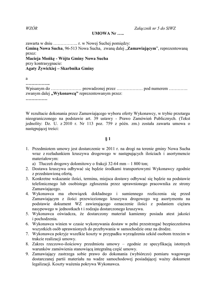 WZÓR Załącznik nr 5 do SIWZ UMOWA Nr ….. zawarta w dniu …………….. r. w Nowej Suchej pomiędzy: Gminą Nowa Sucha, 96-513 Nowa Sucha, zwaną dalej „Zamawiającym”, reprezentowaną przez: Macieja Mońkę - Wójta Gminy Nowa Sucha przy kontrasygnacie: Agaty Żywickiej – Skarbnika Gminy a …………….. Wpisanym do ………………… prowadzonej przez ……………… pod numerem …………. zwanym dalej „Wykonawcą” reprezentowanym przez: …………… W rezultacie dokonania przez Zamawiającego wyboru oferty Wykonawcy, w trybie przetargu nieograniczonego na podstawie art. 39 ustawy - Prawo Zamówień Publicznych. (Tekst jednolity: Dz. U. z 2010 r. Nr 113 poz. 759 z późn. zm.) została zawarta umowa o następującej treści: §1 1. Przedmiotem umowy jest dostarczenie w 2011 r. na drogi na terenie gminy Nowa Sucha wraz z rozładunkiem kruszywa drogowego w następujących ilościach i asortymencie materiałowym: a) Tłuczeń drogowy dolomitowy o frakcji 32-64 mm – 1 800 ton; 2. Dostawa kruszywa odbywać się będzie środkami transportowymi Wykonawcy zgodnie z przedstawioną ofertą. 3. Konkretne wskazanie ilości, terminu, miejsca dostawy odbywać się będzie na podstawie telefonicznego lub osobistego zgłoszenia przez uprawnionego pracownika ze strony Zamawiającego. 4. Wykonawca ma obowiązek dokładnego i sumiennego rozliczenia się przed Zamawiającym z ilości przewiezionego kruszywa drogowego wg asortymentu na podstawie dokument WZ zawierającego oznaczenie ilości z podaniem ciężaru nasypowego w jednostkach t i rodzaju dostarczonego kruszywa. 5. Wykonawca oświadcza, że dostarczony materiał kamienny posiada atest jakości i pochodzenia. 6. Wykonawca winien w czasie wykonywania dostaw w pełni przestrzegać bezpieczeństwa wszystkich osób uprawnionych do przebywania w samochodzie oraz na drodze. 7. Wykonawca pokryje wszelkie koszty w przypadku wyrządzenia szkód osobom trzecim w trakcie realizacji umowy. 8. Zakres rzeczowo-ilościowy przedmiotu umowy – zgodnie ze specyfikacją istotnych warunków zamówienia stanowiącą integralną część umowy. 9. Zamawiający zastrzega sobie prawo do dokonania (wybiórczo) pomiaru wagowego dostarczanej partii materiału na wadze samochodowej posiadającej ważny dokument legalizacji. Koszty ważenia pokrywa Wykonawca. §2 1. Ustala się termin realizacji przedmiotu umowy na dzień 31.08.2011 r. 2. Za realizację zamówienia odpowiedzialni są: a) Ze strony Wykonawcy – …………………………, tel. ……….……………………. b) Ze strony Zamawiającego – …………………… , tel. …………………………….. §3 1. Za wykonanie przedmiotu zamówienia określonego w § 1, ustala się wynagrodzenie w wysokości: ........zł netto (słownie: ………….) Podatek VAT … % ….. zł (słownie: ………….) …… zł brutto (słownie: …………..) 2. Ustala się następujące ceny jednostkowe: a) za 1 tonę dostarczonego tłucznia drogowego dolomitowego o frakcji 32-64 mm: Kwotę ….. zł netto (słownie: ………………………..) plus podatek VAT …. % , tj.: …… zł (słownie: ……………… ) Kwotę ….. zł brutto (słownie: ………………………..) §4 1. Za realizację zamówienia odpowiedzialni są: c) Ze strony Wykonawcy – …………………………, tel. ……….……………………. d) Ze strony Zamawiającego – …………………… , tel. …………………………….. §5 1. Strony ustalają, że odbiór dostarczonego materiału kamiennego nastąpi w formie protokołu odbioru, podpisanego przez Zamawiającego i Wykonawcę sporządzonego po dokonaniu czynności objętych zamówieniem 2. Podpisany protokół odbioru stanowił będzie podstawę do wystawienia przez Wykonawcę faktury VAT określającej wynagrodzenie za wykonanie przedmiotu umowy. 3. Osobą upoważnioną do podpisania protokołu odbioru ze strony Zamawiającego jest ……………………. . §6 1. Ustala się termin zapłaty na 30 dni od daty otrzymania faktury przez Zamawiającego wraz z dokumentami rozliczeniowymi. Zapłata zostanie dokonana przelewem na konto Wykonawcy wskazane w fakturze. 2. Wykonawca oświadcza, że: Jest płatnikiem podatku VAT, posiada NIP ………………. 3. Zamawiający oświadcza, że: jest płatnikiem podatku VAT, posiada NIP 837-16-93-792 upoważnia Wykonawcę do wystawienia faktury VAT bez podpisu odbiorcy. 4. Zamawiający nie udziela zaliczek. §7 1. Wykonawca płaci Zamawiającemu kary umowne: a) za zwłokę w wykonaniu przedmiotu umowy w wysokości 0,5 % wynagrodzenia umownego brutto za każdy dzień zwłoki, b) za odstąpienie od umowy z przyczyn zależnych od Wykonawcy - w wysokości 10 % wynagrodzenia umownego brutto. 2. Zamawiający płaci Wykonawcy kary umowne: a) za odstąpienie od umowy z przyczyn zależnych od Zamawiającego w wysokości 10 % wynagrodzenia umownego brutto, za wyjątkiem wystąpienia sytuacji przedstawionej w art. 145 ustawy – Prawo zamówień publicznych. 3. W przypadku, gdy kary umowne nie pokryją powstałych szkód, strony mogą dochodzić odszkodowania uzupełniającego do wysokości rzeczywiście poniesionej szkody. §8 Stronom przysługuje prawo do odstąpienia od umowy w następujących przypadkach: 1. Wykonawcy przysługuje prawo odstąpienia od umowy, jeżeli Zamawiający zawiadomi Wykonawcę, iż wobec zaistnienia uprzednio nie przewidzianych okoliczności nie będzie mógł spełnić swoich zobowiązań umownych wobec Wykonawcy. 2. Zamawiającemu przysługuje prawo do odstąpienia od umowy: a) w razie wystąpienia istotnej zmiany okoliczności powodującej, że wykonanie umowy nie leży w interesie publicznym, czego nie można było przewidzieć w chwili zawarcia umowy. b) zostanie ogłoszona upadłość lub rozwiązanie firmy Wykonawcy, c) zostanie wydany nakaz zajęcia majątku Wykonawcy, d) wykonawca mimo uprzedniego pisemnego wezwania nie rozpoczął lub przerwał real