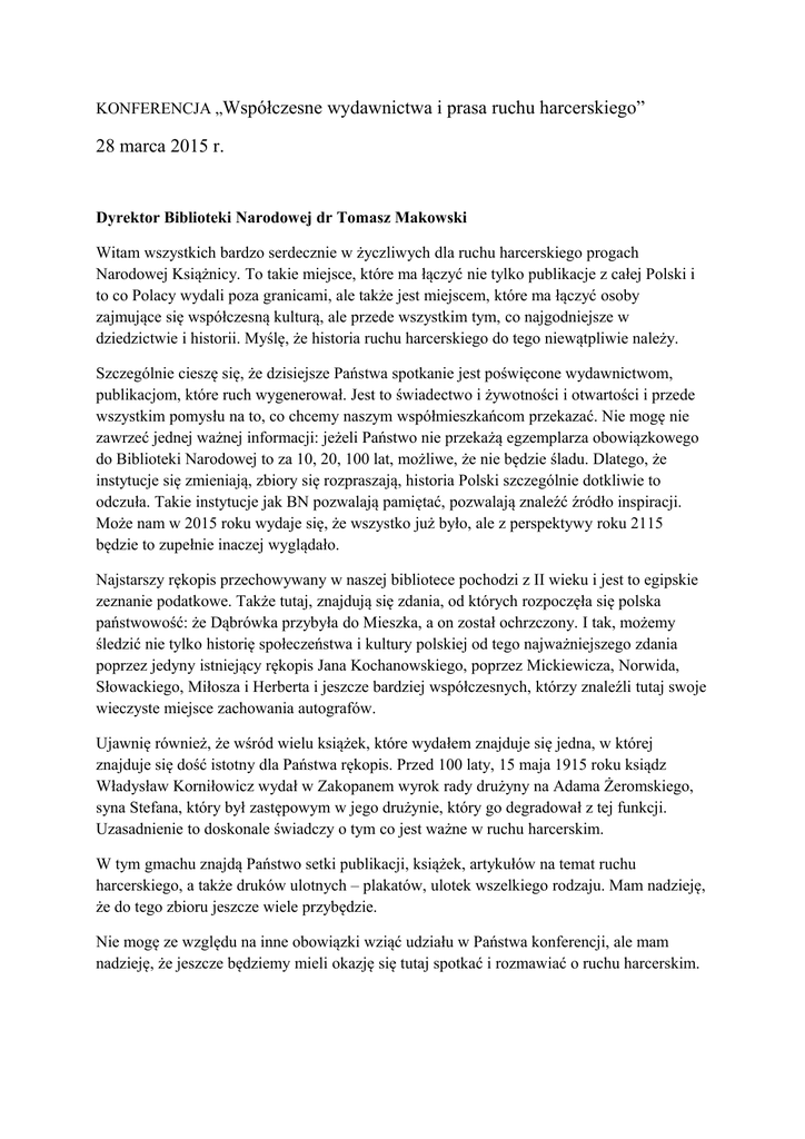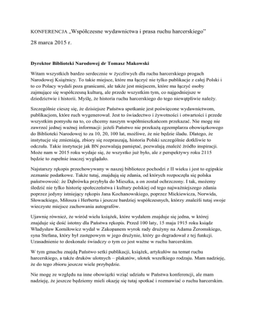 KONFERENCJA „Współczesne wydawnictwa i prasa ruchu harcerskiego” 28 marca 2015 r. Dyrektor Biblioteki Narodowej dr Tomasz Makowski Witam wszystkich bardzo serdecznie w życzliwych dla ruchu harcerskiego progach Narodowej Książnicy. To takie miejsce, które ma łączyć nie tylko publikacje z całej Polski i to co Polacy wydali poza granicami, ale także jest miejscem, które ma łączyć osoby zajmujące się współczesną kulturą, ale przede wszystkim tym, co najgodniejsze w dziedzictwie i historii. Myślę, że historia ruchu harcerskiego do tego niewątpliwie należy. Szczególnie cieszę się, że dzisiejsze Państwa spotkanie jest poświęcone wydawnictwom, publikacjom, które ruch wygenerował. Jest to świadectwo i żywotności i otwartości i przede wszystkim pomysłu na to, co chcemy naszym współmieszkańcom przekazać. Nie mogę nie zawrzeć jednej ważnej informacji: jeżeli Państwo nie przekażą egzemplarza obowiązkowego do Biblioteki Narodowej to za 10, 20, 100 lat, możliwe, że nie będzie śladu. Dlatego, że instytucje się zmieniają, zbiory się rozpraszają, historia Polski szczególnie dotkliwie to odczuła. Takie instytucje jak BN pozwalają pamiętać, pozwalają znaleźć źródło inspiracji. Może nam w 2015 roku wydaje się, że wszystko już było, ale z perspektywy roku 2115 będzie to zupełnie inaczej wyglądało. Najstarszy rękopis przechowywany w naszej bibliotece pochodzi z II wieku i jest to egipskie zeznanie podatkowe. Także tutaj, znajdują się zdania, od których rozpoczęła się polska państwowość: że Dąbrówka przybyła do Mieszka, a on został ochrzczony. I tak, możemy śledzić nie tylko historię społeczeństwa i kultury polskiej od tego najważniejszego zdania poprzez jedyny istniejący rękopis Jana Kochanowskiego, poprzez Mickiewicza, Norwida, Słowackiego, Miłosza i Herberta i jeszcze bardziej współczesnych, którzy znaleźli tutaj swoje wieczyste miejsce zachowania autografów. Ujawnię również, że wśród wielu książek, które wydałem znajduje się jedna, w której znajduje się dość istotny dla Państwa rękopis. Przed 100 laty, 15 maja 1915 roku ksiądz Władysław Korniłowicz wydał w Zakopanem wyrok rady drużyny na Adama Żeromskiego, syna Stefana, który był zastępowym w jego drużynie, który go degradował z tej funkcji. Uzasadnienie to doskonale świadczy o tym co jest ważne w ruchu harcerskim. W tym gmachu znajdą Państwo setki publikacji, książek, artykułów na temat ruchu harcerskiego, a także druków ulotnych – plakatów, ulotek wszelkiego rodzaju. Mam nadzieję, że do tego zbioru jeszcze wiele przybędzie. Nie mogę ze względu na inne obowiązki wziąć udziału w Państwa konferencji, ale mam nadzieję, że jeszcze będziemy mieli okazję się tutaj spotkać i rozmawiać o ruchu harcerskim. Lech Majewski, przedstawiciel Macieja Klimczaka, Ministra w Kancelarii Prezydenta RP Nie mogło na tej konferencji zabraknąć przedstawiciela instytucji, która obsługuje Protektora Harcerstwa, będę się przysłuchiwał konferencji. Dziękuję Panu dyrektorowi Makowskiemu za możliwość organizacji tej konferencji w Bibliotece Narodowej. Intencją Pana Prezydenta jest to, aby w miarę naszych możliwości wspierać ruch harcerski, w którym dostrzegamy wielką wartość, która nie przeminęła, a wprost przeciwnie - w nowych czasach zyskuje nowe funkcje i zadania, ale też te stare funkcje chyba się wzmacniają. Życzę Państwu, aby przedsięwzięcia takie jak ta konferencja służyły rzeczywistej rozbudowie i wzmocnieniu harcerstwa – tych wszystkich organizacji, które znajdują się pod protektoratem Pana Prezydenta. Znajdziecie w nas Państwo zawsze wspomożenie i wielkich zwolenników Państwa działalności. Prezeska Fundacji Harcerstwa Drugiego Stulecia, Monika Figiel Bardzo dziękuję panu Dyrektorowi za to, że możemy w tak godnym miejscu rozmawiać o współczesnych wydawnictwach i o prasie ruchu harcerskiego. To niewątpliwie nadaje tej naszej rozmowie i dyskusji inny wymiar, niż gdybyśmy rozmawiali wyłącznie w gronie harcerskim. Serdeczne dzięki Prezydentowi za wsparcie całego ruchu harcerskiego, co niejednokrotnie odczuwamy. Powiem słowo o naszej fundacji – powstała ona z inspiracji instruktorów, którzy zmieniali polską i harcerską rzeczywistość w latach 80-tych. Naszym głównym działaniem jest inspirowanie i wspieranie kształcenia instruktorów ze wszystkich organizacji harcerskich. Instruktorzy są tacy jak ich kształcenie, a ono z kolei opiera się o myśl. Jeżeli nie zostanie ona spisana, utrwalona w pewnej dyscyplinie intelektualnej, czy to w prasie czy w wydawnictwach, tym samym staje się ulotna i nieprzekazywalna. Czasem nie mamy mistrzów bezpośrednich, brak osób, od których możemy się uczyć prawdziwych harcerskich wartości czy harcerskiej praktyki, natomiast wielu z nas czerpało z książek czy też z artykułów spisanych w prasie harcerskiej. Być może ruch harcerski będzie przeżywał różne kryzysy, ale książki w Bibliotece Narodowej przetrwają. Mam nadzieję, że ta konferencja będzie inspiracją zarówno dla tych, którzy tworzą myśl harcerską, intelektualny poziom organizacji harcerskich. Poprzez to, że być może wydamy materiały pokonferencyjne i ta myśl dotrze do tych młodych ludzi, których tu dziś nie ma z nami na sali. Działania naszej fundacji mają charakter „ekumeniczny” – ruch harcerski jest wspólnym dobrem, o czym świadczy także i to, że dziś obok siebie na tej sali siedzą Przewodnicząca ZHR z Wiceprzewodniczącą ZHP. Życzę wszystkim owocnych obrad. Panel I „Wydawnictwa o ruchu harcerskim”, prowadzący harcmistrz Wojciech Hausner, nauczyciel, historyk, redaktor naczelny „Krakowskiego Rocznika Historii Harcerstwa”. hm Wojciech Hausner Chciałbym przedstawić uczestników panelu: hm dr Janusz Wojtycza, harcmistrz, historyk i pedagog, pracownik Krakowskiej Akademii im. A. F