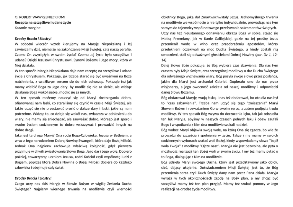 O. ROBERT WAWRZENIECKI OMI Recepta na szczęśliwe i udane życie Kazanie maryjne Drodzy Bracia i Siostry! W sobotni wieczór wzrok kierujemy na Maryję Niepokalaną i Jej zawierzamy dziś, niemalże na zakończenie Misji Świętej, całą naszą parafię. Czemu On zwyciężyła w swoim życiu? Czemu Jej życie było szczęśliwe i udane? Dzięki Jezusowi Chrystusowi, Synowi Bożemu i Jego mocy, która w Niej działała. W ten sposób Maryja Niepokalana daje nam receptę na szczęśliwe i udane życie z Chrystusem. Pokazuje, jak trzeba starać się być uważnymi na Boże natchnienia, z wrażliwym sercem się do nich odnosząc. Pokazuje też jak mamy wielbić Boga za Jego dary, by modlić się nie za siebie, ale widząc działanie Boga wokół siebie, modlić się za innych. W ten sposób możemy nauczyć się od Maryi dostrzegania dobra, ofiarowanej nam łaski, co staraliśmy się czynić w czasie Misji Świętej, ale także uczyć się nie przestawać prosić o dalsze dary i łaski, jakie są nam potrzebne. Widząc to, co dzieje się wokół nas, zwłaszcza w odniesieniu do wiary, nie mamy się zniechęcać, ale zauważać dobro, którego jest sporo i swoim życiem codziennym to dobro wskazywać i prowadzić innych na dobre drogi. Jaka jest ta droga Maryi? Ona rodzi Boga-Człowieka, Jezusa w Betlejem, a wraz z Jego narodzeniem Dobrą Nowinę Ewangelii, która daje Bożą Miłość. Jednak Ona najpierw zachowuje właściwą kolejność, gdyż pierwsza przyjmuje w chwili zwiastowania Słowo Boga, Jego dar i Jego wolę. Dopiero później, towarzysząc uczniom Jezusa, rodzi Kościół czyli wspólnotę ludzi z Bogiem, poprzez którą Dobra Nowina o Bożej Miłości dociera do każdego człowieka i obejmuje cały świat. Drodzy Bracia i Siostry! Czego uczy nas dziś Maryja w Słowie Bożym w wigilię Zesłania Ducha Świętego? Najpierw wiernego trwania na modlitwie czyli wierności obietnicy Boga, jaką dał Zmartwychwstały Jezus. Jednomyślnego trwania na modlitwie we wspólnocie a nie tylko indywidualnie, prowadząc nas tym samym do tajemnicy wspólnotowego przeżywania sakramentów świętych. Uczy nas też nieustannego odnawianiu obrazu Boga w sobie, stając się Matką Przemiany, jak w Kanie Galilejskiej, gdzie na Jej prośbę Jezus przemienił wodę w wino oraz przeobrażeniu apostołów, którzy przelęknieni oczekiwali na moc Ducha Świętego, a kiedy zostali nią umocnieni, stali się odważnymi głosicielami Dobrej Nowiny (por. Dz 1, 1214). Dalej Słowo Boże pokazuje, że Bóg wybiera czas zbawienia. Dla nas tym czasem były Misje Święte, czas szczególnej modlitwy o dar Ducha Świętego dla odważnego wyznawania wiary. Bóg posyła swoje słowo przez posłańca, jakim dla Maryi jest archanioł Gabriel. Dopierało ono do nas przez misjonarzy, a jego owocność zależała od naszej modlitwy i odpowiedzi danej Słowu Bożemu. Bóg obdarował Maryję swoją łaską. I nas też obdarował, bo oto dla nas był to "czas zabawienia". Trzeba nam uczyć się tego "zmieszania" Maryi Słowem Bożym i rozważaniem Go w swoim sercu, a zatem podjęcia trudu modlitwy. W ten sposób Bóg wzywa do dorzucenia lęku, tak jak odrzuciła ten lęk Maryja, abyśmy w naszych czasach pełnych lęku i obaw zaufali Bogu i w spotkaniu z Nim dna modlitwie szukali nadziei. Bóg wobec Maryi objawia swoją wolę, na którą Ona się zgadza, bo wie że prowadzi do szczęścia i spełnienia w życiu. Także i my mamy w swoich codziennych wyborach szukać woli Bożej, kiedy wypowiadamy słowa "bądź wola Twoja" z modlitwy "Ojcze nasz". Maryja nie jest bezwolna, ale pyta o możliwość realizacji ten Bożej woli w swoim życiu. I my też mamy pytać o to Boga, dialogując z Nim na modlitwie. Bóg udziela Maryi swojego Ducha, który jest przedstawiony jako obłok, cieć, dający ukojenie. Doświadczeniem Misji Świętej jest to, że Bóg przemienia serca czyli Duch Święty dany nam przez Pana działa. Maryja wyraża w tych okolicznościach zgodę na Boży plan, a my chcąc być szczęśliwi mamy też ten plan przyjąć. Mamy też szukać pomocy w Jego realizacji na drodze życia modlitwy. Anioł odchodzi po zakończeniu swojej misji. On wypełnił misję, jaką otrzymał od Boga, a Maryja rozpoczyna działanie, przemieniona spotkaniem z Bogiem. Bóg ją nawiedził, wypowiadając do Niej swoje słowo, a ona odpowiedziała rozważaniem tego słowo na modlitwie. Okazuje nam w ten sposób, że czas modlitwy, czas spotkania z Bogiem, nigdy nie jest czasem straconym i nie może być motywowany ucieczką od codziennych problemów. On owocuje, gdy w ten sposób w Bogu szukamy siły do pokonania tych problemów (por. Łk 1, 26-38). Drodzy Bracia i Siostry! Jaki owoc niesie ze sobą modlitwa Maryi? Sama przyjmując Chrystusa dała Go światu i nie zatrzymała tego drogocennego skarbu tylko dla siebie. Mocą spotkania z Bogiem niesie konkretną pomoc swojej krewnej Elżbiecie, nie popadając w samouwielbienie i wywyższanie się nad innych. Świadoma łaski, jaką otrzymała, uwielbia Boga za Jego dary w modlitwie Magnificat. Czego mamy uczyć się od Maryi? Mówią o tym słowa śpiewu przed Ewangelią, w zależności od wybranego fragmentu: "Błogosławiona jesteś Panno Maryjo, któraś uwierzyła, że spełnią się Słowa powiedziane Tobie od Pana" (dla Ewangelii i Zwiastowaniu) oraz "Błogosławiona jesteś Panno Maryjo, która bez śmierci wysłużyłaś palmę męczeństwa pod krzyżem Chrystusa" (dla Ewangelii o Ukrzyżowaniu). Maryja uczy nas dziś, że aby słuchać słowa i rozważać je w swoim sercu, trzeba być wiernym bez względu na to, co ja sam czuję, bo wartość spotkania z Bogiem i mojej modlitwy, to nie moje subiektywne odczucia. Maryja Niepokalana uczy nas zatem prawdy, że wyzwoleni z niewoli grzechów, mamy ukochać całym sercem nowość Ewangelii, pełniąc słowem i czynem przykazanie miłości. Jeśli chcemy dać Bogu odpowiedź na wzór Maryi, to chodzi o lepsze wsłuchiwanie się w Słowo