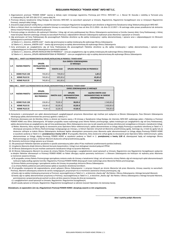 REGULAMIN PROMOCJI "POWER HOME" INFO-NET S.C. 1. Organizatorem promocji "POWER HOME" zwanej w dalszej części niniejszego regulaminu Promocją jest F.P.H.U. INFO-NET s.c. J. Boczar M. Kaszuba z siedzibą w Tarnowie przy ul. Krakowskiej 33, NIP: 873-281-57-57, zwana dalej IN. 2. Promocja dotyczy świadczenia Usług Dostępu do Internetu INFO-NET, na warunkach opisanych w Umowie, Regulaminie, Regulaminie Szczegółowym oraz w niniejszym Regulaminie Promocji, zwanych dalej Usługą. 3. Znaczenie pojęć pisanych wielką literą a niezdefiniowanych w niniejszym Regulaminie Szczegółowym jest określone w Regulaminie Świadczenia Usług Telekomunikacyjnych INFO-NET. 4. Okres w którym klient ma możliwość podpisania Umowy na warunkach Promocji trwa od dnia 25.11.2016 r. do dnia 31.12.2017 r. IN zastrzega sobie prawo przedłużenia lub skrócenia okresu trwania Promocji bez podawania przyczyn. 5. Promocja polega na określeniu dla wybranych Pakietów i Usług ulgi od ceny podstawowej bez Okresu Zobowiązania wymienionej w Cenniku (zwanej dalej: Ceną Podstawową), z której może korzystać Abonent zawierając Umowę na warunkach Promocji z odpowiednim Okresem Zobowiązania wybranym przez Abonenta i zapisanym w Umowie. 6. Ulgi promocyjne od Ceny Podstawowej dla poszczególnych Pakietów określone są dla opłaty instalacyjnej i opłaty abonamentowej, i opisane wraz z odpowiadającymi im Okresami Zobowiązania w poniższych tabelach: a) Tabela nr 1., kolumna „KWOTA ULGI” - kwota ulgi promocyjnej na opłatę instalacyjną dla wybranego Okresu Zobowiązania b) Tabela nr 2., kolumna „KWOTA ULGI” - kwota ulgi promocyjnej na opłatę abonamentową dla wybranego Okresu Zobowiązania 7. Ceny promocyjne po uwzględnieniu ulg od Ceny Podstawowej dla poszczególnych Pakietów określone są dla opłaty instalacyjnej i opłaty abonamentowej, i opisane wraz z odpowiadającymi im Okresami Zobowiązania w poniższych tabelach: a) Tabela nr 1., kolumna „OPŁATA INSTALACYJNA W PROMOCJI” - cena po uwzględnieniu ulgi na opłatę instalacyjną dla wybranego Okresu Zobowiązania b) Tabela nr 2., kolumna „OPŁATA ABONAMENTOWA W PROMOCJI” - cena po uwzględnieniu ulgi na opłatę abonamentową dla wybranego Okresu Zobowiązania TABELA NR 1. - KWOTY ULG PROMOCYJNYCH NA OPŁATĘ INSTALACYJNĄ W PROMOCJI "POWER HOME" L.P. NAZWA PAKIETU OPŁATA INSTALACYJNA BEZ PROMOCJI DLA OKRESU ZOBOWIĄZANIA 22 MIESIĄCE KWOTA ULGI OPŁATA INSTALACYJNA W PROMOCJI 1. HOME PLUS 130 740,00 zł 739,00 zł 1,00 zł 2. HOME PLUS 55 740,00 zł 695,00 zł 45,00 zł 3. HOME PLUS 25 740,00 zł 641,00 zł 99,00 zł TABELA NR 2. - KWOTY ULG PROMOCYJNYCH NA OPŁATĘ ABONAMENTOWĄ W PROMOCJI "POWER HOME" OKRES ZOBOWIĄZANIA 22 MIESIĄCE OPŁATA ABONAMENTOWA KWOTA ULGI BEZ PROMOCJI OPŁATA ABONAMENTOWA W PROMOCJI ŁĄCZNA KWOTA ULGI ABONAMENTOWEJ W OKRESIE ZOBOWIĄZANIA L.P. NAZWA PAKIETU 1. HOME PLUS 130 158,00 zł 70,00 zł 88,00 zł 1 540,00 zł 2. HOME PLUS 55 130,00 zł 65,00 zł 65,00 zł 1 430,00 zł 3. HOME PLUS 25 79,00 zł 32,00 zł 47,00 zł 704,00 zł 8. Korzystanie z promocyjnych cen opłat abonamentowych uwzględniających przyznane Abonentowi ulgi możliwe jest wyłącznie w Okresie Zobowiązania. Poza Okresem Zobowiązania obowiązują opłaty abonamentowe bez promocji zgodnie z tabelą nr 2. 9. Promocja skierowana jest do klientów, którzy w okresie jej trwania zawrą z IN Umowę o Świadczenie Usług Dostępu do Internetu INFO-NET, wybierając jeden z Pakietów w Promocji POWER HOME oraz Okres Zobowiązania. W każdym przypadku nazwa wybranego przez klienta Pakietu promocyjnego, opłata instalacyjna po uwzględnieniu ulgi od Ceny Podstawowej, opłata abonamentowa po uwzględnieniu ulgi od Ceny podstawowej, Okres Zobowiązania oraz czas na jaki zawarta jest Umowa określony jest szczegółowo w Umowie o świadczenie Usługi. a) Wobec Abonenta, który wyraził zgodę na stosowanie przez Operatora faktur elektronicznych, opłata abonamentowa za Usługę objętą Promocją w wysokości określonej w Tabeli nr 2 obowiązuje począwszy od Okresu Rozliczeniowego następującego po miesiącu, w którym Operator otrzymał od Abonenta przedmiotową zgodę. Zastrzega się, iż brak tej zgody lub jej skuteczne cofnięcie w trakcie Okresu Zobowiązania skutkować będzie obowiązkiem ponoszenia przez Abonenta opłat abonamentowych za Usługę objętą Promocją POWER HOME w wysokości podanej w Tabeli nr 2. powiększonej o kwotę 3,00 zł. W przypadku Abonenta, który skutecznie cofnął zgodę na stosowanie przez Operatora faktur elektronicznych, opłaty abonamentowe za Usługę objętą Promocją POWER HOME w wysokości podanej w Tabeli nr 2. powiększonej o kwotę 3,00 zł, obowiązywać będą od następnego Okresu Rozliczeniowego po miesiącu, w którym Abonent skutecznie cofnął przedmiotową zgodę. 10. Parametry techniczne Usługi opisane są w Umowie. 11. Dla powyższych Pakietów Operator przydziela w sposób automatyczny jeden adres IP bez możliwości przekierowania portów (redirect). 12. Urządzenie Abonenta dzięki któremu Abonent korzysta bezpośrednio z Usługi musi obsługiwać standard połączeń PPPoE. 13. W Okresie Zobowiązania nie jest możliwe zawieszenie świadczenia Usługi na życzenie Abonenta. 14. W Okresie Zobowiązania Abonent ma prawo do zmiany Pakietu Promocyjnego z uwzględnieniem zasad opisanych w Umowie, Regulaminie oraz Regulaminie Szczegółowym wyłącznie w obrębie Pakietów oferowanych w Promocji POWER HOME na Pakiet oferujący wyższe parametry techniczne i z Okresem Zobowiązania nie krótszym niż wybrany przez Abonenta w momencie zawarcia Umowy. a) W przypadku zmiany Pakietu Promocyjnego sporządzony zostanie aneks do Umowy o świadczenie Usługi, zaś od momentu zmiany Pakietu ulgi od miesięcznych opłat abonamentowych rozliczane będą według zapisów Cennika i Regulaminu Promocji POWER HOME dotyczących nowo wybranego przez Abonenta Pakietu promocyjnego. b) Zmiana Pak