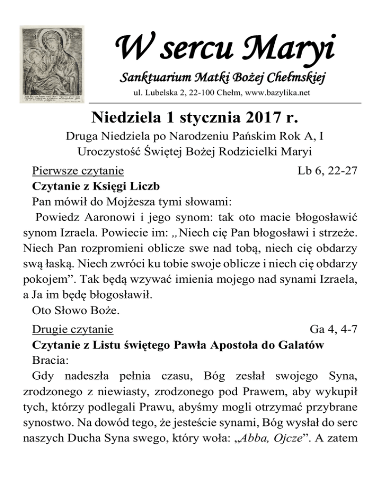 W sercu Maryi Sanktuarium Matki Bożej Chełmskiej ul. Lubelska 2, 22-100 Chełm, www.bazylika.net Niedziela 1 stycznia 2017 r. Druga Niedziela po Narodzeniu Pańskim Rok A, I Uroczystość Świętej Bożej Rodzicielki Maryi Pierwsze czytanie Lb 6, 22-27 Czytanie z Księgi Liczb Pan mówił do Mojżesza tymi słowami: Powiedz Aaronowi i jego synom: tak oto macie błogosławić synom Izraela. Powiecie im: „Niech cię Pan błogosławi i strzeże. Niech Pan rozpromieni oblicze swe nad tobą, niech cię obdarzy swą łaską. Niech zwróci ku tobie swoje oblicze i niech cię obdarzy pokojem”. Tak będą wzywać imienia mojego nad synami Izraela, a Ja im będę błogosławił. Oto Słowo Boże. Drugie czytanie Ga 4, 4-7 Czytanie z Listu świętego Pawła Apostoła do Galatów Bracia: Gdy nadeszła pełnia czasu, Bóg zesłał swojego Syna, zrodzonego z niewiasty, zrodzonego pod Prawem, aby wykupił tych, którzy podlegali Prawu, abyśmy mogli otrzymać przybrane synostwo. Na dowód tego, że jesteście synami, Bóg wysłał do serc naszych Ducha Syna swego, który woła: „Abba, Ojcze”. A zatem nie jesteś już niewolnikiem, lecz synem. Jeżeli zaś synem, to i dziedzicem z woli Bożej. Oto Słowo Boże. Ewangelia Łk 2, 16-21 Słowa Ewangelii według świętego Łukasza Pasterze pospiesznie udali się do Betlejem i znaleźli Maryję, Józefa i Niemowlę, leżące w żłobie. Gdy Je ujrzeli, opowiedzieli o tym, co im zostało objawione o tym Dziecięciu. A wszyscy, którzy to słyszeli, dziwili się temu, co im pasterze opowiadali. Lecz Maryja zachowywała wszystkie te sprawy i rozważała je w swoim sercu. A pasterze wrócili, wielbiąc i wysławiając Boga za wszystko, co słyszeli i widzieli, jak im to było powiedziane. Gdy nadszedł dzień ósmy i należało obrzezać Dziecię, nadano Mu imię Jezus, którym Je nazwał anioł, zanim się poczęło w łonie Matki. Oto słowo Pańskie. Pasterze są pierwszymi świadkami, ale także wysłannikami Nowonarodzonego. Zostaje im powierzona Dobra Nowina o narodzeniu Zbawiciela, Mesjasza, Pana. Tą nowiną, radością będą dzielić się z innymi. Zdziwienie, radość, dziękczynienie, uwielbienie będą rozprzestrzeniać się i „zarażać innych” - cały lud. Zgodnie z maksymą: „Bonum est diffusivum sui”. Właściwością dobra jest to, że samo się rozprzestrzenia. Pasterze byli wierni, dlatego Bóg sam zatroszczył się o nich: „Chwała Pańska zewsząd ich oświeciła”. Słowo „chwała Pańska” oznacza opiekę Boga nad ludźmi, którzy są wierni swojemu powołaniu, swojej misji. Dziś, w pierwszy dzień roku oddajemy cześć Maryi, Bożej Rodzicielce. Maryja chce nam towarzyszyć na ścieżkach nowego roku. Idzie z nami, albo raczej poprzedza nas w naszej wędrówce. Wchodząc w Nowy Rok zabierzmy z sobą ten obraz Bożej Rodzicielki Maryi pochylonej nad Dzieckiem, kontemplującej i rozważającej tajemnicę Słowa - tajemnicę Boga. Niech on towarzyszy naszemu życiu, niech wnosi w nie pokój i nadzieję. Czy czuję, doświadczam, że Jezus narodził się również dla mnie? Na czym polega moje czuwanie? A na czym ospałość? Czy nie „przesypiam” czasu łaski, objawienia Boga? Jakim świadkiem Jezusa jestem dziś? Z jakimi uczuciami wchodzę w Nowy Rok? Co chciałbym w nim zmienić, a co kontynuować? Jakie są moje pragnienia i marzenia? Czego może mi życzyć (i życzy!) Maryja? O czym przypomina? Na co uwrażliwia? Życzenia W Roku, w którym hasłem przewodnim są słowa Pana Jezusa „Idźcie i głoście”, składamy najserdeczniejsze życzenia. Niech Nowonarodzony Jezus, obdarza swoją miłością, przemienia każdą naszą słabość, pokazuje cel wędrówki tu, na ziemi. Niech będzie Panem i Zbawicielem w każdej sferze codziennego życia, a Duch Święty uczy jak podejmować decyzje, aby wypełniać wolę Bożą. Niech w tym Roku nie zabraknie podjęcia stałej formacji we wspólnocie ! Z błogosławieństwem Bożym na każdy dzień Nowego Roku ! Ogłoszenia parafialne 1. Od dzisiejszej niedzieli z inicjatywy Ruchu Światło-Życie rozpoczynamy w naszym sanktuarium wydawanie gazetki pt. W Sercu Maryi, która będzie zawierała czytania na niedzielę z komentarzem oraz ogłoszenia duszpasterskie. Gazetka wyłożona jest na stolikach przy wyjściach z bazyliki. Serdecznie zachęcamy do zabrania. 2. W piątek Uroczystość Objawienia Pańskiego – Trzech Króli. Porządek Mszy św. tak jak w niedzielę. Nie będzie Mszy św. ogodz12.30. Na zakończenie każdej Eucharystii kapłan będzie błogosławił kadzidło i kredę. Zabierzmy ją ze sobą i oznaczmy kredą drzwi naszych domów wypisując imiona Mędrców , a kadzidło spalmy jako wyraz naszej gotowości do oddawania czci Bogu. Jutro mamy obowiązek uczestnictwa w Eucharystii. 3. Również w piątek już po raz siódmy ulicami Chełma przejdzie Orszak Trzech Króli. Rozpocznie się Mszą św. o godz.11 w bazylice. Orszak zakończy się błogosławieństwem przy szopce na Placu Łuczkowskiego. Kolędujmy wszyscy na chwałę i świadectwo dla innych. Dzieci przychodzą na orszak w koronach na głowie, a te które będą przebrane za aniołka lub pastuszka, czeka niespodzianka. 4. W Trzech Króli po Mszy św. o godz. 16.00 w sali różańcowej odbędzie się rejonowe spotkanie opłatkowe Ruchu Światło – Życie. 5. Tego samego dnia po Mszy św. o godz. 18.00rwnież w sali różańcowej odbędzie się spotkanie opłatkowe sympatyków i uczestników Chełmskiej Pielgrzymki Pieszej na Jasna Górę. 6. W tym tygodniu wypadają pierwsze dni miesiąca. W pierwszy czwartek nabożeństwo o godz. 17.30. W pierwszy piątek nie ma odwiedzin chorych w domach. Spowiedź pierwszopiątkowa podczas każdej Mszy św. Nabożeństwo pierwszosobotnie od stycznia będzie miało następujący porządek 7.30 modlitwa różańcowa, 8.00 Msza św., następnie wystawienie Najświętszego Sakramentu i 15 minutowa medytacja nad jedną z tajemnic różańcowych. 7. Na modlitw