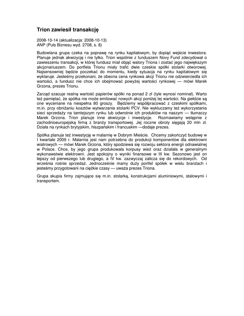Trion zawiesił transakcję 2008-10-14 (aktualizacja: 2008-10-13) ANP (Puls Biznesu wyd. 2708, s. 8) Budowlana grupa czeka na poprawę na rynku kapitałowym, by dopiąć wejście inwestora. Planuje jednak akwizycję i nie tylko. Trion wspólnie z funduszem Novy Fund zdecydował o zawieszeniu transakcji, w której fundusz miał objąć walory Triona i zostać jego największym akcjonariuszem. Do portfela Trionu miały trafić dwie czeskie spółki stolarki otworowej. Najsensowniej będzie poczekać do momentu, kiedy sytuacja na rynku kapitałowym się wyklaruje. Jesteśmy przekonani, że obecna cena rynkowa akcji Trionu nie odzwierciedla ich wartości, a fundusz nie chce ich obejmować powyżej wartości rynkowej — mówi Marek Grzona, prezes Trionu. Zarząd szacuje realną wartość papierów spółki na ponad 2 zł (tyle wynosi nominał). Warto też pamiętać, że spółka nie może emitować nowych akcji poniżej tej wartości. Na giełdzie są one wyceniane na niespełna 80 groszy. Będziemy współpracować z czeskimi spółkami, m.in. przy obniżaniu kosztów wytwarzania stolarki PCV. Nie wykluczamy też wykorzystania sieci sprzedaży na tamtejszym rynku lub odwrotnie ich produktów na naszym — tłumaczy Marek Grzona. Trion planuje inne akwizycje i inwestycje. Rozmawiamy wstępnie z zachodnioeuropejską firmą z branży transportowej. Jej roczne obroty sięgają 20 mln zł. Działa na rynkach brytyjskim, hiszpańskim i francuskim —dodaje prezes. Spółka planuje też inwestycję w malarnię w Dobrym Mieście. Chcemy zakończyć budowę w I kwartale 2009 r. Malarnia jest nam potrzebna do produkcji komponentów dla elektrowni wiatrowych — mówi Marek Grzona, który spodziewa się rozwoju sektora energii odnawialnej w Polsce. Chce, by jego grupa produkowała korpusy wież oraz działała w generalnym wykonawstwie elektrowni. Jest spokojny o wyniki finansowe w III kw. Sezonowo jest on lepszy od pierwszego lub drugiego, a IV kw. zazwyczaj zalicza się do rekordowych. Od września rośnie sprzedaż. Jednocześnie mamy duży portfel spółek w wielu branżach i jesteśmy przygotowani na ciężkie czasy — uważa prezes Triona. Grupa skupia firmy zajmujące się m.in. stolarką, konstrukcjami aluminiowymi, stalowymi i transportem.