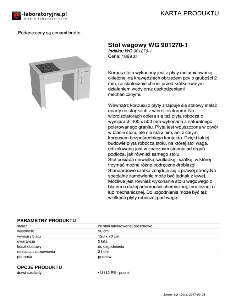 KARTA PRODUKTU Podane ceny są cenami brutto Stół wagowy WG 901270-1 Indeks: WG 901270-1 Cena: 1899 zł Korpus stołu wykonany jest z płyty melaminowanej, oklejonej na krawędziach obrzeżem pcv o grubości 2 mm, co skutecznie chroni przed krótkotrwałym działaniem wody oraz uszkodzeniami mechanicznymi. Wewnątrz korpusu z płyty znajduje się stalowy stelaż oparty na stopkach z wibroizolatorami. Na wibroizolatorach opiera się też płyta robocza o wymiarach 400 x 500 mm wykonana z naturalnego polerowanego granitu. Płyta jest wpuszczona w otwór w blacie stołu, ale nie ma z nim, ani z całym korpusem bezpośredniego kontaktu. Dzięki takiej budowie płyta robocza stołu, na której stoi waga, odizolowana jest w znacznym stopniu od drgań podłoża, jak również samego stołu. Stół posiada niewielką szufladkę i szafkę, w której trzymać można różne podręczne drobiazgi. Standardowo szafka znajduje się z prawej strony.Na specjalne zamówienie może być jednak z lewej. Możliwe jest również wykonanie stołu wagowego z blatem o dużej odporności chemicznej, termicznej i / lub mechanicznej. Do uzgodnienia może być też wielkość płyty roboczej pod wagę. PARAMETRY PRODUKTU stelaż wysokość wymiary blatu gwarancja koszt dostawy realizacja zamówienia płatność ze stali lakierowanej proszkowo 90 cm 120 x 70 cm 2 lata do uzgodnienia 21 dni przelew OPCJE PRODUKTU drzwi-szuflady • U112 PE - popiel Strona 1/2 | Data: 2017-03-08 KARTA PRODUKTU • U125 PE - niebieski • U1301 PE - wanilia • U3113 PE - pomarańczowy Strona 2/2 | Data: 2017-03-08 Powered by TCPDF (www.tcpdf.org)