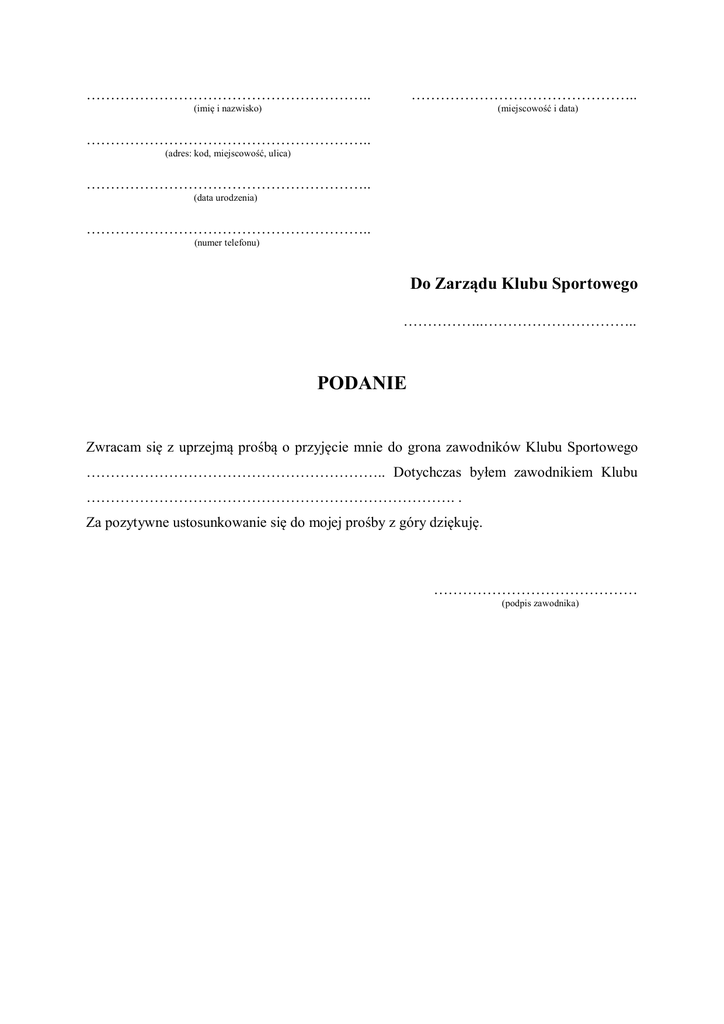 ………………………………………………….. ……………………………………….. (imię i nazwisko) (miejscowość i data) ………………………………………………….. (adres: kod, miejscowość, ulica) ………………………………………………….. (data urodzenia) ………………………………………………….. (numer telefonu) Do Zarządu Klubu Sportowego ……………..………………………….. PODANIE Zwracam się z uprzejmą prośbą o przyjęcie mnie do grona zawodników Klubu Sportowego …………………………………………………….. Dotychczas byłem zawodnikiem Klubu …………………………………………………………………. . Za pozytywne ustosunkowanie się do mojej prośby z góry dziękuję. …………………………………… (podpis zawodnika)