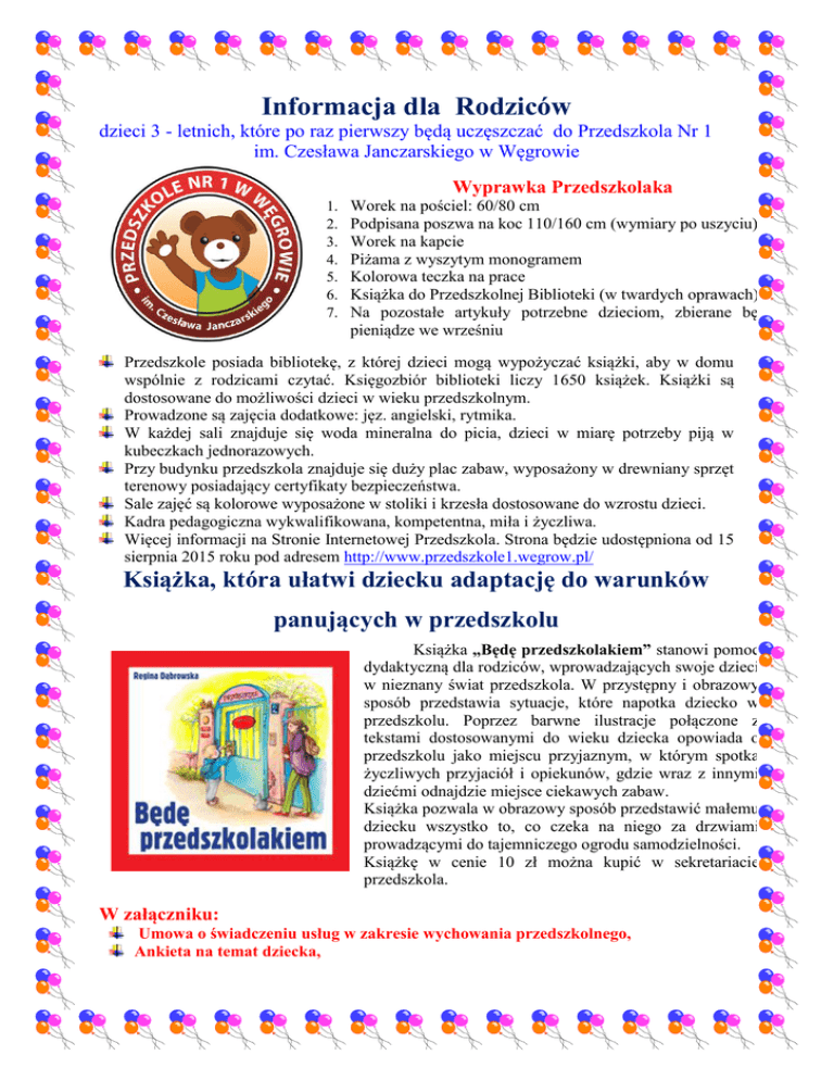 Informacja dla Rodziców dzieci 3 - letnich, które po raz pierwszy będą uczęszczać do Przedszkola Nr 1 im. Czesława Janczarskiego w Węgrowie Wyprawka Przedszkolaka 1. 2. 3. 4. 5. 6. 7. Worek na pościel: 60/80 cm Podpisana poszwa na koc 110/160 cm (wymiary po uszyciu) Worek na kapcie Piżama z wyszytym monogramem Kolorowa teczka na prace Książka do Przedszkolnej Biblioteki (w twardych oprawach) Na pozostałe artykuły potrzebne dzieciom, zbierane będą pieniądze we wrześniu Przedszkole posiada bibliotekę, z której dzieci mogą wypożyczać książki, aby w domu wspólnie z rodzicami czytać. Księgozbiór biblioteki liczy 1650 książek. Książki są dostosowane do możliwości dzieci w wieku przedszkolnym. Prowadzone są zajęcia dodatkowe: jęz. angielski, rytmika. W każdej sali znajduje się woda mineralna do picia, dzieci w miarę potrzeby piją w kubeczkach jednorazowych. Przy budynku przedszkola znajduje się duży plac zabaw, wyposażony w drewniany sprzęt terenowy posiadający certyfikaty bezpieczeństwa. Sale zajęć są kolorowe wyposażone w stoliki i krzesła dostosowane do wzrostu dzieci. Kadra pedagogiczna wykwalifikowana, kompetentna, miła i życzliwa. Więcej informacji na Stronie Internetowej Przedszkola. Strona będzie udostępniona od 15 sierpnia 2015 roku pod adresem http://www.przedszkole1.wegrow.pl/ Książka, która ułatwi dziecku adaptację do warunków panujących w przedszkolu Książka „Będę przedszkolakiem” stanowi pomoc dydaktyczną dla rodziców, wprowadzających swoje dzieci w nieznany świat przedszkola. W przystępny i obrazowy sposób przedstawia sytuacje, które napotka dziecko w przedszkolu. Poprzez barwne ilustracje połączone z tekstami dostosowanymi do wieku dziecka opowiada o przedszkolu jako miejscu przyjaznym, w którym spotka życzliwych przyjaciół i opiekunów, gdzie wraz z innymi dziećmi odnajdzie miejsce ciekawych zabaw. Książka pozwala w obrazowy sposób przedstawić małemu dziecku wszystko to, co czeka na niego za drzwiami prowadzącymi do tajemniczego ogrodu samodzielności. Książkę w cenie 10 zł można kupić w sekretariacie przedszkola. W załączniku: Umowa o świadczeniu usług w zakresie wychowania przedszkolnego, Ankieta na temat dziecka,