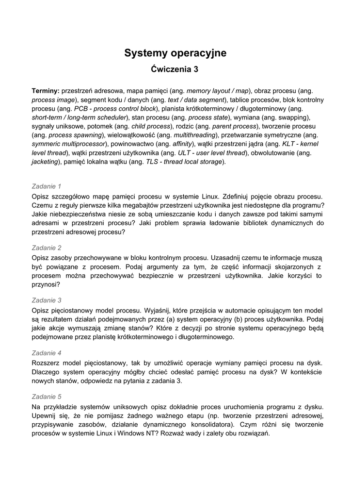 Systemy operacyjne Ćwiczenia 3 Terminy: przestrzeń adresowa, mapa pamięci (ang. memory layout / map), obraz procesu (ang. process image), segment kodu / danych (ang. text / data segment), tablice procesów, blok kontrolny procesu (ang. PCB process control block), planista krótkoterminowy / długoterminowy (ang. shortterm / longterm scheduler), stan procesu (ang. process state), wymiana (ang. swapping), sygnały uniksowe, potomek (ang. child process), rodzic (ang. parent process), tworzenie procesu (ang. process spawning), wielowątkowość (ang. multithreading), przetwarzanie symetryczne (ang. symmeric multiprocessor), powinowactwo (ang. affinity), wątki przestrzeni jądra (ang. KLT kernel level thread), wątki przestrzeni użytkownika (ang. ULT user level thread), obwolutowanie (ang. jacketing), pamięć lokalna wątku (ang. TLS thread local storage). Zadanie 1 Opisz szczegółowo mapę pamięci procesu w systemie Linux. Zdefiniuj pojęcie obrazu procesu. Czemu z reguły pierwsze kilka megabajtów przestrzeni użytkownika jest niedostępne dla programu? Jakie niebezpieczeństwa niesie ze sobą umieszczanie kodu i danych zawsze pod takimi samymi adresami w przestrzeni procesu? Jaki problem sprawia ładowanie bibliotek dynamicznych do przestrzeni adresowej procesu? Zadanie 2 Opisz zasoby przechowywane w bloku kontrolnym procesu. Uzasadnij czemu te informacje muszą być powiązane z procesem. Podaj argumenty za tym, że część informacji skojarzonych z procesem można przechowywać bezpiecznie w przestrzeni użytkownika. Jakie korzyści to przynosi? Zadanie 3 Opisz pięciostanowy model procesu. Wyjaśnij, które przejścia w automacie opisującym ten model są rezultatem działań podejmowanych przez (a) system operacyjny (b) proces użytkownika. Podaj jakie akcje wymuszają zmianę stanów? Które z decyzji po stronie systemu operacyjnego będą podejmowane przez planistę krótkoterminowego i długoterminowego. Zadanie 4 Rozszerz model pięciostanowy, tak by umożliwić operacje wymiany pamięci procesu na dysk. Dlaczego system operacyjny mógłby chcieć odesłać pamięć procesu na dysk? W kontekście nowych stanów, odpowiedz na pytania z zadania 3. Zadanie 5 Na przykładzie systemów uniksowych opisz dokładnie proces uruchomienia programu z dysku. Upewnij się, że nie pomijasz żadnego ważnego etapu (np. tworzenie przestrzeni adresowej, przypisywanie zasobów, działanie dynamicznego konsolidatora). Czym różni się tworzenie procesów w systemie Linux i Windows NT? Rozważ wady i zalety obu rozwiązań. Zadanie 6 Zdefiniuj przełączanie procesów i opisz jak ono przebiega w systemach uniksowych. Wyjaśnij jakie są przyczyny przerywania wykonania procesów i czemu mogą służyć. Sklasyfikuj typy zdarzeń, z powodu których system operacyjny może zakończyć proces. Czy są takie zdarzenia, które normalnie uznaje się za błąd programu, ale potencjalnie mogą być obsłużone przez aplikację lub system operacyjny celem implementacji pewnych funkcji? Jeśli tak, to podaj przykład. Zadanie 7 Rozważmy wątki przestrzeni jądra w systemie Linux. Czemu przełączanie wątków jest operacją szybszą niż przełączanie procesów? Rozważ poprzednie pytanie w kontekście systemów wieloprocesorowych. Zdefiniuj pojęcie powinowactwa wątków i podaj przykład jak taki mechanizm może wspomóc pisanie aplikacji wielowątkowych. Znajdź informacje o lokalnej pamięci wątku i opisz ten mechanizm. Zadanie 8 Opisz różnice między wątkami przestrzeni jądra, a wątkami przestrzeni użytkownika . Podaj zalety KLT. Jakie korzyści lub problemy niesie ze sobą użycie ULT. Jak biblioteka wątków ULT musi skompensować brak wsparcia jądra? Zdefiniuj pojęcie obwolutowania. Rozważ model hybrydowy i pokaż, że może on połączyć zalety obu rozwiązań (tj. KLT i ULT).