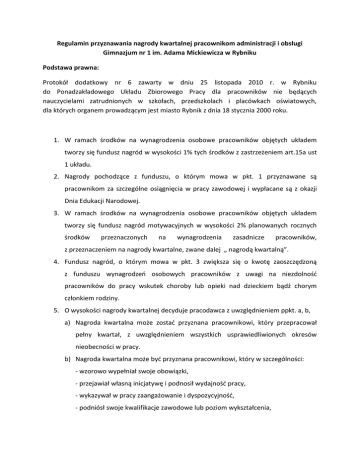 Regulamin przyznawania nagrody kwartalnej pracownikom administracji i obsługi Gimnazjum nr 1 im. Adama Mickiewicza w Rybniku Podstawa prawna: Protokół dodatkowy nr 6 zawarty w dniu 25 listopada 2010 r. w Rybniku do Ponadzakładowego Układu Zbiorowego Pracy dla pracowników nie będących nauczycielami zatrudnionych w szkołach, przedszkolach i placówkach oświatowych, dla których organem prowadzącym jest miasto Rybnik z dnia 18 stycznia 2000 roku. 1. W ramach środków na wynagrodzenia osobowe pracowników objętych układem tworzy się fundusz nagród w wysokości 1% tych środków z zastrzeżeniem art.15a ust 1 układu. 2. Nagrody pochodzące z funduszu, o którym mowa w pkt. 1 przyznawane są pracownikom za szczególne osiągnięcia w pracy zawodowej i wypłacane są z okazji Dnia Edukacji Narodowej. 3. W ramach środków na wynagrodzenia osobowe pracowników objętych układem tworzy się fundusz nagród motywacyjnych w wysokości 2% planowanych rocznych środków przeznaczonych na wynagrodzenia zasadnicze pracowników, z przeznaczeniem na nagrody kwartalne, zwane dalej „ nagrodą kwartalną”. 4. Fundusz nagród, o którym mowa w pkt. 3 zwiększa się o kwotę zaoszczędzoną z funduszu wynagrodzeo osobowych pracowników z uwagi na niezdolnośd pracowników do pracy wskutek choroby lub opieki nad dzieckiem bądź chorym członkiem rodziny. 5. O wysokości nagrody kwartalnej decyduje pracodawca z uwzględnieniem ppkt. a, b, a) Nagroda kwartalna może zostad przyznana pracownikowi, który przepracował pełny kwartał, z uwzględnieniem wszystkich usprawiedliwionych okresów nieobecności w pracy. b) Nagroda kwartalna może byd przyznana pracownikowi, który w szczególności: - wzorowo wypełniał swoje obowiązki, - przejawiał własną inicjatywę i podnosił wydajnośd pracy, - wykazywał w pracy zaangażowanie i dyspozycyjnośd, - podniósł swoje kwalifikacje zawodowe lub poziom wykształcenia, - zastępował osobę niezdolną do pracy wskutek choroby bądź opieki nad dzieckiem lub chorym członkiem rodziny. 6. Wysokośd nagrody kwartalnej uzależniona jest od charakteru wykonywanej pracy, jej złożoności, dobrej organizacji pracy własnej oraz odpowiedzialności ponoszonej na zajmowanym stanowisku. 7. Wypłata nagrody kwartalnej następuje w miesiącu następującym po zakooczeniu kwartału, za który została przyznana, z wyjątkiem nagrody przyznanej pracownikowi za czwarty kwartał, której wypłata następuje do dnia 31 grudnia danego roku. Regulamin wchodzi w życie Zarządzeniem nr 17 Dyrektora z dnia 31.03.2011 r.