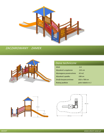 ZACZAROWANY ZAMEK Dane techniczne Wiek 1-6 Wysokość urządzenia 315 cm Wymagana powierzchnia 43 m2 Wysokość upadku 100 cm Strefa bezpieczeństwa 810 x 700 cm Rodzaj podłoża patrz tabela nr.1 Certificato in conformità delle Norme Europee EN 1176 AKANT www.akant.waw.pl